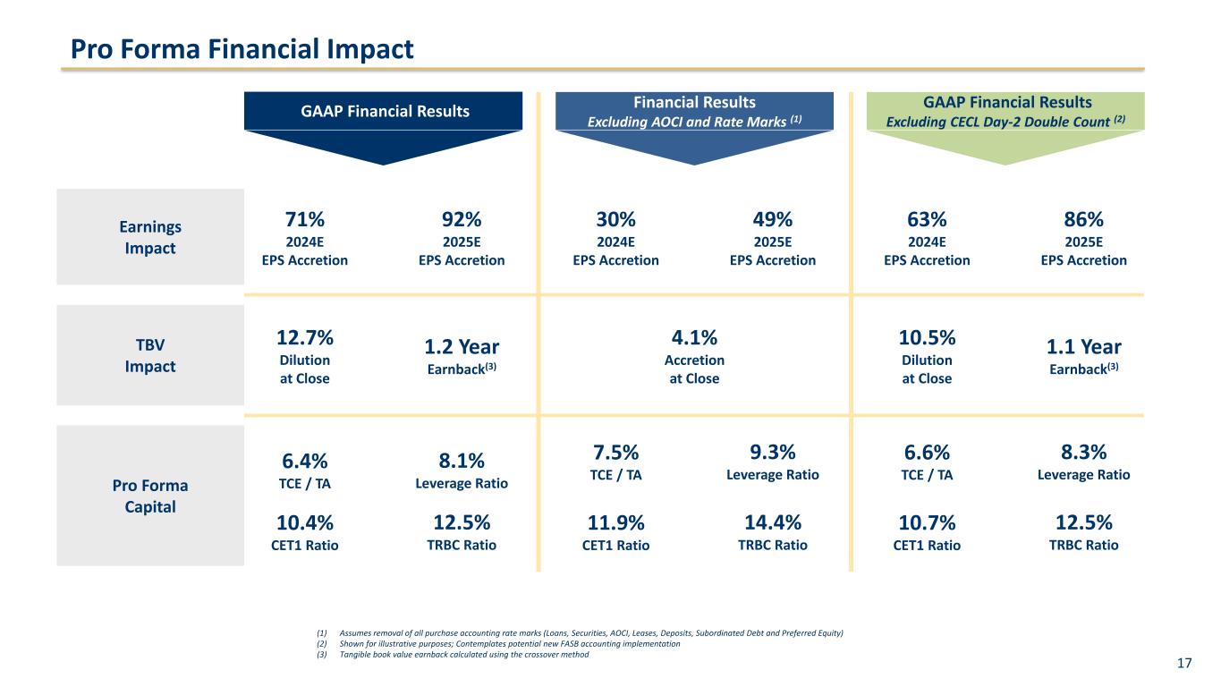 (1) Assumes removal of all purchase accounting rate marks (Loans, Securities, AOCI, Leases, Deposits, Subordinated Debt and Preferred Equity) (2) Shown for illustrative purposes; Contemplates potential new FASB accounting implementation (3) Tangible book value earnback calculated using the crossover method Pro Forma Financial Impact Earnings Impact TBV Impact Pro Forma Capital GAAP Financial Results Financial Results Excluding AOCI and Rate Marks (1) 71% 2024E EPS Accretion 92% 2025E EPS Accretion GAAP Financial Results Excluding CECL Day-2 Double Count (2) 12.7% Dilution at Close 1.2 Year Earnback(3) 6.4% TCE / TA 8.1% Leverage Ratio 10.4% CET1 Ratio 12.5% TRBC Ratio 30% 2024E EPS Accretion 49% 2025E EPS Accretion 4.1% Accretion at Close 7.5% TCE / TA 9.3% Leverage Ratio 11.9% CET1 Ratio 14.4% TRBC Ratio 63% 2024E EPS Accretion 86% 2025E EPS Accretion 10.5% Dilution at Close 1.1 Year Earnback(3) 6.6% TCE / TA 8.3% Leverage Ratio 10.7% CET1 Ratio 12.5% TRBC Ratio 17