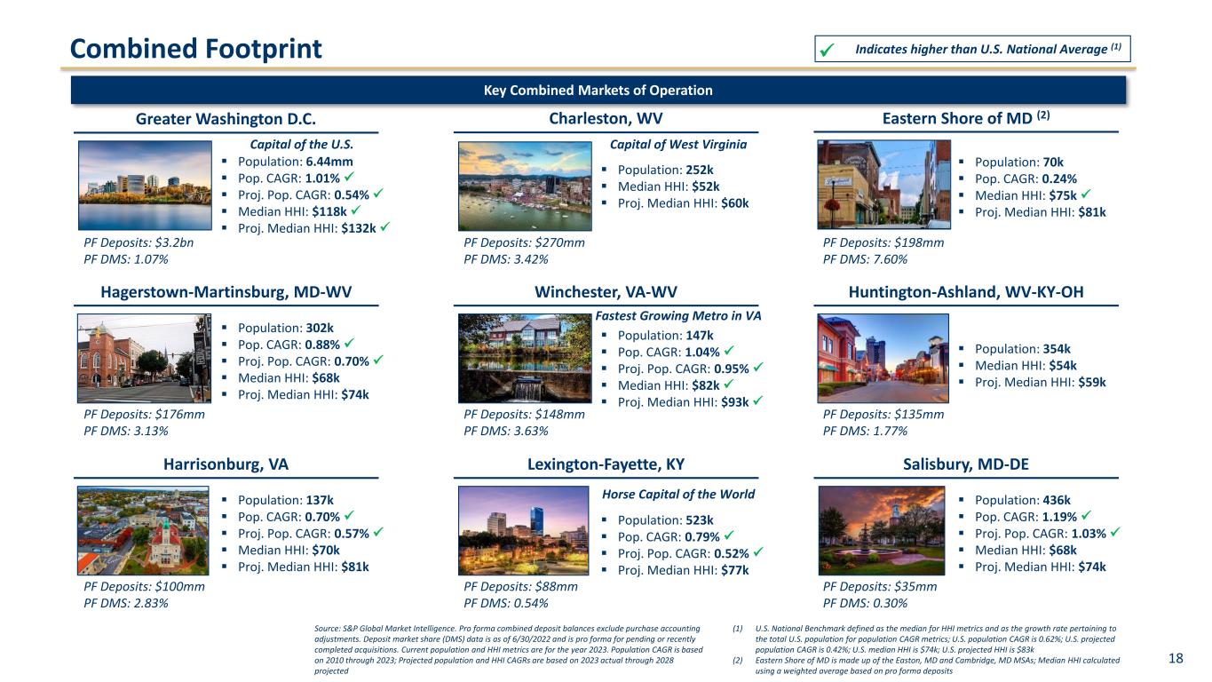  Population: 137k  Pop. CAGR: 0.70%   Proj. Pop. CAGR: 0.57%   Median HHI: $70k  Proj. Median HHI: $81k PF Deposits: $100mm PF DMS: 2.83% Harrisonburg, VA Combined Footprint Key Combined Markets of Operation Eastern Shore of MD (2)  Population: 70k  Pop. CAGR: 0.24%  Median HHI: $75k   Proj. Median HHI: $81k PF Deposits: $198mm PF DMS: 7.60% Charleston, WV  Population: 252k  Median HHI: $52k  Proj. Median HHI: $60k PF Deposits: $270mm PF DMS: 3.42% Source: S&P Global Market Intelligence. Pro forma combined deposit balances exclude purchase accounting adjustments. Deposit market share (DMS) data is as of 6/30/2022 and is pro forma for pending or recently completed acquisitions. Current population and HHI metrics are for the year 2023. Population CAGR is based on 2010 through 2023; Projected population and HHI CAGRs are based on 2023 actual through 2028 projected (1) U.S. National Benchmark defined as the median for HHI metrics and as the growth rate pertaining to the total U.S. population for population CAGR metrics; U.S. population CAGR is 0.62%; U.S. projected population CAGR is 0.42%; U.S. median HHI is $74k; U.S. projected HHI is $83k (2) Eastern Shore of MD is made up of the Easton, MD and Cambridge, MD MSAs; Median HHI calculated using a weighted average based on pro forma deposits Hagerstown-Martinsburg, MD-WV  Population: 302k  Pop. CAGR: 0.88%   Proj. Pop. CAGR: 0.70%   Median HHI: $68k  Proj. Median HHI: $74k PF Deposits: $176mm PF DMS: 3.13% PF Deposits: $3.2bn PF DMS: 1.07%  Population: 6.44mm  Pop. CAGR: 1.01%   Proj. Pop. CAGR: 0.54%   Median HHI: $118k   Proj. Median HHI: $132k  Greater Washington D.C. Indicates higher than U.S. National Average (1)  Lexington-Fayette, KY  Population: 523k  Pop. CAGR: 0.79%   Proj. Pop. CAGR: 0.52%   Proj. Median HHI: $77k PF Deposits: $88mm PF DMS: 0.54%  Population: 147k  Pop. CAGR: 1.04%   Proj. Pop. CAGR: 0.95%   Median HHI: $82k   Proj. Median HHI: $93k  Winchester, VA-WV PF Deposits: $148mm PF DMS: 3.63% Huntington-Ashland, WV-KY-OH  Population: 354k  Median HHI: $54k  Proj. Median HHI: $59k PF Deposits: $135mm PF DMS: 1.77% Salisbury, MD-DE  Population: 436k  Pop. CAGR: 1.19%   Proj. Pop. CAGR: 1.03%   Median HHI: $68k  Proj. Median HHI: $74k PF Deposits: $35mm PF DMS: 0.30% Fastest Growing Metro in VA Horse Capital of the World Capital of the U.S. Capital of West Virginia 18