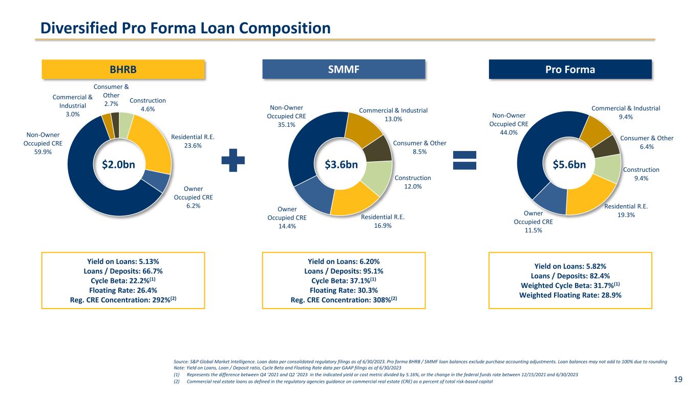 Construction 4.6% Residential R.E. 23.6% Owner Occupied CRE 6.2% Non-Owner Occupied CRE 59.9% Commercial & Industrial 3.0% Consumer & Other 2.7% Source: S&P Global Market Intelligence. Loan data per consolidated regulatory filings as of 6/30/2023. Pro forma BHRB / SMMF loan balances exclude purchase accounting adjustments. Loan balances may not add to 100% due to rounding Note: Yield on Loans, Loan / Deposit ratio, Cycle Beta and Floating Rate data per GAAP filings as of 6/30/2023 (1) Represents the difference between Q4 ’2021 and Q2 ’2023 in the indicated yield or cost metric divided by 5.16%, or the change in the federal funds rate between 12/15/2021 and 6/30/2023 (2) Commercial real estate loans as defined in the regulatory agencies guidance on commercial real estate (CRE) as a percent of total risk-based capital Construction 9.4% Residential R.E. 19.3% Owner Occupied CRE 11.5% Non-Owner Occupied CRE 44.0% Commercial & Industrial 9.4% Consumer & Other 6.4% Construction 12.0% Residential R.E. 16.9% Owner Occupied CRE 14.4% Non-Owner Occupied CRE 35.1% Commercial & Industrial 13.0% Consumer & Other 8.5% Diversified Pro Forma Loan Composition Yield on Loans: 5.13% Loans / Deposits: 66.7% Cycle Beta: 22.2%(1) Floating Rate: 26.4% Reg. CRE Concentration: 292%(2) Yield on Loans: 6.20% Loans / Deposits: 95.1% Cycle Beta: 37.1%(1) Floating Rate: 30.3% Reg. CRE Concentration: 308%(2) Yield on Loans: 5.82% Loans / Deposits: 82.4% Weighted Cycle Beta: 31.7%(1) Weighted Floating Rate: 28.9% $2.0bn $3.6bn $5.6bn BHRB SMMF Pro Forma 19