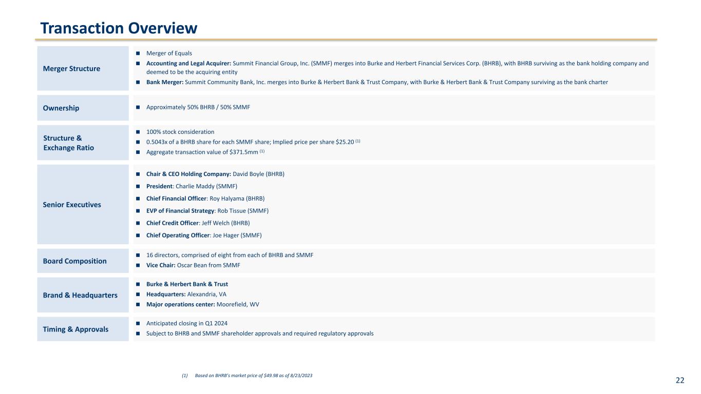 (1) Based on BHRB’s market price of $49.98 as of 8/23/2023 Transaction Overview Merger Structure  Merger of Equals  Accounting and Legal Acquirer: Summit Financial Group, Inc. (SMMF) merges into Burke and Herbert Financial Services Corp. (BHRB), with BHRB surviving as the bank holding company and deemed to be the acquiring entity  Bank Merger: Summit Community Bank, Inc. merges into Burke & Herbert Bank & Trust Company, with Burke & Herbert Bank & Trust Company surviving as the bank charter Ownership  Approximately 50% BHRB / 50% SMMF Structure & Exchange Ratio  100% stock consideration  0.5043x of a BHRB share for each SMMF share; Implied price per share $25.20 (1)  Aggregate transaction value of $371.5mm (1) Senior Executives  Chair & CEO Holding Company: David Boyle (BHRB)  President: Charlie Maddy (SMMF)  Chief Financial Officer: Roy Halyama (BHRB)  EVP of Financial Strategy: Rob Tissue (SMMF)  Chief Credit Officer: Jeff Welch (BHRB)  Chief Operating Officer: Joe Hager (SMMF) Board Composition  16 directors, comprised of eight from each of BHRB and SMMF  Vice Chair: Oscar Bean from SMMF Brand & Headquarters  Burke & Herbert Bank & Trust  Headquarters: Alexandria, VA  Major operations center: Moorefield, WV Timing & Approvals  Anticipated closing in Q1 2024  Subject to BHRB and SMMF shareholder approvals and required regulatory approvals 22