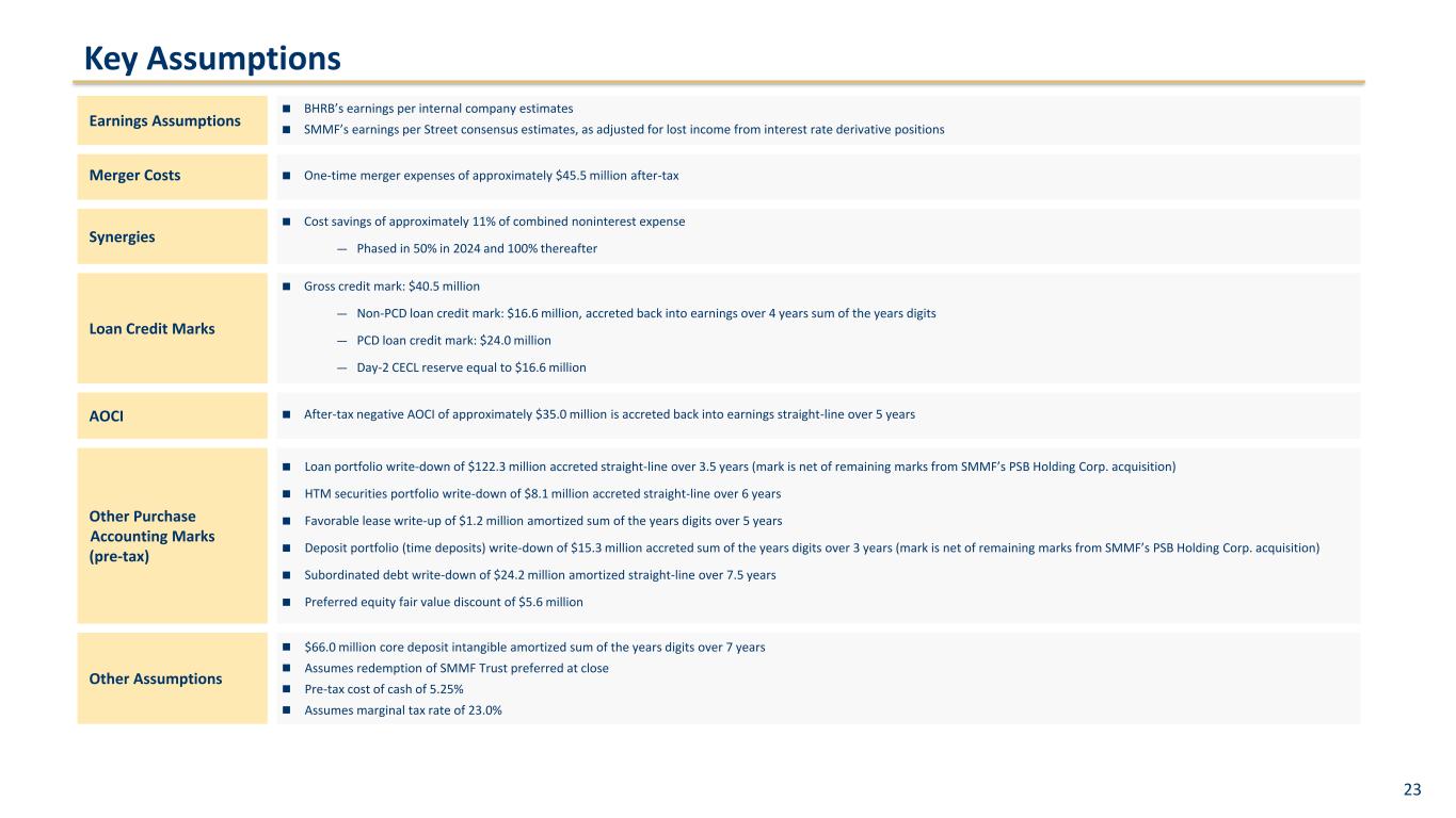 Pro Forma Net Income Reconciliation Pro Forma Earnings Reconciliation Earnings Buildup ($mm) 2024E Dollars in millions, except per share data Pro Forma Combined Net Income to Common (1) 86.2 After - Tax Transaction Adjustments Cost Savings - Fully Realized 14.6 Opportunity Cost of Cash (1.8) Benefit of Trust Preferred Redemption (2) 0.4 Accretion of HTM Interest Rate Mark and AOCI 8.1 Accretion of Other Interest Rate Marks 18.2 Accretion of Non-PCD Credit Mark 5.1 Core Deposit Amortization from Transaction (12.7) Pro Forma Net Income to Common 118.1$ Pro Forma Average Diluted Shares 14.9 Price / PF EPS Pro Forma EPS - Incl. Rate Accretion $7.90 6.3x (3) $86.2 $21.3 $23.3 ($12.7) $118.1 Combined Net Income to Common Cost Savings, Securities Related Accretion & BS Repositioning Other Accretion & Rate Mark Related Adjustments CDI Impacts Pro Forma Net Income (4) Source: S&P Global Market Intelligence, FactSet Research Systems (1) Based on internal company estimates for BHRB and consensus 2024 estimates for SMMF, as adjusted for loss of income from interest rate derivative positions (2) Assumes redemption of SMMF’s $19.6mm Trust Preferred at close (3) Based on BHRB’s market price of $49.98 as of 8/23/2023 (4) Includes cost savings, opportunity cost of cash, benefit of trust preferred redemption and accretion of HTM securities interest rate mark and AOCI (5) Includes accretion of interest rate marks on loans, leases, time deposits and subordinated debt and non-PCD credit mark (5) 21