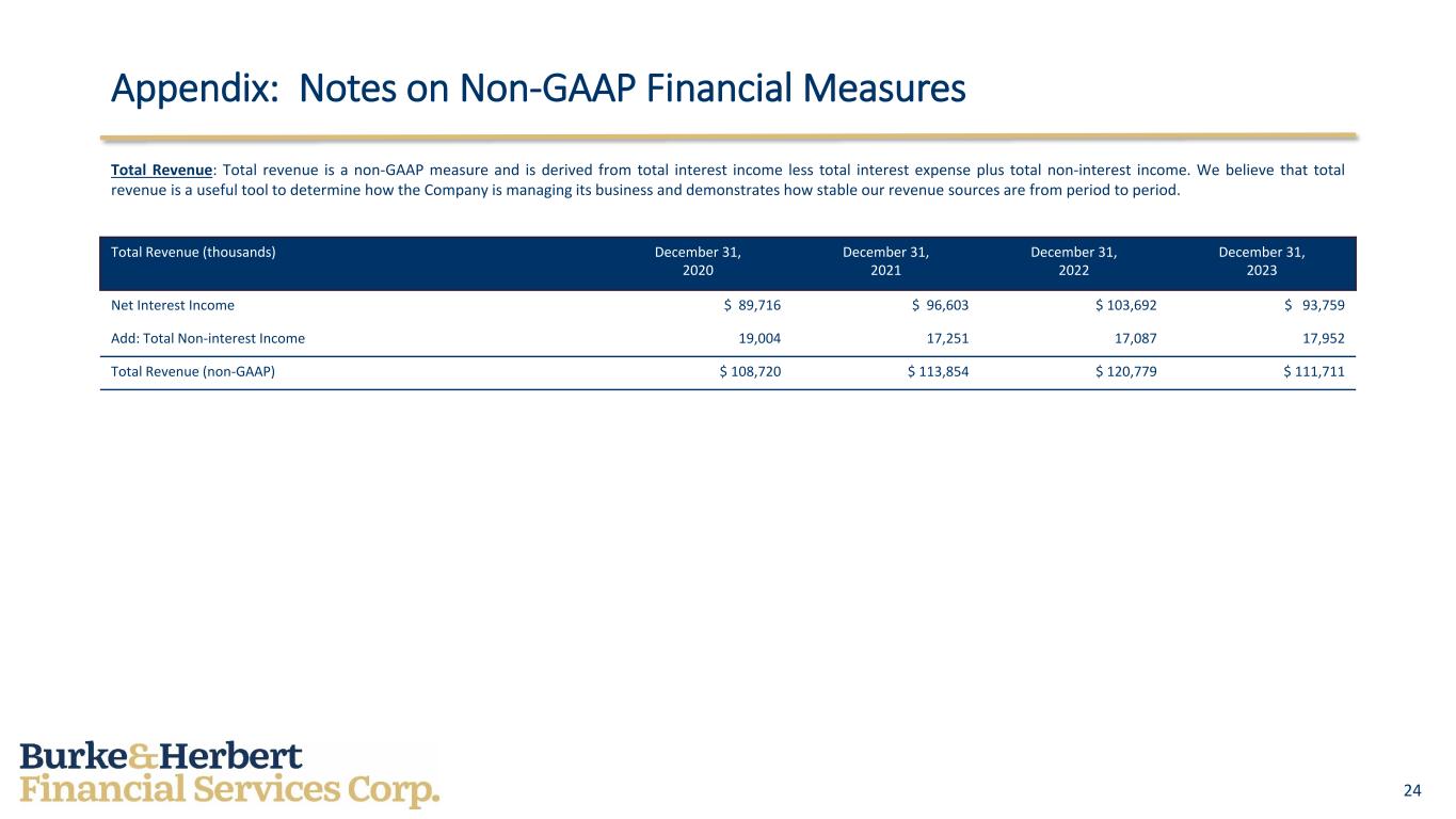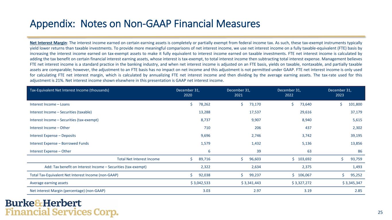 24 Appendix: Notes on Non-GAAP Financial Measures Total Revenue: Total revenue is a non-GAAP measure and is derived from total interest income less total interest expense plus total non-interest income. We believe that total revenue is a useful tool to determine how the Company is managing its business and demonstrates how stable our revenue sources are from period to period. Total Revenue (thousands) December 31, 2020 December 31, 2021 December 31, 2022 December 31, 2023 Net Interest Income $ 89,716 $ 96,603 $ 103,692 $ 93,759 Add: Total Non-interest Income 19,004 17,251 17,087 17,952 Total Revenue (non-GAAP) $ 108,720 $ 113,854 $ 120,779 $ 111,711