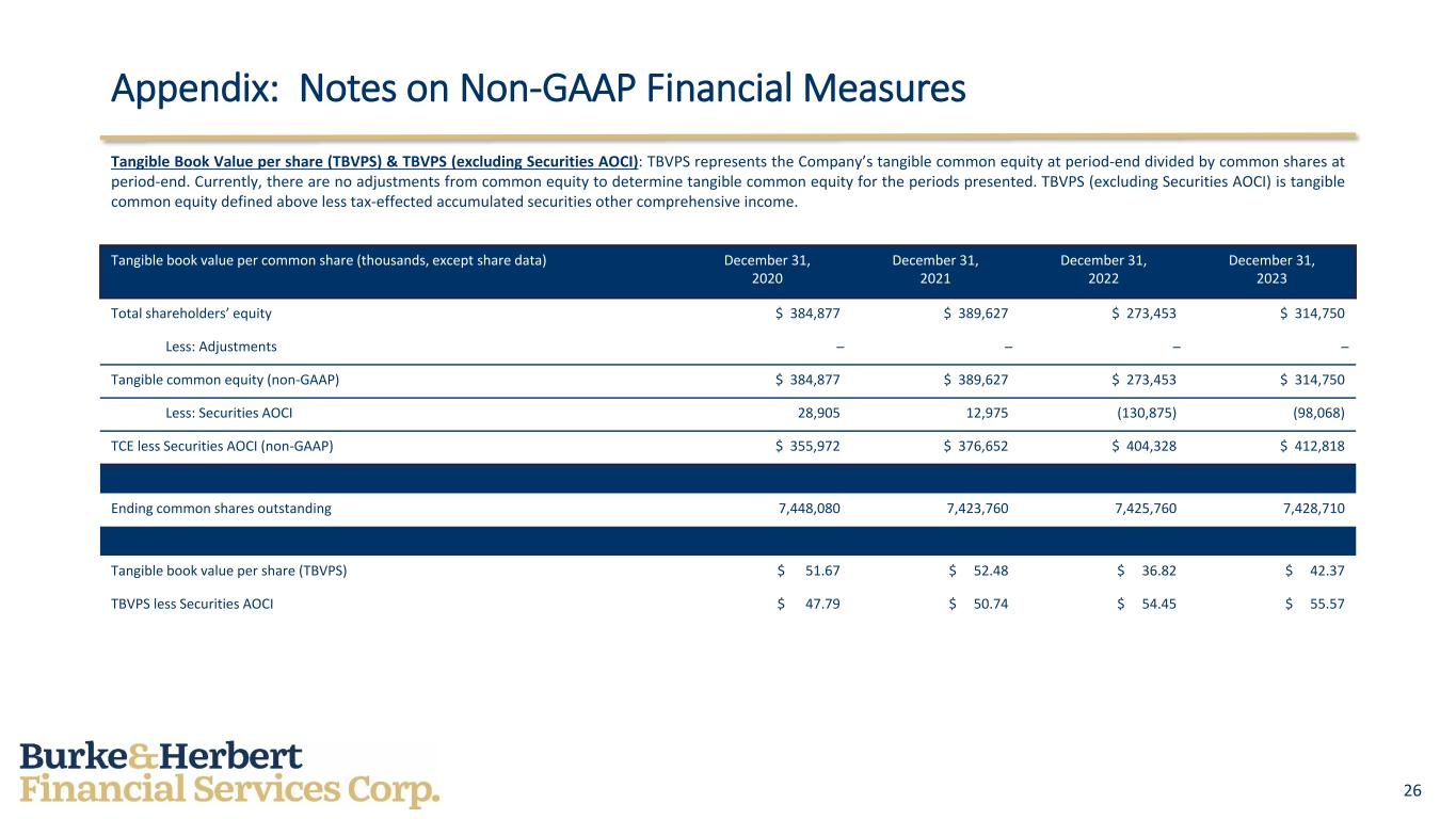 25 Appendix: Notes on Non-GAAP Financial Measures Net Interest Margin: The interest income earned on certain earning assets is completely or partially exempt from federal income tax. As such, these tax-exempt instruments typically yield lower returns than taxable investments. To provide more meaningful comparisons of net interest income, we use net interest income on a fully taxable-equivalent (FTE) basis by increasing the interest income earned on tax-exempt assets to make it fully equivalent to interest income earned on taxable investments. FTE net interest income is calculated by adding the tax benefit on certain financial interest earning assets, whose interest is tax-exempt, to total interest income then subtracting total interest expense. Management believes FTE net interest income is a standard practice in the banking industry, and when net interest income is adjusted on an FTE basis, yields on taxable, nontaxable, and partially taxable assets are comparable; however, the adjustment to an FTE basis has no impact on net income and this adjustment is not permitted under GAAP. FTE net interest income is only used for calculating FTE net interest margin, which is calculated by annualizing FTE net interest income and then dividing by the average earning assets. The tax-rate used for this adjustment is 21%. Net interest income shown elsewhere in this presentation is GAAP net interest income. Tax-Equivalent Net Interest Income (thousands) December 31, 2020 December 31, 2021 December 31, 2022 December 31, 2023 Interest Income – Loans $ 78,262 $ 73,170 $ 73,640 $ 101,800 Interest Income – Securities (taxable) 13,288 17,537 29,616 37,179 Interest Income – Securities (tax-exempt) 8,737 9,907 8,940 5,615 Interest Income – Other 710 206 437 2,302 Interest Expense – Deposits 9,696 2,746 3,742 39,195 Interest Expense – Borrowed Funds 1,579 1,432 5,136 13,856 Interest Expense – Other 6 39 63 86 Total Net Interest Income $ 89,716 $ 96,603 $ 103,692 $ 93,759 Add: Tax benefit on Interest Income – Securities (tax-exempt) 2,322 2,634 2,375 1,493 Total Tax-Equivalent Net Interest Income (non-GAAP) $ 92,038 $ 99,237 $ 106,067 $ 95,252 Average earning assets $ 3,042,533 $ 3,341,443 $ 3,327,272 $ 3,345,347 Net interest Margin (percentage) (non-GAAP) 3.03 2.97 3.19 2.85