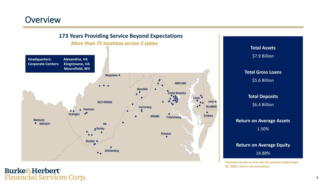 3 Introduction • Thank you for your interest in Burke & Herbert Financial Services Corp., and its wholly owned subsidiary Burke & Herbert Bank & Trust Company. As a community banking institution, we are headquartered in Old Town Alexandria, Virginia, and have served the banking, borrowing and investing needs of businesses, organizations, families, and individuals since 1852. • As a true community bank, we are deeply tied to the people, neighborhoods, and institutions where we live and work. Our employees form a diverse, dedicated, close-knit team that upholds a culture of customer service and forges strong and lasting relationships with our customers and shared communities. We are selective in our hiring, proud of the caliber of our people, and encourage a collegial environment in which each individual feels valued. • We strive to be your quintessential community bank that delivers extraordinary experiences and top-quartile results, while staying true to our values and remaining focused on what we can control.