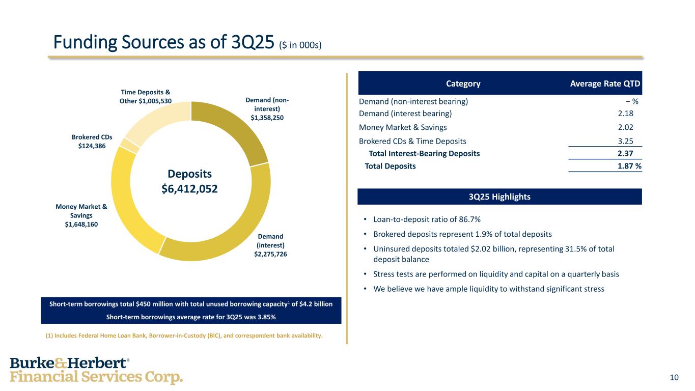 9 Security Portfolio as of 3Q25 ($ in 000s) U.S Treasury & Agency $154,234 Municipal $876,973 Agency RMBS $55,475 Non-Agency RMBS $225,870 Agency CMBS $75,658 Non-Agency CMBS $130,082 Asset-Backed $53,966 Other $26,149 AFS Portfolio FV $1,598,407 Unrealized losses (net of taxes) impacts book value by $4.28 per common share Category Net Unrealized Losses Amortized Cost WA Yield U.S. Treasury & Agency $ 10,240 $ 164,474 1.31% Municipal 62,408 939,381 3.09% Agency RMBS 2,597 58,072 3.60% Non-Agency RMBS 4,830 230,700 4.26% Agency CMBS 668 76,326 5.13% Non-Agency CMBS 1,416 131,498 4.35% Asset-Backed 491 54,457 5.49% Other 969 27,118 7.42% $ 83,619 $ 1,682,026 3.44% 3Q25 Highlights • Portfolio duration is approximately 4.55 years • 75% of unrealized losses have a duration of approximately 6 years; remainder less than 2.6 years • Unrealized losses are the result of the interest rate environment • AOCI accretion is expected to be approximately 5.5% per quarter assuming a stagnant interest rate environment • The current portfolio is held as available-for-sale, and there is no intent to reclassify any part • Majority of non-agency CMBS and ABS are equity enhanced through structure and credit support