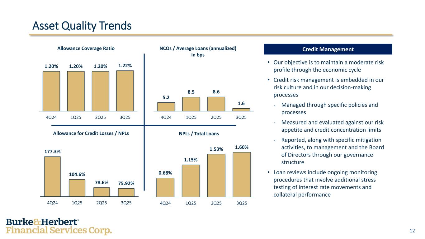 11 12.0% 12.2% 12.6% 13.2% 4Q24 1Q25 2Q25 3Q25 Tier 1 Capital Ratio Capital Ratio Trends1 11.5% 11.8% 12.2% 12.7% 4Q24 1Q25 2Q25 3Q25 Common Equity Tier 1 Ratio 14.6% 14.8% 15.3% 15.4% 4Q24 1Q25 2Q25 3Q25 Total Capital Ratio 9.8% 10.1% 10.4% 10.7% 4Q24 1Q25 2Q25 3Q25 Leverage Ratio Capital Management • We take a forward-looking, disciplined approach to capital management that emphasizes acceptable risk-adjusted returns over the long-term • Our capital management priorities include - Supporting customers - Funding business investments - Maintaining appropriate capital in light of economic conditions and regulatory expectations - Returning excess capital to shareholders • Modeled stress scenarios include evaluating the impact of deposit shocks, interest rate scenarios, and general balance sheet repositioning • Stress scenarios result in capital levels well above well-capitalized levels (1) All 3Q25 capital ratios are estimated. The Company redeemed $30 million of subordinated debt on September 30, 2025.