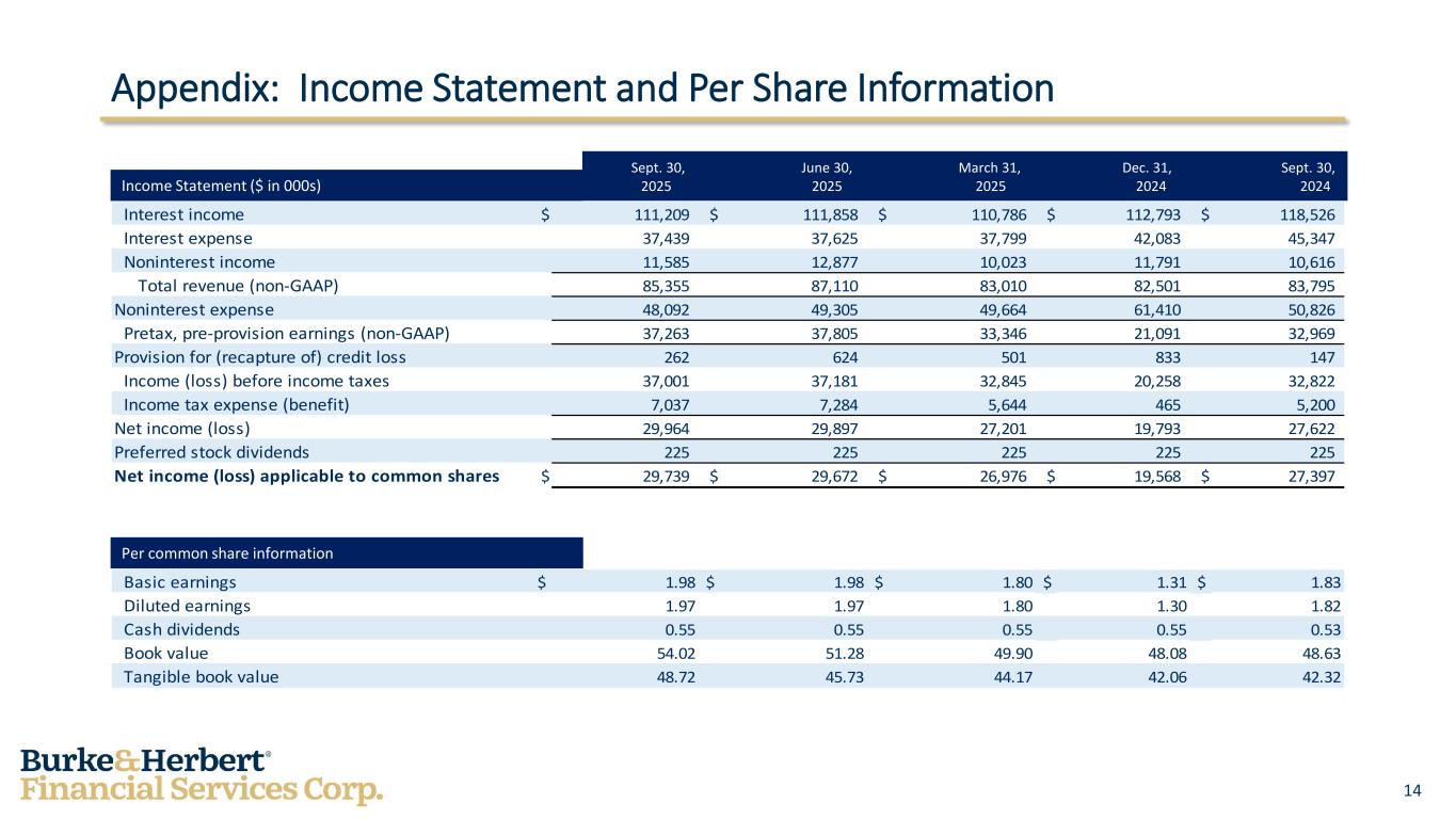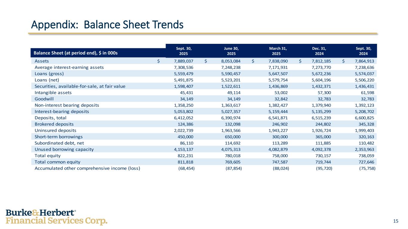 14 Appendix: Income Statement and Per Share Information Income Statement ($ in 000s) Sept. 30, June 30, March 31, Dec. 31, Sept. 30, 2025 2025 2025 2024 2024 Per common share information Interest income $ 111,209 $ 111,858 $ 110,786 $ 112,793 $ 118,526 Interest expense 37,439 37,625 37,799 42,083 45,347 Noninterest income 11,585 12,877 10,023 11,791 10,616 Total revenue (non-GAAP) 85,355 87,110 83,010 82,501 83,795 Noninterest expense 48,092 49,305 49,664 61,410 50,826 Pretax, pre-provision earnings (non-GAAP) 37,263 37,805 33,346 21,091 32,969 Provision for (recapture of) credit loss 262 624 501 833 147 Income (loss) before income taxes 37,001 37,181 32,845 20,258 32,822 Income tax expense (benefit) 7,037 7,284 5,644 465 5,200 Net income (loss) 29,964 29,897 27,201 19,793 27,622 Preferred stock dividends 225 225 225 225 225 Net income (loss) applicable to common shares $ 29,739 $ 29,672 $ 26,976 $ 19,568 $ 27,397 Basic earnings $ 1.98 $ 1.98 $ 1.80 $ 1.31 $ 1.83 Diluted earnings 1.97 1.97 1.80 1.30 1.82 Cash dividends 0.55 0.55 0.55 0.55 0.53 Book value 54.02 51.28 49.90 48.08 48.63 Tangible book value 48.72 45.73 44.17 42.06 42.32