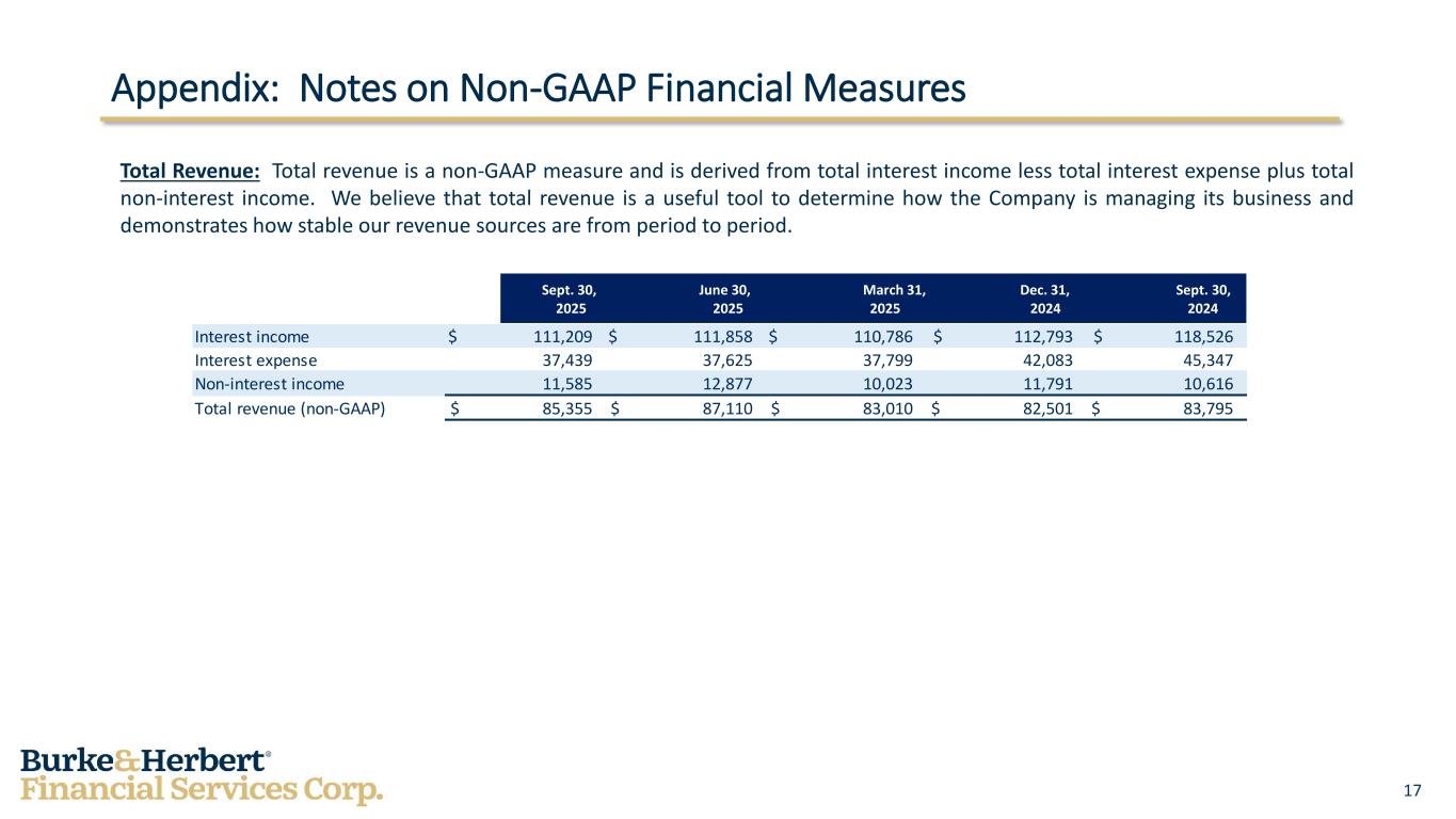 16 Appendix: Notes on Non-GAAP Financial Measures Total Common Equity, Tangible Book Value & Tangible Assets: Tangible common equity measures are capital adequacy metrics that may be meaningful to the Company, as well as analysts and investors, in assessing the Company's use of equity and in facilitating comparisons with peers. These non-GAAP measures are valuable indicators of a financial institution's capital strength since they eliminate intangible assets from stockholders' equity and retain the effect of accumulated other comprehensive income/(loss) in stockholders' equity. Sept. 30, June 30, March 31, Dec. 31, Sept. 30, 2025 2025 2025 2024 2024 Common Shareholders’ Equity $ 811,818 $ 769,605 $ 747,587 $ 719,744 $ 727,646 Less: Goodwill and intangible assets, net 79,580 83,263 85,844 90,083 94,381 Tangible common equity (non- GAAP) 732,238 686,342 661,743 629,661 633,265 Shares outstanding at end of period 15,028,524 15,007,712 14,982,807 14,969,104 14,963,003 Tangible book value per common share $ 48.72 $ 45.73 $ 44.17 $ 42.06 $ 42.32 Total Assets 7,889,037 8,053,084 7,838,090 7,812,185 7,864,913 Less: Goodwill and Intangible assets, net 79,580 83,263 85,844 90,083 94,381 Tangible assets (non-GAAP) $ 7,809,457 $ 7,969,821 $ 7,752,246 $ 7,722,102 $ 7,770,532