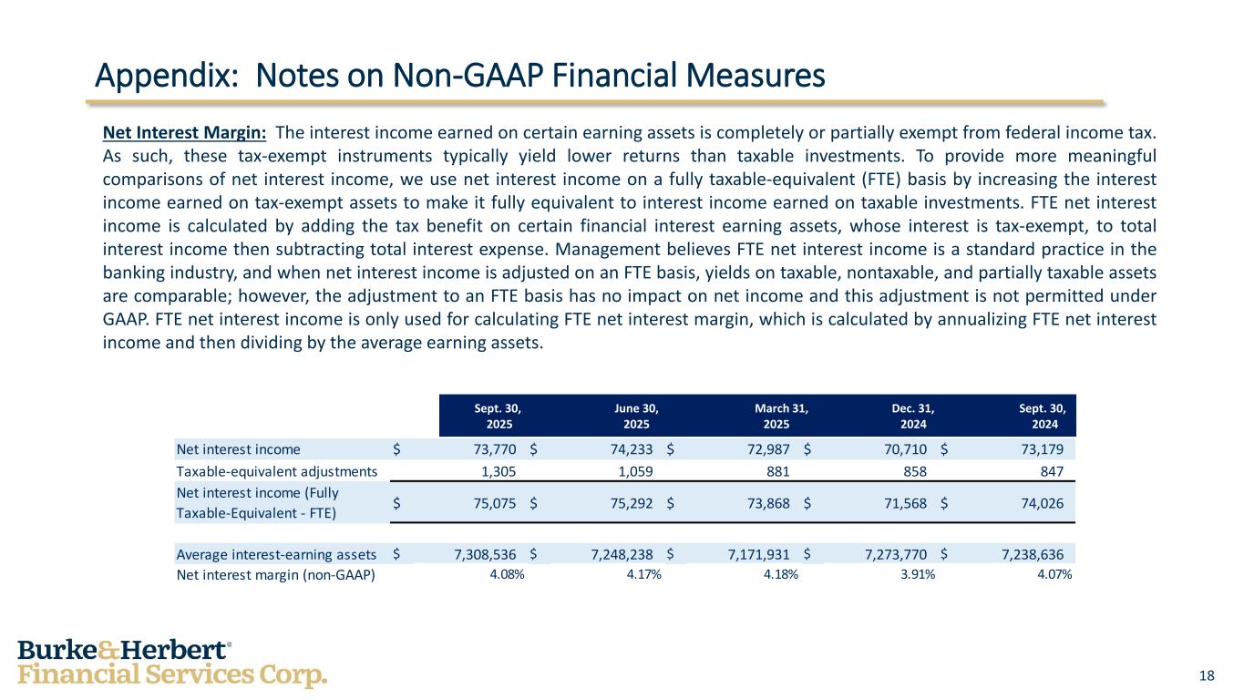 18 Appendix: Notes on Non-GAAP Financial Measures Net Interest Margin: The interest income earned on certain earning assets is completely or partially exempt from federal income tax. As such, these tax-exempt instruments typically yield lower returns than taxable investments. To provide more meaningful comparisons of net interest income, we use net interest income on a fully taxable-equivalent (FTE) basis by increasing the interest income earned on tax-exempt assets to make it fully equivalent to interest income earned on taxable investments. FTE net interest income is calculated by adding the tax benefit on certain financial interest earning assets, whose interest is tax-exempt, to total interest income then subtracting total interest expense. Management believes FTE net interest income is a standard practice in the banking industry, and when net interest income is adjusted on an FTE basis, yields on taxable, nontaxable, and partially taxable assets are comparable; however, the adjustment to an FTE basis has no impact on net income and this adjustment is not permitted under GAAP. FTE net interest income is only used for calculating FTE net interest margin, which is calculated by annualizing FTE net interest income and then dividing by the average earning assets. Sept. 30, June 30, March 31, Dec. 31, Sept. 30, 2025 2025 2025 2024 2024 Net interest income $ 73,770 $ 74,233 $ 72,987 $ 70,710 $ 73,179 Taxable-equivalent adjustments 1,305 1,059 881 858 847 Net interest income (Fully Taxable-Equivalent - FTE) $ 75,075 $ 75,292 $ 73,868 $ 71,568 $ 74,026 Average interest-earning assets $ 7,308,536 $ 7,248,238 $ 7,171,931 $ 7,273,770 $ 7,238,636 Net interest margin (non-GAAP) 4.08% 4.17% 4.18% 3.91% 4.07%