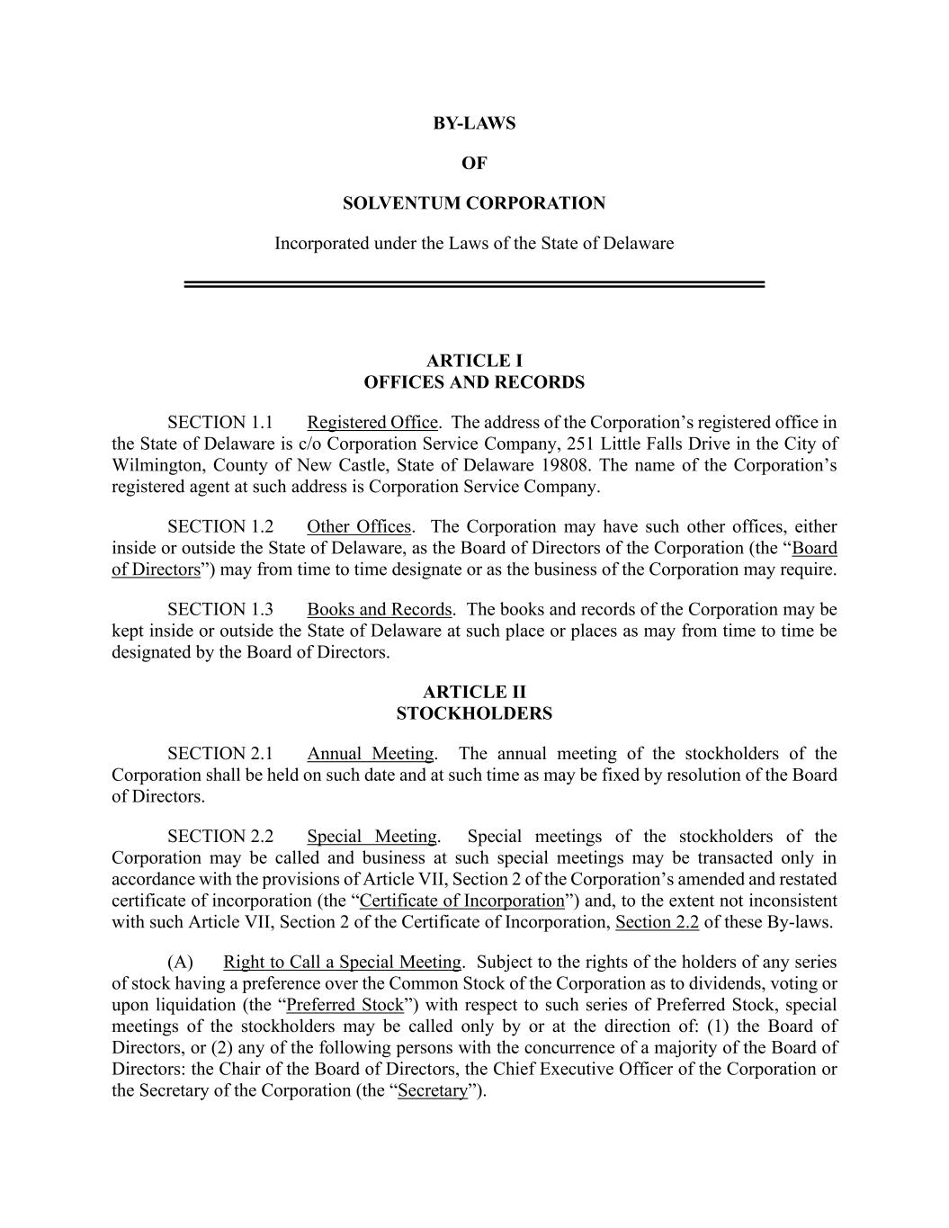 BY-LAWS OF SOLVENTUM CORPORATION Incorporated under the Laws of the State of Delaware ARTICLE I OFFICES AND RECORDS SECTION 1.1 Registered Office. The address of the Corporation’s registered office in the State of Delaware is c/o Corporation Service Company, 251 Little Falls Drive in the City of Wilmington, County of New Castle, State of Delaware 19808. The name of the Corporation’s registered agent at such address is Corporation Service Company. SECTION 1.2 Other Offices. The Corporation may have such other offices, either inside or outside the State of Delaware, as the Board of Directors of the Corporation (the “Board of Directors”) may from time to time designate or as the business of the Corporation may require. SECTION 1.3 Books and Records. The books and records of the Corporation may be kept inside or outside the State of Delaware at such place or places as may from time to time be designated by the Board of Directors. ARTICLE II STOCKHOLDERS SECTION 2.1 Annual Meeting. The annual meeting of the stockholders of the Corporation shall be held on such date and at such time as may be fixed by resolution of the Board of Directors. SECTION 2.2 Special Meeting. Special meetings of the stockholders of the Corporation may be called and business at such special meetings may be transacted only in accordance with the provisions of Article VII, Section 2 of the Corporation’s amended and restated certificate of incorporation (the “Certificate of Incorporation”) and, to the extent not inconsistent with such Article VII, Section 2 of the Certificate of Incorporation, Section 2.2 of these By-laws. (A) Right to Call a Special Meeting. Subject to the rights of the holders of any series of stock having a preference over the Common Stock of the Corporation as to dividends, voting or upon liquidation (the “Preferred Stock”) with respect to such series of Preferred Stock, special meetings of the stockholders may be called only by or at the direction of: (1) the Board of Directors, or (2) any of the following persons with the concurrence of a majority of the Board of Directors: the Chair of the Board of Directors, the Chief Executive Officer of the Corporation or the Secretary of the Corporation (the “Secretary”).