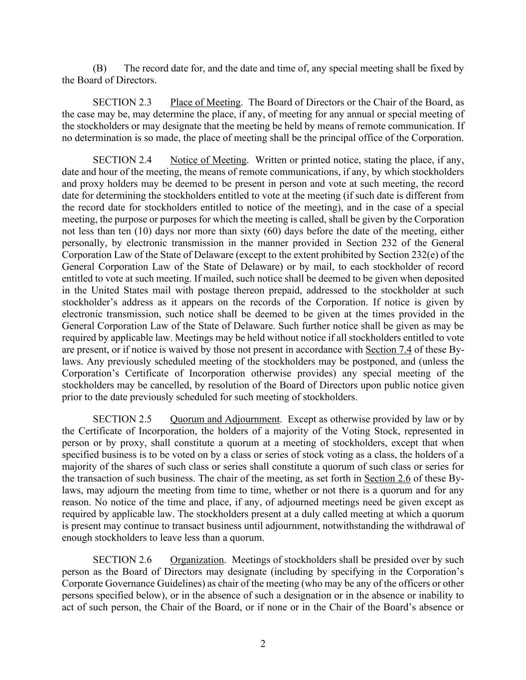2 (B) The record date for, and the date and time of, any special meeting shall be fixed by the Board of Directors. SECTION 2.3 Place of Meeting. The Board of Directors or the Chair of the Board, as the case may be, may determine the place, if any, of meeting for any annual or special meeting of the stockholders or may designate that the meeting be held by means of remote communication. If no determination is so made, the place of meeting shall be the principal office of the Corporation. SECTION 2.4 Notice of Meeting. Written or printed notice, stating the place, if any, date and hour of the meeting, the means of remote communications, if any, by which stockholders and proxy holders may be deemed to be present in person and vote at such meeting, the record date for determining the stockholders entitled to vote at the meeting (if such date is different from the record date for stockholders entitled to notice of the meeting), and in the case of a special meeting, the purpose or purposes for which the meeting is called, shall be given by the Corporation not less than ten (10) days nor more than sixty (60) days before the date of the meeting, either personally, by electronic transmission in the manner provided in Section 232 of the General Corporation Law of the State of Delaware (except to the extent prohibited by Section 232(e) of the General Corporation Law of the State of Delaware) or by mail, to each stockholder of record entitled to vote at such meeting. If mailed, such notice shall be deemed to be given when deposited in the United States mail with postage thereon prepaid, addressed to the stockholder at such stockholder’s address as it appears on the records of the Corporation. If notice is given by electronic transmission, such notice shall be deemed to be given at the times provided in the General Corporation Law of the State of Delaware. Such further notice shall be given as may be required by applicable law. Meetings may be held without notice if all stockholders entitled to vote are present, or if notice is waived by those not present in accordance with Section 7.4 of these By- laws. Any previously scheduled meeting of the stockholders may be postponed, and (unless the Corporation’s Certificate of Incorporation otherwise provides) any special meeting of the stockholders may be cancelled, by resolution of the Board of Directors upon public notice given prior to the date previously scheduled for such meeting of stockholders. SECTION 2.5 Quorum and Adjournment. Except as otherwise provided by law or by the Certificate of Incorporation, the holders of a majority of the Voting Stock, represented in person or by proxy, shall constitute a quorum at a meeting of stockholders, except that when specified business is to be voted on by a class or series of stock voting as a class, the holders of a majority of the shares of such class or series shall constitute a quorum of such class or series for the transaction of such business. The chair of the meeting, as set forth in Section 2.6 of these By- laws, may adjourn the meeting from time to time, whether or not there is a quorum and for any reason. No notice of the time and place, if any, of adjourned meetings need be given except as required by applicable law. The stockholders present at a duly called meeting at which a quorum is present may continue to transact business until adjournment, notwithstanding the withdrawal of enough stockholders to leave less than a quorum. SECTION 2.6 Organization. Meetings of stockholders shall be presided over by such person as the Board of Directors may designate (including by specifying in the Corporation’s Corporate Governance Guidelines) as chair of the meeting (who may be any of the officers or other persons specified below), or in the absence of such a designation or in the absence or inability to act of such person, the Chair of the Board, or if none or in the Chair of the Board’s absence or