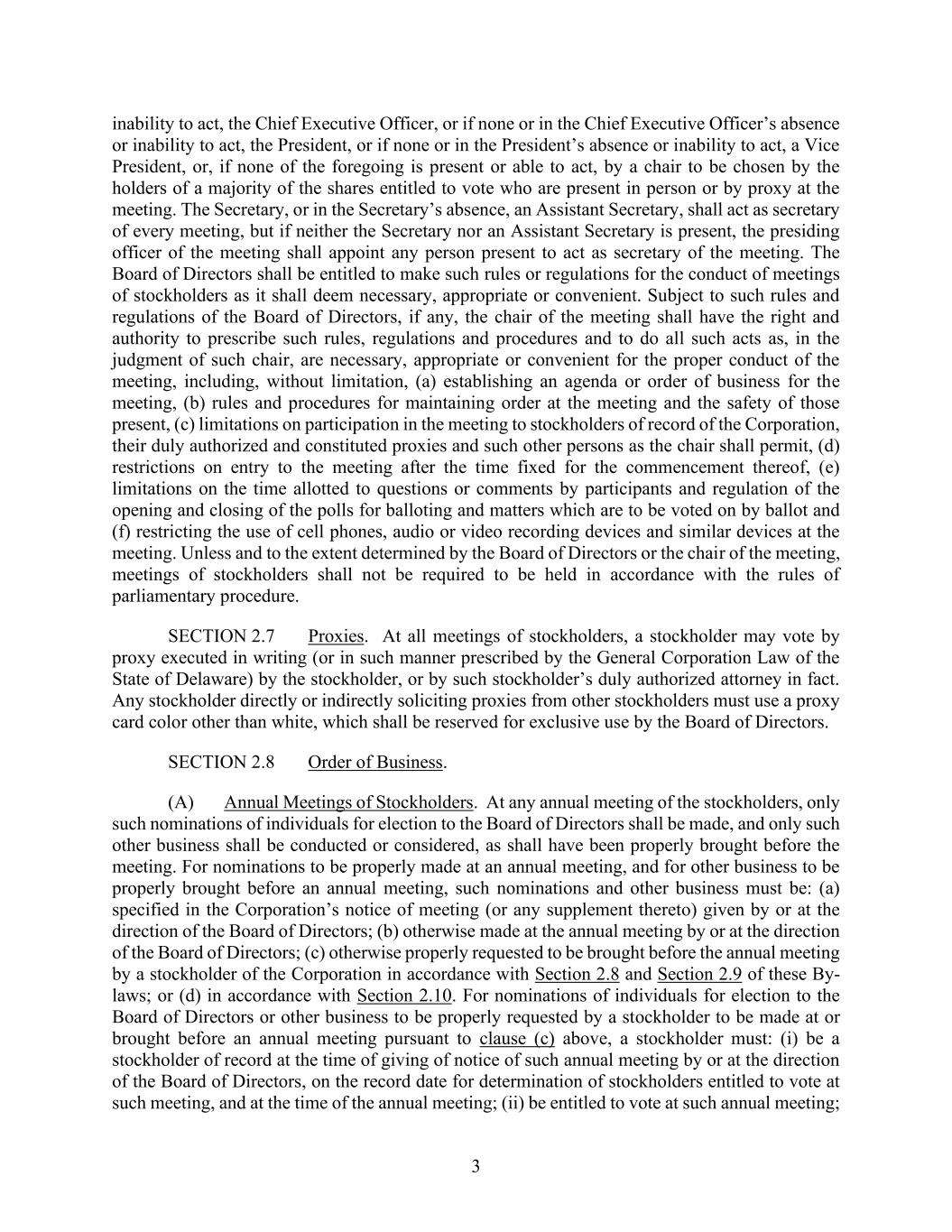 3 inability to act, the Chief Executive Officer, or if none or in the Chief Executive Officer’s absence or inability to act, the President, or if none or in the President’s absence or inability to act, a Vice President, or, if none of the foregoing is present or able to act, by a chair to be chosen by the holders of a majority of the shares entitled to vote who are present in person or by proxy at the meeting. The Secretary, or in the Secretary’s absence, an Assistant Secretary, shall act as secretary of every meeting, but if neither the Secretary nor an Assistant Secretary is present, the presiding officer of the meeting shall appoint any person present to act as secretary of the meeting. The Board of Directors shall be entitled to make such rules or regulations for the conduct of meetings of stockholders as it shall deem necessary, appropriate or convenient. Subject to such rules and regulations of the Board of Directors, if any, the chair of the meeting shall have the right and authority to prescribe such rules, regulations and procedures and to do all such acts as, in the judgment of such chair, are necessary, appropriate or convenient for the proper conduct of the meeting, including, without limitation, (a) establishing an agenda or order of business for the meeting, (b) rules and procedures for maintaining order at the meeting and the safety of those present, (c) limitations on participation in the meeting to stockholders of record of the Corporation, their duly authorized and constituted proxies and such other persons as the chair shall permit, (d) restrictions on entry to the meeting after the time fixed for the commencement thereof, (e) limitations on the time allotted to questions or comments by participants and regulation of the opening and closing of the polls for balloting and matters which are to be voted on by ballot and (f) restricting the use of cell phones, audio or video recording devices and similar devices at the meeting. Unless and to the extent determined by the Board of Directors or the chair of the meeting, meetings of stockholders shall not be required to be held in accordance with the rules of parliamentary procedure. SECTION 2.7 Proxies. At all meetings of stockholders, a stockholder may vote by proxy executed in writing (or in such manner prescribed by the General Corporation Law of the State of Delaware) by the stockholder, or by such stockholder’s duly authorized attorney in fact. Any stockholder directly or indirectly soliciting proxies from other stockholders must use a proxy card color other than white, which shall be reserved for exclusive use by the Board of Directors. SECTION 2.8 Order of Business. (A) Annual Meetings of Stockholders. At any annual meeting of the stockholders, only such nominations of individuals for election to the Board of Directors shall be made, and only such other business shall be conducted or considered, as shall have been properly brought before the meeting. For nominations to be properly made at an annual meeting, and for other business to be properly brought before an annual meeting, such nominations and other business must be: (a) specified in the Corporation’s notice of meeting (or any supplement thereto) given by or at the direction of the Board of Directors; (b) otherwise made at the annual meeting by or at the direction of the Board of Directors; (c) otherwise properly requested to be brought before the annual meeting by a stockholder of the Corporation in accordance with Section 2.8 and Section 2.9 of these By- laws; or (d) in accordance with Section 2.10. For nominations of individuals for election to the Board of Directors or other business to be properly requested by a stockholder to be made at or brought before an annual meeting pursuant to clause (c) above, a stockholder must: (i) be a stockholder of record at the time of giving of notice of such annual meeting by or at the direction of the Board of Directors, on the record date for determination of stockholders entitled to vote at such meeting, and at the time of the annual meeting; (ii) be entitled to vote at such annual meeting;