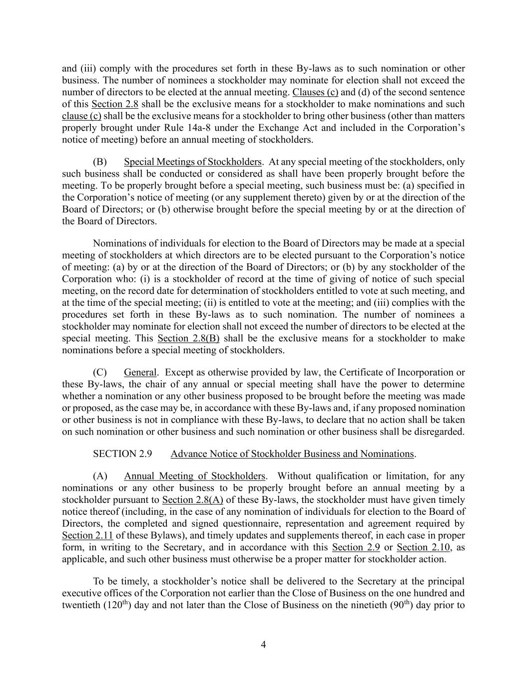 4 and (iii) comply with the procedures set forth in these By-laws as to such nomination or other business. The number of nominees a stockholder may nominate for election shall not exceed the number of directors to be elected at the annual meeting. Clauses (c) and (d) of the second sentence of this Section 2.8 shall be the exclusive means for a stockholder to make nominations and such clause (c) shall be the exclusive means for a stockholder to bring other business (other than matters properly brought under Rule 14a-8 under the Exchange Act and included in the Corporation’s notice of meeting) before an annual meeting of stockholders. (B) Special Meetings of Stockholders. At any special meeting of the stockholders, only such business shall be conducted or considered as shall have been properly brought before the meeting. To be properly brought before a special meeting, such business must be: (a) specified in the Corporation’s notice of meeting (or any supplement thereto) given by or at the direction of the Board of Directors; or (b) otherwise brought before the special meeting by or at the direction of the Board of Directors. Nominations of individuals for election to the Board of Directors may be made at a special meeting of stockholders at which directors are to be elected pursuant to the Corporation’s notice of meeting: (a) by or at the direction of the Board of Directors; or (b) by any stockholder of the Corporation who: (i) is a stockholder of record at the time of giving of notice of such special meeting, on the record date for determination of stockholders entitled to vote at such meeting, and at the time of the special meeting; (ii) is entitled to vote at the meeting; and (iii) complies with the procedures set forth in these By-laws as to such nomination. The number of nominees a stockholder may nominate for election shall not exceed the number of directors to be elected at the special meeting. This Section 2.8(B) shall be the exclusive means for a stockholder to make nominations before a special meeting of stockholders. (C) General. Except as otherwise provided by law, the Certificate of Incorporation or these By-laws, the chair of any annual or special meeting shall have the power to determine whether a nomination or any other business proposed to be brought before the meeting was made or proposed, as the case may be, in accordance with these By-laws and, if any proposed nomination or other business is not in compliance with these By-laws, to declare that no action shall be taken on such nomination or other business and such nomination or other business shall be disregarded. SECTION 2.9 Advance Notice of Stockholder Business and Nominations. (A) Annual Meeting of Stockholders. Without qualification or limitation, for any nominations or any other business to be properly brought before an annual meeting by a stockholder pursuant to Section 2.8(A) of these By-laws, the stockholder must have given timely notice thereof (including, in the case of any nomination of individuals for election to the Board of Directors, the completed and signed questionnaire, representation and agreement required by Section 2.11 of these Bylaws), and timely updates and supplements thereof, in each case in proper form, in writing to the Secretary, and in accordance with this Section 2.9 or Section 2.10, as applicable, and such other business must otherwise be a proper matter for stockholder action. To be timely, a stockholder’s notice shall be delivered to the Secretary at the principal executive offices of the Corporation not earlier than the Close of Business on the one hundred and twentieth (120th) day and not later than the Close of Business on the ninetieth (90th) day prior to