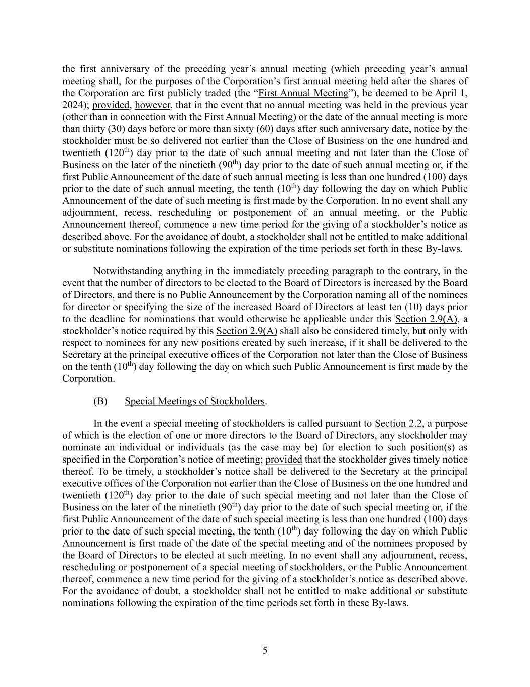 5 the first anniversary of the preceding year’s annual meeting (which preceding year’s annual meeting shall, for the purposes of the Corporation’s first annual meeting held after the shares of the Corporation are first publicly traded (the “First Annual Meeting”), be deemed to be April 1, 2024); provided, however, that in the event that no annual meeting was held in the previous year (other than in connection with the First Annual Meeting) or the date of the annual meeting is more than thirty (30) days before or more than sixty (60) days after such anniversary date, notice by the stockholder must be so delivered not earlier than the Close of Business on the one hundred and twentieth (120th) day prior to the date of such annual meeting and not later than the Close of Business on the later of the ninetieth (90th) day prior to the date of such annual meeting or, if the first Public Announcement of the date of such annual meeting is less than one hundred (100) days prior to the date of such annual meeting, the tenth (10th) day following the day on which Public Announcement of the date of such meeting is first made by the Corporation. In no event shall any adjournment, recess, rescheduling or postponement of an annual meeting, or the Public Announcement thereof, commence a new time period for the giving of a stockholder’s notice as described above. For the avoidance of doubt, a stockholder shall not be entitled to make additional or substitute nominations following the expiration of the time periods set forth in these By-laws. Notwithstanding anything in the immediately preceding paragraph to the contrary, in the event that the number of directors to be elected to the Board of Directors is increased by the Board of Directors, and there is no Public Announcement by the Corporation naming all of the nominees for director or specifying the size of the increased Board of Directors at least ten (10) days prior to the deadline for nominations that would otherwise be applicable under this Section 2.9(A), a stockholder’s notice required by this Section 2.9(A) shall also be considered timely, but only with respect to nominees for any new positions created by such increase, if it shall be delivered to the Secretary at the principal executive offices of the Corporation not later than the Close of Business on the tenth (10th) day following the day on which such Public Announcement is first made by the Corporation. (B) Special Meetings of Stockholders. In the event a special meeting of stockholders is called pursuant to Section 2.2, a purpose of which is the election of one or more directors to the Board of Directors, any stockholder may nominate an individual or individuals (as the case may be) for election to such position(s) as specified in the Corporation’s notice of meeting; provided that the stockholder gives timely notice thereof. To be timely, a stockholder’s notice shall be delivered to the Secretary at the principal executive offices of the Corporation not earlier than the Close of Business on the one hundred and twentieth (120th) day prior to the date of such special meeting and not later than the Close of Business on the later of the ninetieth (90th) day prior to the date of such special meeting or, if the first Public Announcement of the date of such special meeting is less than one hundred (100) days prior to the date of such special meeting, the tenth (10th) day following the day on which Public Announcement is first made of the date of the special meeting and of the nominees proposed by the Board of Directors to be elected at such meeting. In no event shall any adjournment, recess, rescheduling or postponement of a special meeting of stockholders, or the Public Announcement thereof, commence a new time period for the giving of a stockholder’s notice as described above. For the avoidance of doubt, a stockholder shall not be entitled to make additional or substitute nominations following the expiration of the time periods set forth in these By-laws.