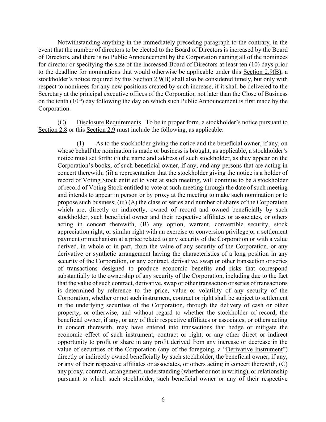 6 Notwithstanding anything in the immediately preceding paragraph to the contrary, in the event that the number of directors to be elected to the Board of Directors is increased by the Board of Directors, and there is no Public Announcement by the Corporation naming all of the nominees for director or specifying the size of the increased Board of Directors at least ten (10) days prior to the deadline for nominations that would otherwise be applicable under this Section 2.9(B), a stockholder’s notice required by this Section 2.9(B) shall also be considered timely, but only with respect to nominees for any new positions created by such increase, if it shall be delivered to the Secretary at the principal executive offices of the Corporation not later than the Close of Business on the tenth (10th) day following the day on which such Public Announcement is first made by the Corporation. (C) Disclosure Requirements. To be in proper form, a stockholder’s notice pursuant to Section 2.8 or this Section 2.9 must include the following, as applicable: (1) As to the stockholder giving the notice and the beneficial owner, if any, on whose behalf the nomination is made or business is brought, as applicable, a stockholder’s notice must set forth: (i) the name and address of such stockholder, as they appear on the Corporation’s books, of such beneficial owner, if any, and any persons that are acting in concert therewith; (ii) a representation that the stockholder giving the notice is a holder of record of Voting Stock entitled to vote at such meeting, will continue to be a stockholder of record of Voting Stock entitled to vote at such meeting through the date of such meeting and intends to appear in person or by proxy at the meeting to make such nomination or to propose such business; (iii) (A) the class or series and number of shares of the Corporation which are, directly or indirectly, owned of record and owned beneficially by such stockholder, such beneficial owner and their respective affiliates or associates, or others acting in concert therewith, (B) any option, warrant, convertible security, stock appreciation right, or similar right with an exercise or conversion privilege or a settlement payment or mechanism at a price related to any security of the Corporation or with a value derived, in whole or in part, from the value of any security of the Corporation, or any derivative or synthetic arrangement having the characteristics of a long position in any security of the Corporation, or any contract, derivative, swap or other transaction or series of transactions designed to produce economic benefits and risks that correspond substantially to the ownership of any security of the Corporation, including due to the fact that the value of such contract, derivative, swap or other transaction or series of transactions is determined by reference to the price, value or volatility of any security of the Corporation, whether or not such instrument, contract or right shall be subject to settlement in the underlying securities of the Corporation, through the delivery of cash or other property, or otherwise, and without regard to whether the stockholder of record, the beneficial owner, if any, or any of their respective affiliates or associates, or others acting in concert therewith, may have entered into transactions that hedge or mitigate the economic effect of such instrument, contract or right, or any other direct or indirect opportunity to profit or share in any profit derived from any increase or decrease in the value of securities of the Corporation (any of the foregoing, a “Derivative Instrument”) directly or indirectly owned beneficially by such stockholder, the beneficial owner, if any, or any of their respective affiliates or associates, or others acting in concert therewith, (C) any proxy, contract, arrangement, understanding (whether or not in writing), or relationship pursuant to which such stockholder, such beneficial owner or any of their respective