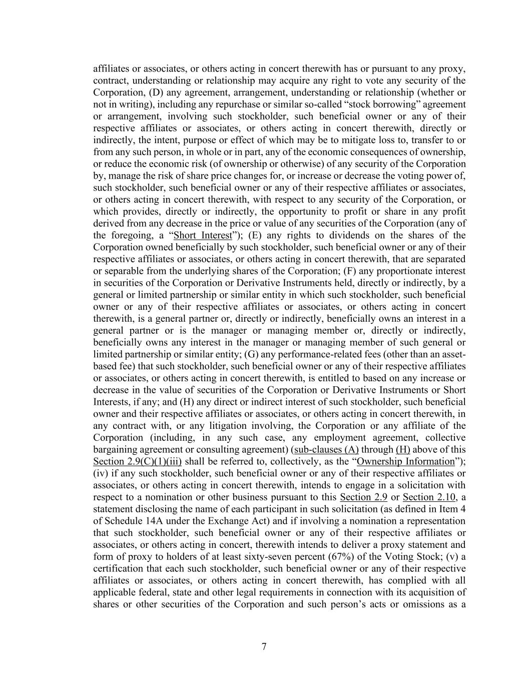 7 affiliates or associates, or others acting in concert therewith has or pursuant to any proxy, contract, understanding or relationship may acquire any right to vote any security of the Corporation, (D) any agreement, arrangement, understanding or relationship (whether or not in writing), including any repurchase or similar so-called “stock borrowing” agreement or arrangement, involving such stockholder, such beneficial owner or any of their respective affiliates or associates, or others acting in concert therewith, directly or indirectly, the intent, purpose or effect of which may be to mitigate loss to, transfer to or from any such person, in whole or in part, any of the economic consequences of ownership, or reduce the economic risk (of ownership or otherwise) of any security of the Corporation by, manage the risk of share price changes for, or increase or decrease the voting power of, such stockholder, such beneficial owner or any of their respective affiliates or associates, or others acting in concert therewith, with respect to any security of the Corporation, or which provides, directly or indirectly, the opportunity to profit or share in any profit derived from any decrease in the price or value of any securities of the Corporation (any of the foregoing, a “Short Interest”); (E) any rights to dividends on the shares of the Corporation owned beneficially by such stockholder, such beneficial owner or any of their respective affiliates or associates, or others acting in concert therewith, that are separated or separable from the underlying shares of the Corporation; (F) any proportionate interest in securities of the Corporation or Derivative Instruments held, directly or indirectly, by a general or limited partnership or similar entity in which such stockholder, such beneficial owner or any of their respective affiliates or associates, or others acting in concert therewith, is a general partner or, directly or indirectly, beneficially owns an interest in a general partner or is the manager or managing member or, directly or indirectly, beneficially owns any interest in the manager or managing member of such general or limited partnership or similar entity; (G) any performance-related fees (other than an asset- based fee) that such stockholder, such beneficial owner or any of their respective affiliates or associates, or others acting in concert therewith, is entitled to based on any increase or decrease in the value of securities of the Corporation or Derivative Instruments or Short Interests, if any; and (H) any direct or indirect interest of such stockholder, such beneficial owner and their respective affiliates or associates, or others acting in concert therewith, in any contract with, or any litigation involving, the Corporation or any affiliate of the Corporation (including, in any such case, any employment agreement, collective bargaining agreement or consulting agreement) (sub-clauses (A) through (H) above of this Section 2.9(C)(1)(iii) shall be referred to, collectively, as the “Ownership Information”); (iv) if any such stockholder, such beneficial owner or any of their respective affiliates or associates, or others acting in concert therewith, intends to engage in a solicitation with respect to a nomination or other business pursuant to this Section 2.9 or Section 2.10, a statement disclosing the name of each participant in such solicitation (as defined in Item 4 of Schedule 14A under the Exchange Act) and if involving a nomination a representation that such stockholder, such beneficial owner or any of their respective affiliates or associates, or others acting in concert, therewith intends to deliver a proxy statement and form of proxy to holders of at least sixty-seven percent (67%) of the Voting Stock; (v) a certification that each such stockholder, such beneficial owner or any of their respective affiliates or associates, or others acting in concert therewith, has complied with all applicable federal, state and other legal requirements in connection with its acquisition of shares or other securities of the Corporation and such person’s acts or omissions as a