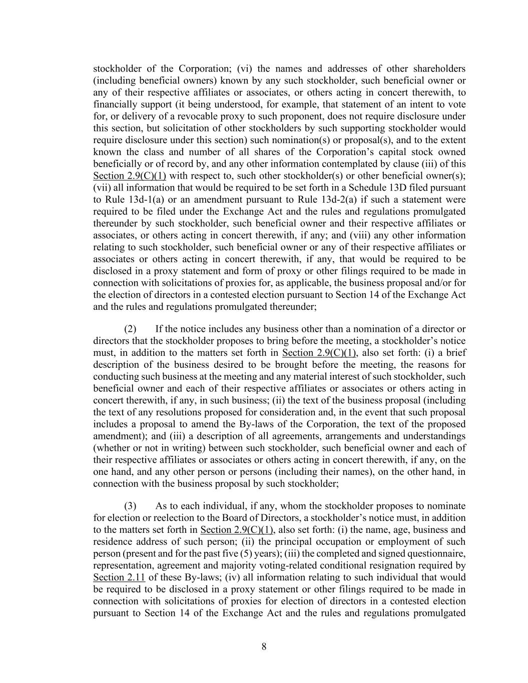 8 stockholder of the Corporation; (vi) the names and addresses of other shareholders (including beneficial owners) known by any such stockholder, such beneficial owner or any of their respective affiliates or associates, or others acting in concert therewith, to financially support (it being understood, for example, that statement of an intent to vote for, or delivery of a revocable proxy to such proponent, does not require disclosure under this section, but solicitation of other stockholders by such supporting stockholder would require disclosure under this section) such nomination(s) or proposal(s), and to the extent known the class and number of all shares of the Corporation’s capital stock owned beneficially or of record by, and any other information contemplated by clause (iii) of this Section 2.9(C)(1) with respect to, such other stockholder(s) or other beneficial owner(s); (vii) all information that would be required to be set forth in a Schedule 13D filed pursuant to Rule 13d-1(a) or an amendment pursuant to Rule 13d-2(a) if such a statement were required to be filed under the Exchange Act and the rules and regulations promulgated thereunder by such stockholder, such beneficial owner and their respective affiliates or associates, or others acting in concert therewith, if any; and (viii) any other information relating to such stockholder, such beneficial owner or any of their respective affiliates or associates or others acting in concert therewith, if any, that would be required to be disclosed in a proxy statement and form of proxy or other filings required to be made in connection with solicitations of proxies for, as applicable, the business proposal and/or for the election of directors in a contested election pursuant to Section 14 of the Exchange Act and the rules and regulations promulgated thereunder; (2) If the notice includes any business other than a nomination of a director or directors that the stockholder proposes to bring before the meeting, a stockholder’s notice must, in addition to the matters set forth in Section 2.9(C)(1), also set forth: (i) a brief description of the business desired to be brought before the meeting, the reasons for conducting such business at the meeting and any material interest of such stockholder, such beneficial owner and each of their respective affiliates or associates or others acting in concert therewith, if any, in such business; (ii) the text of the business proposal (including the text of any resolutions proposed for consideration and, in the event that such proposal includes a proposal to amend the By-laws of the Corporation, the text of the proposed amendment); and (iii) a description of all agreements, arrangements and understandings (whether or not in writing) between such stockholder, such beneficial owner and each of their respective affiliates or associates or others acting in concert therewith, if any, on the one hand, and any other person or persons (including their names), on the other hand, in connection with the business proposal by such stockholder; (3) As to each individual, if any, whom the stockholder proposes to nominate for election or reelection to the Board of Directors, a stockholder’s notice must, in addition to the matters set forth in Section 2.9(C)(1), also set forth: (i) the name, age, business and residence address of such person; (ii) the principal occupation or employment of such person (present and for the past five (5) years); (iii) the completed and signed questionnaire, representation, agreement and majority voting-related conditional resignation required by Section 2.11 of these By-laws; (iv) all information relating to such individual that would be required to be disclosed in a proxy statement or other filings required to be made in connection with solicitations of proxies for election of directors in a contested election pursuant to Section 14 of the Exchange Act and the rules and regulations promulgated