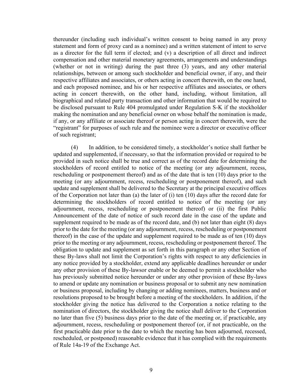 9 thereunder (including such individual’s written consent to being named in any proxy statement and form of proxy card as a nominee) and a written statement of intent to serve as a director for the full term if elected; and (v) a description of all direct and indirect compensation and other material monetary agreements, arrangements and understandings (whether or not in writing) during the past three (3) years, and any other material relationships, between or among such stockholder and beneficial owner, if any, and their respective affiliates and associates, or others acting in concert therewith, on the one hand, and each proposed nominee, and his or her respective affiliates and associates, or others acting in concert therewith, on the other hand, including, without limitation, all biographical and related party transaction and other information that would be required to be disclosed pursuant to Rule 404 promulgated under Regulation S-K if the stockholder making the nomination and any beneficial owner on whose behalf the nomination is made, if any, or any affiliate or associate thereof or person acting in concert therewith, were the “registrant” for purposes of such rule and the nominee were a director or executive officer of such registrant; (4) In addition, to be considered timely, a stockholder’s notice shall further be updated and supplemented, if necessary, so that the information provided or required to be provided in such notice shall be true and correct as of the record date for determining the stockholders of record entitled to notice of the meeting (or any adjournment, recess, rescheduling or postponement thereof) and as of the date that is ten (10) days prior to the meeting (or any adjournment, recess, rescheduling or postponement thereof), and such update and supplement shall be delivered to the Secretary at the principal executive offices of the Corporation not later than (a) the later of (i) ten (10) days after the record date for determining the stockholders of record entitled to notice of the meeting (or any adjournment, recess, rescheduling or postponement thereof) or (ii) the first Public Announcement of the date of notice of such record date in the case of the update and supplement required to be made as of the record date, and (b) not later than eight (8) days prior to the date for the meeting (or any adjournment, recess, rescheduling or postponement thereof) in the case of the update and supplement required to be made as of ten (10) days prior to the meeting or any adjournment, recess, rescheduling or postponement thereof. The obligation to update and supplement as set forth in this paragraph or any other Section of these By-laws shall not limit the Corporation’s rights with respect to any deficiencies in any notice provided by a stockholder, extend any applicable deadlines hereunder or under any other provision of these By-lawsor enable or be deemed to permit a stockholder who has previously submitted notice hereunder or under any other provision of these By-laws to amend or update any nomination or business proposal or to submit any new nomination or business proposal, including by changing or adding nominees, matters, business and or resolutions proposed to be brought before a meeting of the stockholders. In addition, if the stockholder giving the notice has delivered to the Corporation a notice relating to the nomination of directors, the stockholder giving the notice shall deliver to the Corporation no later than five (5) business days prior to the date of the meeting or, if practicable, any adjournment, recess, rescheduling or postponement thereof (or, if not practicable, on the first practicable date prior to the date to which the meeting has been adjourned, recessed, rescheduled, or postponed) reasonable evidence that it has complied with the requirements of Rule 14a-19 of the Exchange Act.
