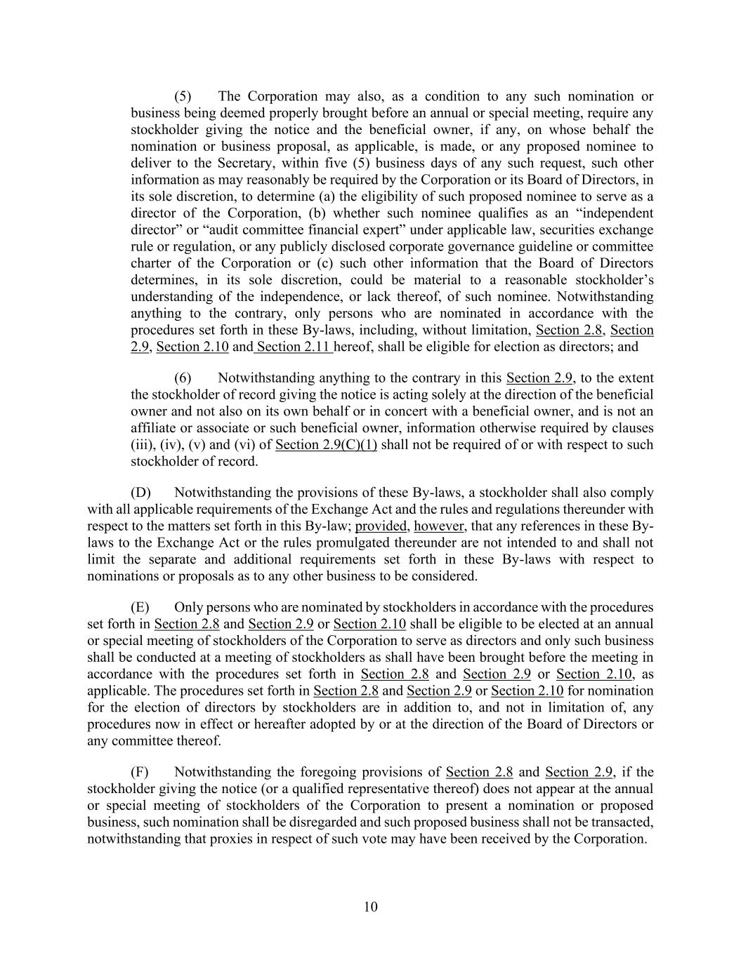 10 (5) The Corporation may also, as a condition to any such nomination or business being deemed properly brought before an annual or special meeting, require any stockholder giving the notice and the beneficial owner, if any, on whose behalf the nomination or business proposal, as applicable, is made, or any proposed nominee to deliver to the Secretary, within five (5) business days of any such request, such other information as may reasonably be required by the Corporation or its Board of Directors, in its sole discretion, to determine (a) the eligibility of such proposed nominee to serve as a director of the Corporation, (b) whether such nominee qualifies as an “independent director” or “audit committee financial expert” under applicable law, securities exchange rule or regulation, or any publicly disclosed corporate governance guideline or committee charter of the Corporation or (c) such other information that the Board of Directors determines, in its sole discretion, could be material to a reasonable stockholder’s understanding of the independence, or lack thereof, of such nominee. Notwithstanding anything to the contrary, only persons who are nominated in accordance with the procedures set forth in these By-laws, including, without limitation, Section 2.8, Section 2.9, Section 2.10 and Section 2.11 hereof, shall be eligible for election as directors; and (6) Notwithstanding anything to the contrary in this Section 2.9, to the extent the stockholder of record giving the notice is acting solely at the direction of the beneficial owner and not also on its own behalf or in concert with a beneficial owner, and is not an affiliate or associate or such beneficial owner, information otherwise required by clauses (iii), (iv), (v) and (vi) of Section 2.9(C)(1) shall not be required of or with respect to such stockholder of record. (D) Notwithstanding the provisions of these By-laws, a stockholder shall also comply with all applicable requirements of the Exchange Act and the rules and regulations thereunder with respect to the matters set forth in this By-law; provided, however, that any references in these By- laws to the Exchange Act or the rules promulgated thereunder are not intended to and shall not limit the separate and additional requirements set forth in these By-laws with respect to nominations or proposals as to any other business to be considered. (E) Only persons who are nominated by stockholders in accordance with the procedures set forth in Section 2.8 and Section 2.9 or Section 2.10 shall be eligible to be elected at an annual or special meeting of stockholders of the Corporation to serve as directors and only such business shall be conducted at a meeting of stockholders as shall have been brought before the meeting in accordance with the procedures set forth in Section 2.8 and Section 2.9 or Section 2.10, as applicable. The procedures set forth in Section 2.8 and Section 2.9 or Section 2.10 for nomination for the election of directors by stockholders are in addition to, and not in limitation of, any procedures now in effect or hereafter adopted by or at the direction of the Board of Directors or any committee thereof. (F) Notwithstanding the foregoing provisions of Section 2.8 and Section 2.9, if the stockholder giving the notice (or a qualified representative thereof) does not appear at the annual or special meeting of stockholders of the Corporation to present a nomination or proposed business, such nomination shall be disregarded and such proposed business shall not be transacted, notwithstanding that proxies in respect of such vote may have been received by the Corporation.