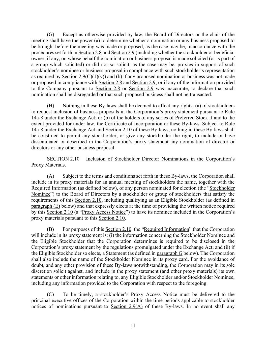 11 (G) Except as otherwise provided by law, the Board of Directors or the chair of the meeting shall have the power (a) to determine whether a nomination or any business proposed to be brought before the meeting was made or proposed, as the case may be, in accordance with the procedures set forth in Section 2.8 and Section 2.9 (including whether the stockholder or beneficial owner, if any, on whose behalf the nomination or business proposal is made solicited (or is part of a group which solicited) or did not so solicit, as the case may be, proxies in support of such stockholder’s nominee or business proposal in compliance with such stockholder’s representation as required by Section 2.9(C)(1)(v)) and (b) if any proposed nomination or business was not made or proposed in compliance with Section 2.8 and Section 2.9, or if any of the information provided to the Company pursuant to Section 2.8 or Section 2.9 was inaccurate, to declare that such nomination shall be disregarded or that such proposed business shall not be transacted. (H) Nothing in these By-laws shall be deemed to affect any rights: (a) of stockholders to request inclusion of business proposals in the Corporation’s proxy statement pursuant to Rule 14a-8 under the Exchange Act; or (b) of the holders of any series of Preferred Stock if and to the extent provided for under law, the Certificate of Incorporation or these By-laws. Subject to Rule 14a-8 under the Exchange Act and Section 2.10 of these By-laws, nothing in these By-laws shall be construed to permit any stockholder, or give any stockholder the right, to include or have disseminated or described in the Corporation’s proxy statement any nomination of director or directors or any other business proposal. SECTION 2.10 Inclusion of Stockholder Director Nominations in the Corporation’s Proxy Materials. (A) Subject to the terms and conditions set forth in these By-laws, the Corporation shall include in its proxy materials for an annual meeting of stockholders the name, together with the Required Information (as defined below), of any person nominated for election (the “Stockholder Nominee”) to the Board of Directors by a stockholder or group of stockholders that satisfy the requirements of this Section 2.10, including qualifying as an Eligible Stockholder (as defined in paragraph (E) below) and that expressly elects at the time of providing the written notice required by this Section 2.10 (a “Proxy Access Notice”) to have its nominee included in the Corporation’s proxy materials pursuant to this Section 2.10. (B) For purposes of this Section 2.10, the “Required Information” that the Corporation will include in its proxy statement is: (i) the information concerning the Stockholder Nominee and the Eligible Stockholder that the Corporation determines is required to be disclosed in the Corporation’s proxy statement by the regulations promulgated under the Exchange Act; and (ii) if the Eligible Stockholder so elects, a Statement (as defined in paragraph G below). The Corporation shall also include the name of the Stockholder Nominee in its proxy card. For the avoidance of doubt, and any other provision of these By-laws notwithstanding, the Corporation may in its sole discretion solicit against, and include in the proxy statement (and other proxy materials) its own statements or other information relating to, any Eligible Stockholder and/or Stockholder Nominee, including any information provided to the Corporation with respect to the foregoing. (C) To be timely, a stockholder’s Proxy Access Notice must be delivered to the principal executive offices of the Corporation within the time periods applicable to stockholder notices of nominations pursuant to Section 2.9(A) of these By-laws. In no event shall any
