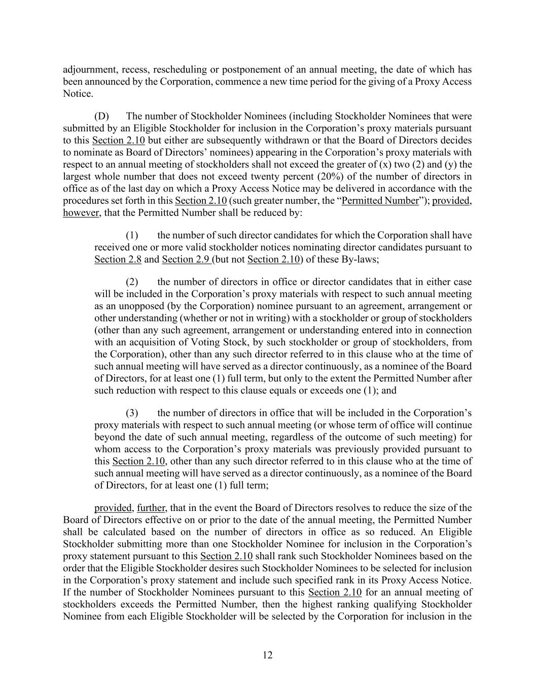 12 adjournment, recess, rescheduling or postponement of an annual meeting, the date of which has been announced by the Corporation, commence a new time period for the giving of a Proxy Access Notice. (D) The number of Stockholder Nominees (including Stockholder Nominees that were submitted by an Eligible Stockholder for inclusion in the Corporation’s proxy materials pursuant to this Section 2.10 but either are subsequently withdrawn or that the Board of Directors decides to nominate as Board of Directors’ nominees) appearing in the Corporation’s proxy materials with respect to an annual meeting of stockholders shall not exceed the greater of (x) two (2) and (y) the largest whole number that does not exceed twenty percent (20%) of the number of directors in office as of the last day on which a Proxy Access Notice may be delivered in accordance with the procedures set forth in this Section 2.10 (such greater number, the “Permitted Number”); provided, however, that the Permitted Number shall be reduced by: (1) the number of such director candidates for which the Corporation shall have received one or more valid stockholder notices nominating director candidates pursuant to Section 2.8 and Section 2.9 (but not Section 2.10) of these By-laws; (2) the number of directors in office or director candidates that in either case will be included in the Corporation’s proxy materials with respect to such annual meeting as an unopposed (by the Corporation) nominee pursuant to an agreement, arrangement or other understanding (whether or not in writing) with a stockholder or group of stockholders (other than any such agreement, arrangement or understanding entered into in connection with an acquisition of Voting Stock, by such stockholder or group of stockholders, from the Corporation), other than any such director referred to in this clause who at the time of such annual meeting will have served as a director continuously, as a nominee of the Board of Directors, for at least one (1) full term, but only to the extent the Permitted Number after such reduction with respect to this clause equals or exceeds one (1); and (3) the number of directors in office that will be included in the Corporation’s proxy materials with respect to such annual meeting (or whose term of office will continue beyond the date of such annual meeting, regardless of the outcome of such meeting) for whom access to the Corporation’s proxy materials was previously provided pursuant to this Section 2.10, other than any such director referred to in this clause who at the time of such annual meeting will have served as a director continuously, as a nominee of the Board of Directors, for at least one (1) full term; provided, further, that in the event the Board of Directors resolves to reduce the size of the Board of Directors effective on or prior to the date of the annual meeting, the Permitted Number shall be calculated based on the number of directors in office as so reduced. An Eligible Stockholder submitting more than one Stockholder Nominee for inclusion in the Corporation’s proxy statement pursuant to this Section 2.10 shall rank such Stockholder Nominees based on the order that the Eligible Stockholder desires such Stockholder Nominees to be selected for inclusion in the Corporation’s proxy statement and include such specified rank in its Proxy Access Notice. If the number of Stockholder Nominees pursuant to this Section 2.10 for an annual meeting of stockholders exceeds the Permitted Number, then the highest ranking qualifying Stockholder Nominee from each Eligible Stockholder will be selected by the Corporation for inclusion in the