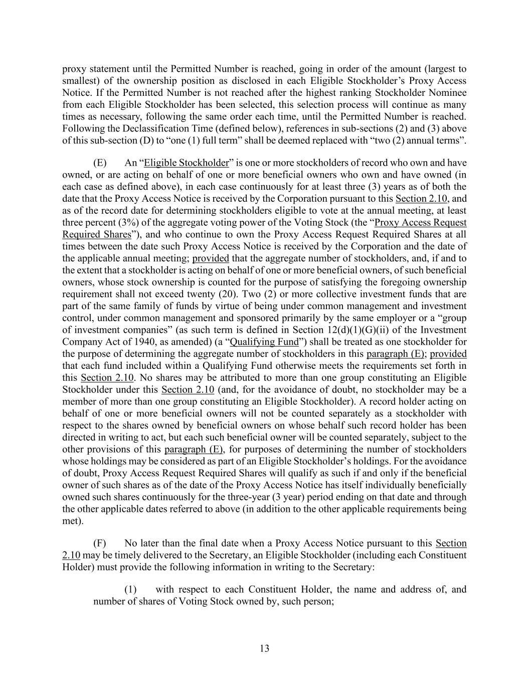 13 proxy statement until the Permitted Number is reached, going in order of the amount (largest to smallest) of the ownership position as disclosed in each Eligible Stockholder’s Proxy Access Notice. If the Permitted Number is not reached after the highest ranking Stockholder Nominee from each Eligible Stockholder has been selected, this selection process will continue as many times as necessary, following the same order each time, until the Permitted Number is reached. Following the Declassification Time (defined below), references in sub-sections (2) and (3) above of this sub-section (D) to “one (1) full term” shall be deemed replaced with “two (2) annual terms”. (E) An “Eligible Stockholder” is one or more stockholders of record who own and have owned, or are acting on behalf of one or more beneficial owners who own and have owned (in each case as defined above), in each case continuously for at least three (3) years as of both the date that the Proxy Access Notice is received by the Corporation pursuant to this Section 2.10, and as of the record date for determining stockholders eligible to vote at the annual meeting, at least three percent (3%) of the aggregate voting power of the Voting Stock (the “Proxy Access Request Required Shares”), and who continue to own the Proxy Access Request Required Shares at all times between the date such Proxy Access Notice is received by the Corporation and the date of the applicable annual meeting; provided that the aggregate number of stockholders, and, if and to the extent that a stockholder is acting on behalf of one or more beneficial owners, of such beneficial owners, whose stock ownership is counted for the purpose of satisfying the foregoing ownership requirement shall not exceed twenty (20). Two (2) or more collective investment funds that are part of the same family of funds by virtue of being under common management and investment control, under common management and sponsored primarily by the same employer or a “group of investment companies” (as such term is defined in Section 12(d)(1)(G)(ii) of the Investment Company Act of 1940, as amended) (a “Qualifying Fund”) shall be treated as one stockholder for the purpose of determining the aggregate number of stockholders in this paragraph (E); provided that each fund included within a Qualifying Fund otherwise meets the requirements set forth in this Section 2.10. No shares may be attributed to more than one group constituting an Eligible Stockholder under this Section 2.10 (and, for the avoidance of doubt, no stockholder may be a member of more than one group constituting an Eligible Stockholder). A record holder acting on behalf of one or more beneficial owners will not be counted separately as a stockholder with respect to the shares owned by beneficial owners on whose behalf such record holder has been directed in writing to act, but each such beneficial owner will be counted separately, subject to the other provisions of this paragraph (E), for purposes of determining the number of stockholders whose holdings may be considered as part of an Eligible Stockholder’s holdings. For the avoidance of doubt, Proxy Access Request Required Shares will qualify as such if and only if the beneficial owner of such shares as of the date of the Proxy Access Notice has itself individually beneficially owned such shares continuously for the three-year (3 year) period ending on that date and through the other applicable dates referred to above (in addition to the other applicable requirements being met). (F) No later than the final date when a Proxy Access Notice pursuant to this Section 2.10 may be timely delivered to the Secretary, an Eligible Stockholder (including each Constituent Holder) must provide the following information in writing to the Secretary: (1) with respect to each Constituent Holder, the name and address of, and number of shares of Voting Stock owned by, such person;