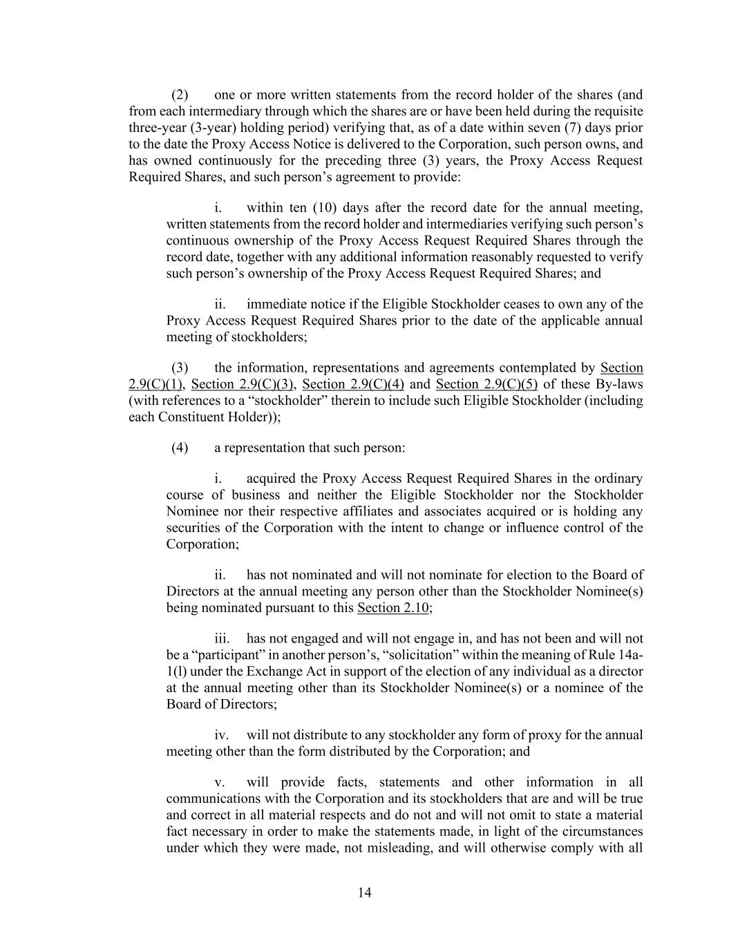 14 (2) one or more written statements from the record holder of the shares (and from each intermediary through which the shares are or have been held during the requisite three-year (3-year) holding period) verifying that, as of a date within seven (7) days prior to the date the Proxy Access Notice is delivered to the Corporation, such person owns, and has owned continuously for the preceding three (3) years, the Proxy Access Request Required Shares, and such person’s agreement to provide: i. within ten (10) days after the record date for the annual meeting, written statements from the record holder and intermediaries verifying such person’s continuous ownership of the Proxy Access Request Required Shares through the record date, together with any additional information reasonably requested to verify such person’s ownership of the Proxy Access Request Required Shares; and ii. immediate notice if the Eligible Stockholder ceases to own any of the Proxy Access Request Required Shares prior to the date of the applicable annual meeting of stockholders; (3) the information, representations and agreements contemplated by Section 2.9(C)(1), Section 2.9(C)(3), Section 2.9(C)(4) and Section 2.9(C)(5) of these By-laws (with references to a “stockholder” therein to include such Eligible Stockholder (including each Constituent Holder)); (4) a representation that such person: i. acquired the Proxy Access Request Required Shares in the ordinary course of business and neither the Eligible Stockholder nor the Stockholder Nominee nor their respective affiliates and associates acquired or is holding any securities of the Corporation with the intent to change or influence control of the Corporation; ii. has not nominated and will not nominate for election to the Board of Directors at the annual meeting any person other than the Stockholder Nominee(s) being nominated pursuant to this Section 2.10; iii. has not engaged and will not engage in, and has not been and will not be a “participant” in another person’s, “solicitation” within the meaning of Rule 14a- 1(l) under the Exchange Act in support of the election of any individual as a director at the annual meeting other than its Stockholder Nominee(s) or a nominee of the Board of Directors; iv. will not distribute to any stockholder any form of proxy for the annual meeting other than the form distributed by the Corporation; and v. will provide facts, statements and other information in all communications with the Corporation and its stockholders that are and will be true and correct in all material respects and do not and will not omit to state a material fact necessary in order to make the statements made, in light of the circumstances under which they were made, not misleading, and will otherwise comply with all