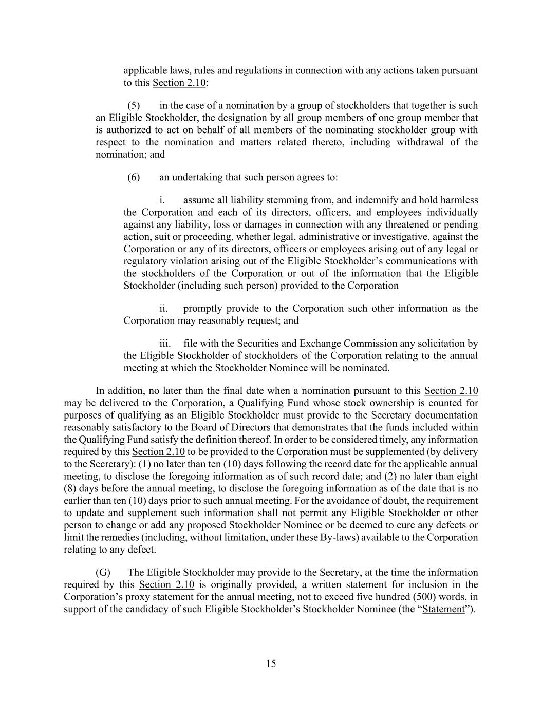 15 applicable laws, rules and regulations in connection with any actions taken pursuant to this Section 2.10; (5) in the case of a nomination by a group of stockholders that together is such an Eligible Stockholder, the designation by all group members of one group member that is authorized to act on behalf of all members of the nominating stockholder group with respect to the nomination and matters related thereto, including withdrawal of the nomination; and (6) an undertaking that such person agrees to: i. assume all liability stemming from, and indemnify and hold harmless the Corporation and each of its directors, officers, and employees individually against any liability, loss or damages in connection with any threatened or pending action, suit or proceeding, whether legal, administrative or investigative, against the Corporation or any of its directors, officers or employees arising out of any legal or regulatory violation arising out of the Eligible Stockholder’s communications with the stockholders of the Corporation or out of the information that the Eligible Stockholder (including such person) provided to the Corporation ii. promptly provide to the Corporation such other information as the Corporation may reasonably request; and iii. file with the Securities and Exchange Commission any solicitation by the Eligible Stockholder of stockholders of the Corporation relating to the annual meeting at which the Stockholder Nominee will be nominated. In addition, no later than the final date when a nomination pursuant to this Section 2.10 may be delivered to the Corporation, a Qualifying Fund whose stock ownership is counted for purposes of qualifying as an Eligible Stockholder must provide to the Secretary documentation reasonably satisfactory to the Board of Directors that demonstrates that the funds included within the Qualifying Fund satisfy the definition thereof. In order to be considered timely, any information required by this Section 2.10 to be provided to the Corporation must be supplemented (by delivery to the Secretary): (1) no later than ten (10) days following the record date for the applicable annual meeting, to disclose the foregoing information as of such record date; and (2) no later than eight (8) days before the annual meeting, to disclose the foregoing information as of the date that is no earlier than ten (10) days prior to such annual meeting. For the avoidance of doubt, the requirement to update and supplement such information shall not permit any Eligible Stockholder or other person to change or add any proposed Stockholder Nominee or be deemed to cure any defects or limit the remedies (including, without limitation, under these By-laws) available to the Corporation relating to any defect. (G) The Eligible Stockholder may provide to the Secretary, at the time the information required by this Section 2.10 is originally provided, a written statement for inclusion in the Corporation’s proxy statement for the annual meeting, not to exceed five hundred (500) words, in support of the candidacy of such Eligible Stockholder’s Stockholder Nominee (the “Statement”).