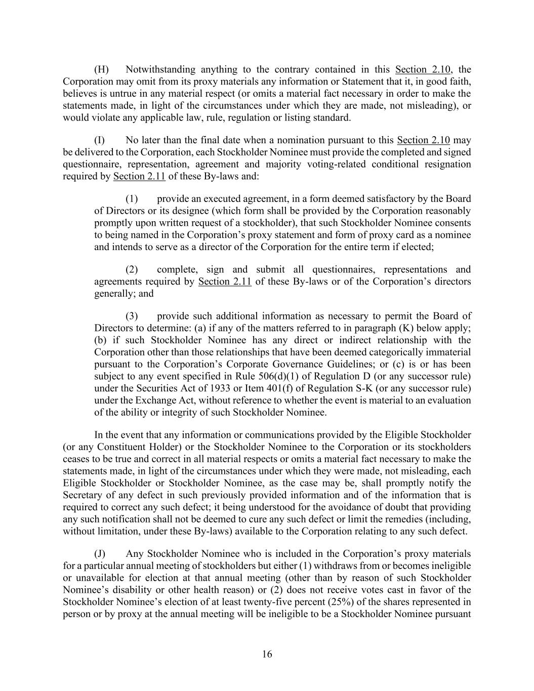 16 (H) Notwithstanding anything to the contrary contained in this Section 2.10, the Corporation may omit from its proxy materials any information or Statement that it, in good faith, believes is untrue in any material respect (or omits a material fact necessary in order to make the statements made, in light of the circumstances under which they are made, not misleading), or would violate any applicable law, rule, regulation or listing standard. (I) No later than the final date when a nomination pursuant to this Section 2.10 may be delivered to the Corporation, each Stockholder Nominee must provide the completed and signed questionnaire, representation, agreement and majority voting-related conditional resignation required by Section 2.11 of these By-laws and: (1) provide an executed agreement, in a form deemed satisfactory by the Board of Directors or its designee (which form shall be provided by the Corporation reasonably promptly upon written request of a stockholder), that such Stockholder Nominee consents to being named in the Corporation’s proxy statement and form of proxy card as a nominee and intends to serve as a director of the Corporation for the entire term if elected; (2) complete, sign and submit all questionnaires, representations and agreements required by Section 2.11 of these By-laws or of the Corporation’s directors generally; and (3) provide such additional information as necessary to permit the Board of Directors to determine: (a) if any of the matters referred to in paragraph (K) below apply; (b) if such Stockholder Nominee has any direct or indirect relationship with the Corporation other than those relationships that have been deemed categorically immaterial pursuant to the Corporation’s Corporate Governance Guidelines; or (c) is or has been subject to any event specified in Rule 506(d)(1) of Regulation D (or any successor rule) under the Securities Act of 1933 or Item 401(f) of Regulation S-K (or any successor rule) under the Exchange Act, without reference to whether the event is material to an evaluation of the ability or integrity of such Stockholder Nominee. In the event that any information or communications provided by the Eligible Stockholder (or any Constituent Holder) or the Stockholder Nominee to the Corporation or its stockholders ceases to be true and correct in all material respects or omits a material fact necessary to make the statements made, in light of the circumstances under which they were made, not misleading, each Eligible Stockholder or Stockholder Nominee, as the case may be, shall promptly notify the Secretary of any defect in such previously provided information and of the information that is required to correct any such defect; it being understood for the avoidance of doubt that providing any such notification shall not be deemed to cure any such defect or limit the remedies (including, without limitation, under these By-laws) available to the Corporation relating to any such defect. (J) Any Stockholder Nominee who is included in the Corporation’s proxy materials for a particular annual meeting of stockholders but either (1) withdraws from or becomes ineligible or unavailable for election at that annual meeting (other than by reason of such Stockholder Nominee’s disability or other health reason) or (2) does not receive votes cast in favor of the Stockholder Nominee’s election of at least twenty-five percent (25%) of the shares represented in person or by proxy at the annual meeting will be ineligible to be a Stockholder Nominee pursuant