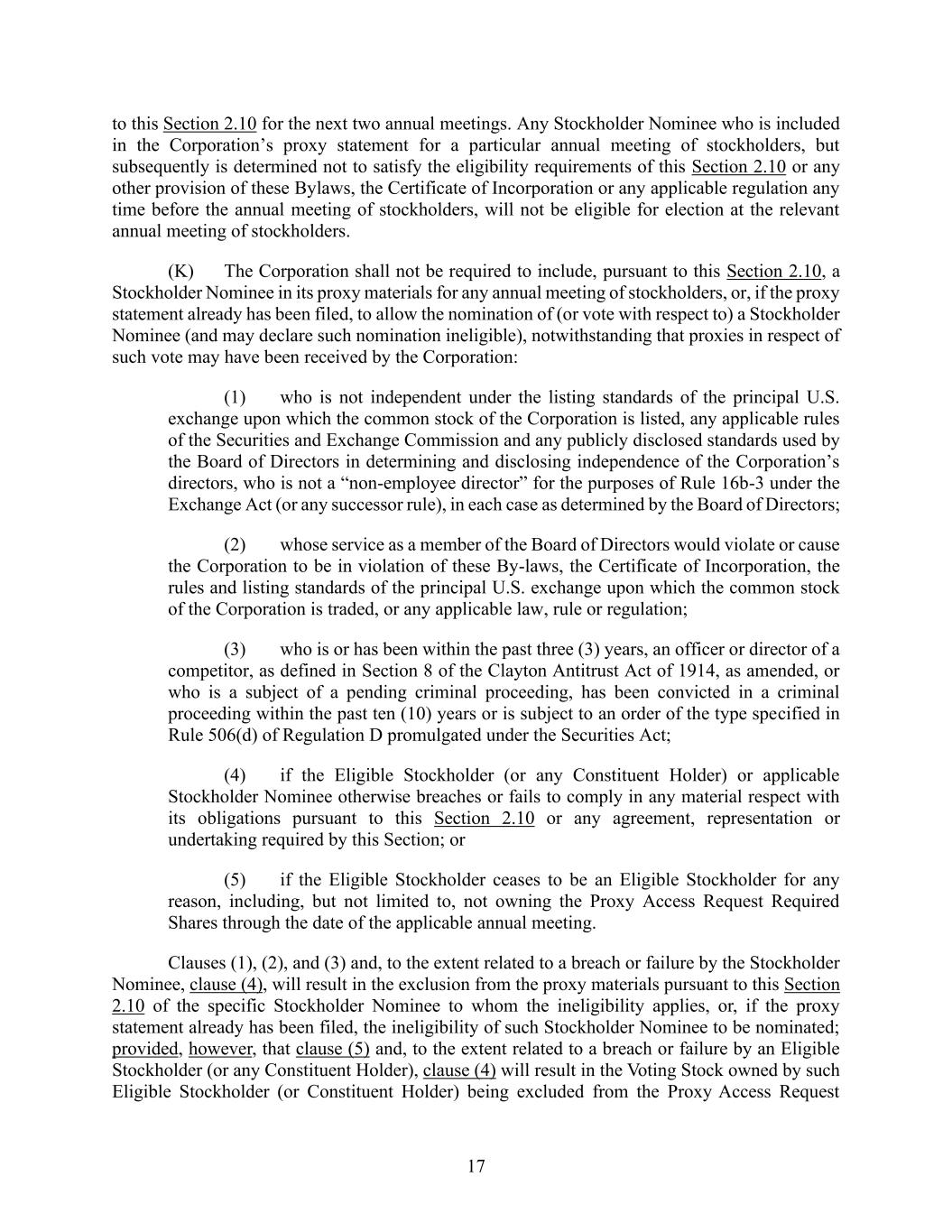 17 to this Section 2.10 for the next two annual meetings. Any Stockholder Nominee who is included in the Corporation’s proxy statement for a particular annual meeting of stockholders, but subsequently is determined not to satisfy the eligibility requirements of this Section 2.10 or any other provision of these Bylaws, the Certificate of Incorporation or any applicable regulation any time before the annual meeting of stockholders, will not be eligible for election at the relevant annual meeting of stockholders. (K) The Corporation shall not be required to include, pursuant to this Section 2.10, a Stockholder Nominee in its proxy materials for any annual meeting of stockholders, or, if the proxy statement already has been filed, to allow the nomination of (or vote with respect to) a Stockholder Nominee (and may declare such nomination ineligible), notwithstanding that proxies in respect of such vote may have been received by the Corporation: (1) who is not independent under the listing standards of the principal U.S. exchange upon which the common stock of the Corporation is listed, any applicable rules of the Securities and Exchange Commission and any publicly disclosed standards used by the Board of Directors in determining and disclosing independence of the Corporation’s directors, who is not a “non-employee director” for the purposes of Rule 16b-3 under the Exchange Act (or any successor rule), in each case as determined by the Board of Directors; (2) whose service as a member of the Board of Directors would violate or cause the Corporation to be in violation of these By-laws, the Certificate of Incorporation, the rules and listing standards of the principal U.S. exchange upon which the common stock of the Corporation is traded, or any applicable law, rule or regulation; (3) who is or has been within the past three (3) years, an officer or director of a competitor, as defined in Section 8 of the Clayton Antitrust Act of 1914, as amended, or who is a subject of a pending criminal proceeding, has been convicted in a criminal proceeding within the past ten (10) years or is subject to an order of the type specified in Rule 506(d) of Regulation D promulgated under the Securities Act; (4) if the Eligible Stockholder (or any Constituent Holder) or applicable Stockholder Nominee otherwise breaches or fails to comply in any material respect with its obligations pursuant to this Section 2.10 or any agreement, representation or undertaking required by this Section; or (5) if the Eligible Stockholder ceases to be an Eligible Stockholder for any reason, including, but not limited to, not owning the Proxy Access Request Required Shares through the date of the applicable annual meeting. Clauses (1), (2), and (3) and, to the extent related to a breach or failure by the Stockholder Nominee, clause (4), will result in the exclusion from the proxy materials pursuant to this Section 2.10 of the specific Stockholder Nominee to whom the ineligibility applies, or, if the proxy statement already has been filed, the ineligibility of such Stockholder Nominee to be nominated; provided, however, that clause (5) and, to the extent related to a breach or failure by an Eligible Stockholder (or any Constituent Holder), clause (4) will result in the Voting Stock owned by such Eligible Stockholder (or Constituent Holder) being excluded from the Proxy Access Request