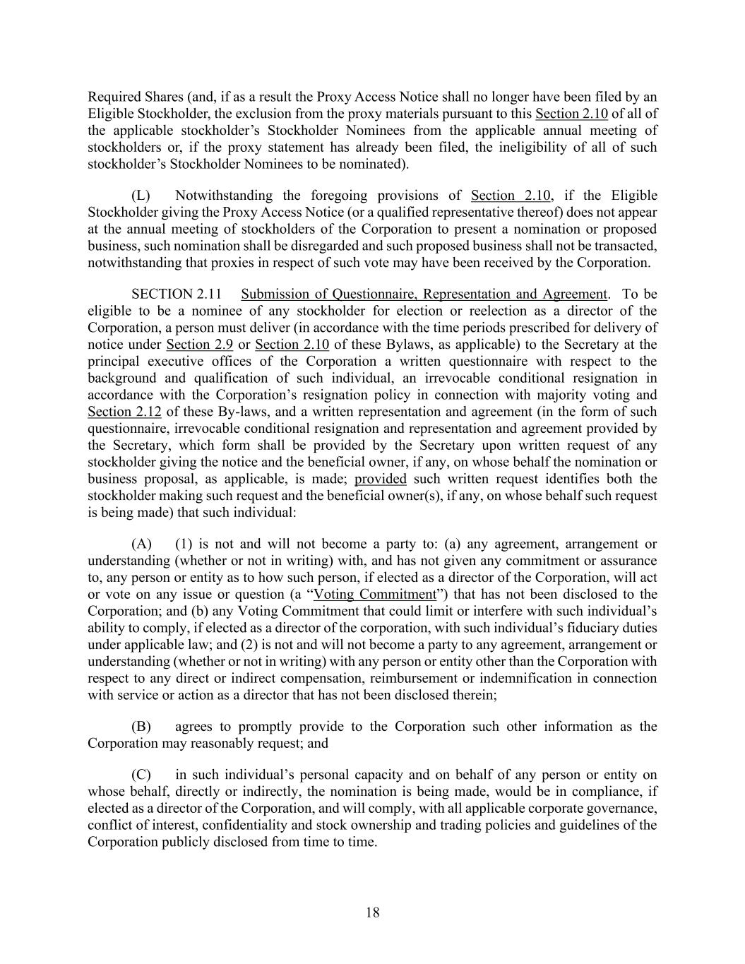 18 Required Shares (and, if as a result the Proxy Access Notice shall no longer have been filed by an Eligible Stockholder, the exclusion from the proxy materials pursuant to this Section 2.10 of all of the applicable stockholder’s Stockholder Nominees from the applicable annual meeting of stockholders or, if the proxy statement has already been filed, the ineligibility of all of such stockholder’s Stockholder Nominees to be nominated). (L) Notwithstanding the foregoing provisions of Section 2.10, if the Eligible Stockholder giving the Proxy Access Notice (or a qualified representative thereof) does not appear at the annual meeting of stockholders of the Corporation to present a nomination or proposed business, such nomination shall be disregarded and such proposed business shall not be transacted, notwithstanding that proxies in respect of such vote may have been received by the Corporation. SECTION 2.11 Submission of Questionnaire, Representation and Agreement. To be eligible to be a nominee of any stockholder for election or reelection as a director of the Corporation, a person must deliver (in accordance with the time periods prescribed for delivery of notice under Section 2.9 or Section 2.10 of these Bylaws, as applicable) to the Secretary at the principal executive offices of the Corporation a written questionnaire with respect to the background and qualification of such individual, an irrevocable conditional resignation in accordance with the Corporation’s resignation policy in connection with majority voting and Section 2.12 of these By-laws, and a written representation and agreement (in the form of such questionnaire, irrevocable conditional resignation and representation and agreement provided by the Secretary, which form shall be provided by the Secretary upon written request of any stockholder giving the notice and the beneficial owner, if any, on whose behalf the nomination or business proposal, as applicable, is made; provided such written request identifies both the stockholder making such request and the beneficial owner(s), if any, on whose behalf such request is being made) that such individual: (A) (1) is not and will not become a party to: (a) any agreement, arrangement or understanding (whether or not in writing) with, and has not given any commitment or assurance to, any person or entity as to how such person, if elected as a director of the Corporation, will act or vote on any issue or question (a “Voting Commitment”) that has not been disclosed to the Corporation; and (b) any Voting Commitment that could limit or interfere with such individual’s ability to comply, if elected as a director of the corporation, with such individual’s fiduciary duties under applicable law; and (2) is not and will not become a party to any agreement, arrangement or understanding (whether or not in writing) with any person or entity other than the Corporation with respect to any direct or indirect compensation, reimbursement or indemnification in connection with service or action as a director that has not been disclosed therein; (B) agrees to promptly provide to the Corporation such other information as the Corporation may reasonably request; and (C) in such individual’s personal capacity and on behalf of any person or entity on whose behalf, directly or indirectly, the nomination is being made, would be in compliance, if elected as a director of the Corporation, and will comply, with all applicable corporate governance, conflict of interest, confidentiality and stock ownership and trading policies and guidelines of the Corporation publicly disclosed from time to time.
