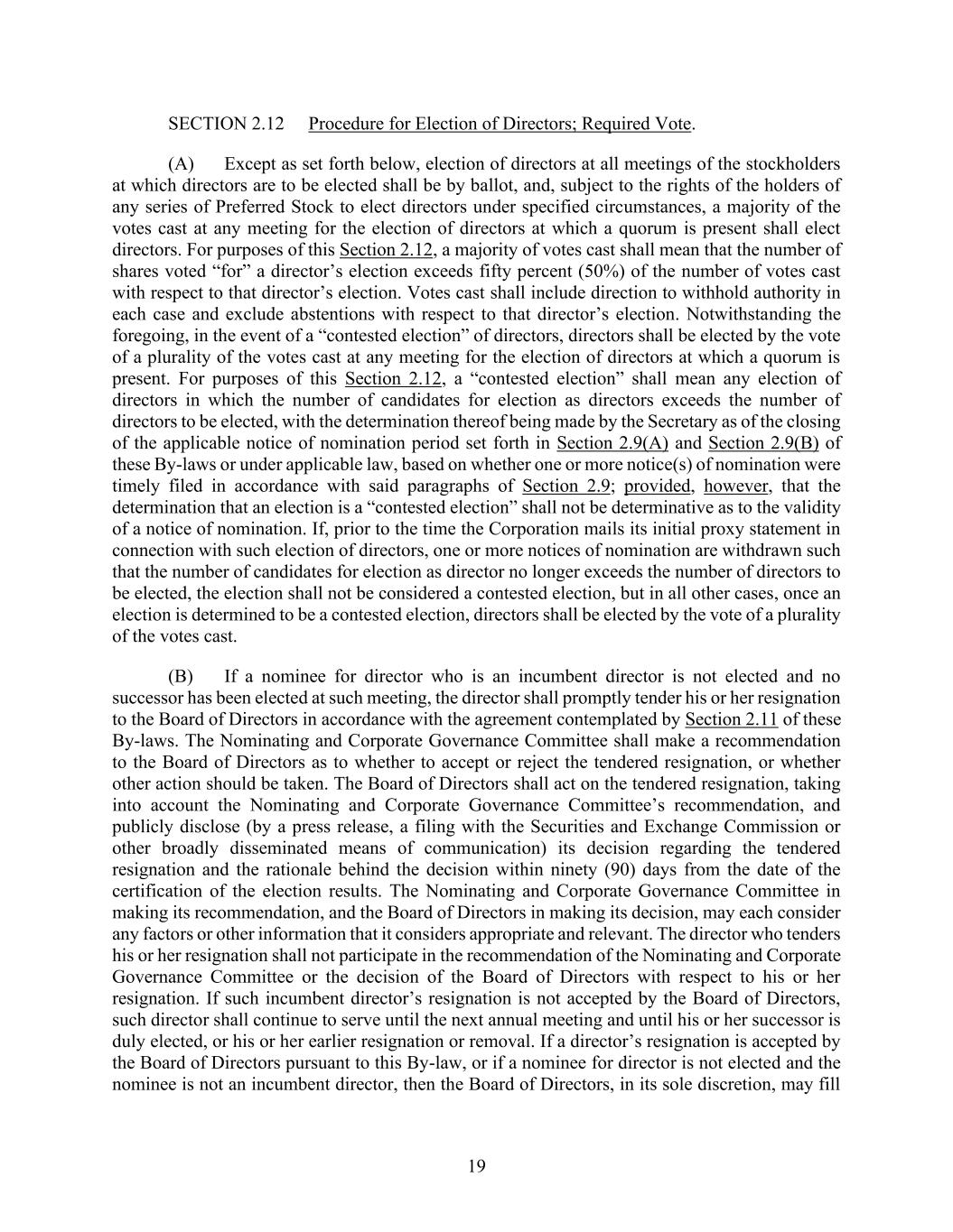 19 SECTION 2.12 Procedure for Election of Directors; Required Vote. (A) Except as set forth below, election of directors at all meetings of the stockholders at which directors are to be elected shall be by ballot, and, subject to the rights of the holders of any series of Preferred Stock to elect directors under specified circumstances, a majority of the votes cast at any meeting for the election of directors at which a quorum is present shall elect directors. For purposes of this Section 2.12, a majority of votes cast shall mean that the number of shares voted “for” a director’s election exceeds fifty percent (50%) of the number of votes cast with respect to that director’s election. Votes cast shall include direction to withhold authority in each case and exclude abstentions with respect to that director’s election. Notwithstanding the foregoing, in the event of a “contested election” of directors, directors shall be elected by the vote of a plurality of the votes cast at any meeting for the election of directors at which a quorum is present. For purposes of this Section 2.12, a “contested election” shall mean any election of directors in which the number of candidates for election as directors exceeds the number of directors to be elected, with the determination thereof being made by the Secretary as of the closing of the applicable notice of nomination period set forth in Section 2.9(A) and Section 2.9(B) of these By-laws or under applicable law, based on whether one or more notice(s) of nomination were timely filed in accordance with said paragraphs of Section 2.9; provided, however, that the determination that an election is a “contested election” shall not be determinative as to the validity of a notice of nomination. If, prior to the time the Corporation mails its initial proxy statement in connection with such election of directors, one or more notices of nomination are withdrawn such that the number of candidates for election as director no longer exceeds the number of directors to be elected, the election shall not be considered a contested election, but in all other cases, once an election is determined to be a contested election, directors shall be elected by the vote of a plurality of the votes cast. (B) If a nominee for director who is an incumbent director is not elected and no successor has been elected at such meeting, the director shall promptly tender his or her resignation to the Board of Directors in accordance with the agreement contemplated by Section 2.11 of these By-laws. The Nominating and Corporate Governance Committee shall make a recommendation to the Board of Directors as to whether to accept or reject the tendered resignation, or whether other action should be taken. The Board of Directors shall act on the tendered resignation, taking into account the Nominating and Corporate Governance Committee’s recommendation, and publicly disclose (by a press release, a filing with the Securities and Exchange Commission or other broadly disseminated means of communication) its decision regarding the tendered resignation and the rationale behind the decision within ninety (90) days from the date of the certification of the election results. The Nominating and Corporate Governance Committee in making its recommendation, and the Board of Directors in making its decision, may each consider any factors or other information that it considers appropriate and relevant. The director who tenders his or her resignation shall not participate in the recommendation of the Nominating and Corporate Governance Committee or the decision of the Board of Directors with respect to his or her resignation. If such incumbent director’s resignation is not accepted by the Board of Directors, such director shall continue to serve until the next annual meeting and until his or her successor is duly elected, or his or her earlier resignation or removal. If a director’s resignation is accepted by the Board of Directors pursuant to this By-law, or if a nominee for director is not elected and the nominee is not an incumbent director, then the Board of Directors, in its sole discretion, may fill