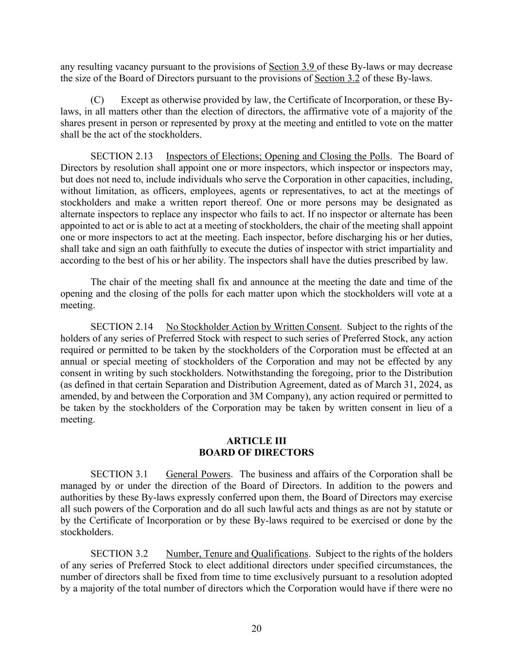 20 any resulting vacancy pursuant to the provisions of Section 3.9 of these By-laws or may decrease the size of the Board of Directors pursuant to the provisions of Section 3.2 of these By-laws. (C) Except as otherwise provided by law, the Certificate of Incorporation, or these By- laws, in all matters other than the election of directors, the affirmative vote of a majority of the shares present in person or represented by proxy at the meeting and entitled to vote on the matter shall be the act of the stockholders. SECTION 2.13 Inspectors of Elections; Opening and Closing the Polls. The Board of Directors by resolution shall appoint one or more inspectors, which inspector or inspectors may, but does not need to, include individuals who serve the Corporation in other capacities, including, without limitation, as officers, employees, agents or representatives, to act at the meetings of stockholders and make a written report thereof. One or more persons may be designated as alternate inspectors to replace any inspector who fails to act. If no inspector or alternate has been appointed to act or is able to act at a meeting of stockholders, the chair of the meeting shall appoint one or more inspectors to act at the meeting. Each inspector, before discharging his or her duties, shall take and sign an oath faithfully to execute the duties of inspector with strict impartiality and according to the best of his or her ability. The inspectors shall have the duties prescribed by law. The chair of the meeting shall fix and announce at the meeting the date and time of the opening and the closing of the polls for each matter upon which the stockholders will vote at a meeting. SECTION 2.14 No Stockholder Action by Written Consent. Subject to the rights of the holders of any series of Preferred Stock with respect to such series of Preferred Stock, any action required or permitted to be taken by the stockholders of the Corporation must be effected at an annual or special meeting of stockholders of the Corporation and may not be effected by any consent in writing by such stockholders. Notwithstanding the foregoing, prior to the Distribution (as defined in that certain Separation and Distribution Agreement, dated as of March 31, 2024, as amended, by and between the Corporation and 3M Company), any action required or permitted to be taken by the stockholders of the Corporation may be taken by written consent in lieu of a meeting. ARTICLE III BOARD OF DIRECTORS SECTION 3.1 General Powers. The business and affairs of the Corporation shall be managed by or under the direction of the Board of Directors. In addition to the powers and authorities by these By-laws expressly conferred upon them, the Board of Directors may exercise all such powers of the Corporation and do all such lawful acts and things as are not by statute or by the Certificate of Incorporation or by these By-laws required to be exercised or done by the stockholders. SECTION 3.2 Number, Tenure and Qualifications. Subject to the rights of the holders of any series of Preferred Stock to elect additional directors under specified circumstances, the number of directors shall be fixed from time to time exclusively pursuant to a resolution adopted by a majority of the total number of directors which the Corporation would have if there were no