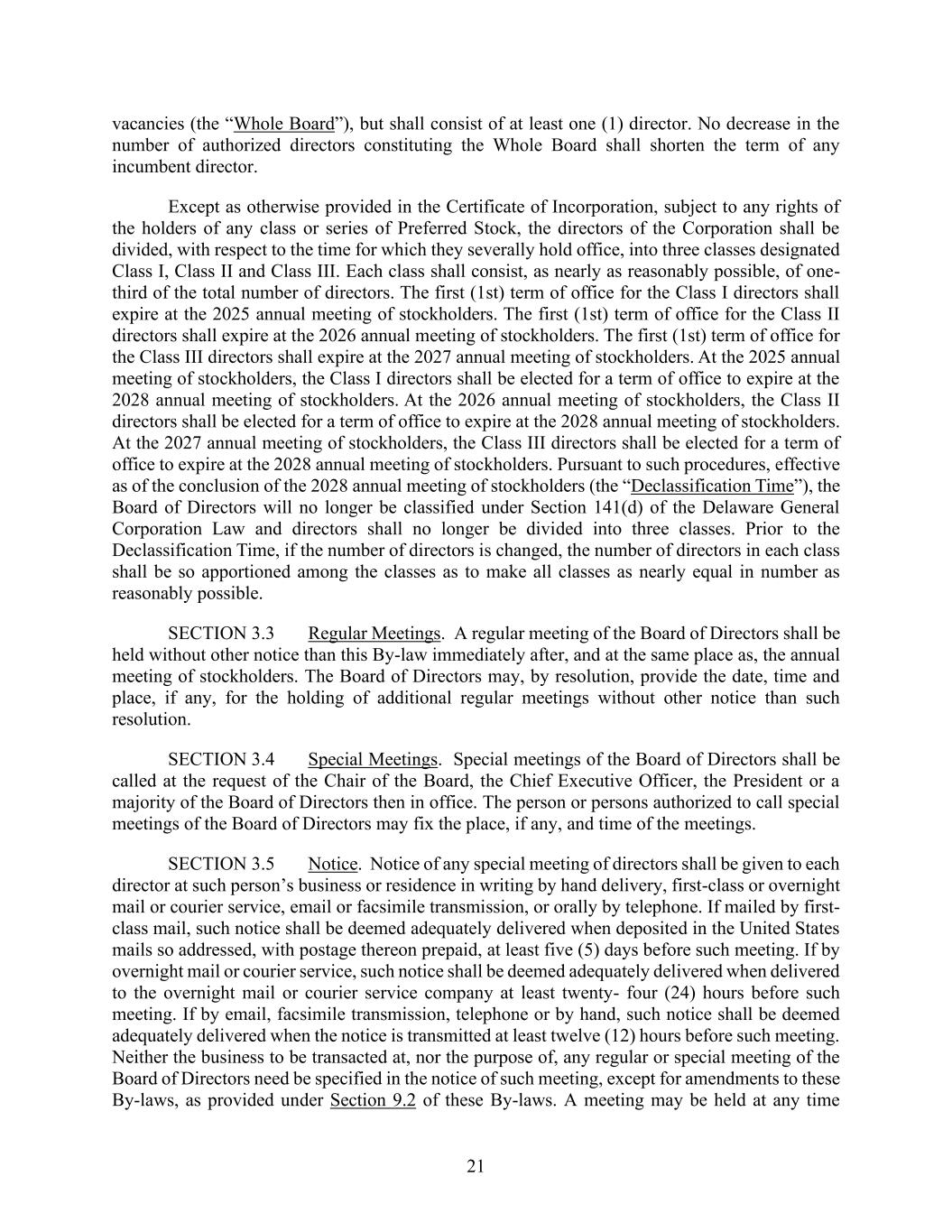 21 vacancies (the “Whole Board”), but shall consist of at least one (1) director. No decrease in the number of authorized directors constituting the Whole Board shall shorten the term of any incumbent director. Except as otherwise provided in the Certificate of Incorporation, subject to any rights of the holders of any class or series of Preferred Stock, the directors of the Corporation shall be divided, with respect to the time for which they severally hold office, into three classes designated Class I, Class II and Class III. Each class shall consist, as nearly as reasonably possible, of one- third of the total number of directors. The first (1st) term of office for the Class I directors shall expire at the 2025 annual meeting of stockholders. The first (1st) term of office for the Class II directors shall expire at the 2026 annual meeting of stockholders. The first (1st) term of office for the Class III directors shall expire at the 2027 annual meeting of stockholders. At the 2025 annual meeting of stockholders, the Class I directors shall be elected for a term of office to expire at the 2028 annual meeting of stockholders. At the 2026 annual meeting of stockholders, the Class II directors shall be elected for a term of office to expire at the 2028 annual meeting of stockholders. At the 2027 annual meeting of stockholders, the Class III directors shall be elected for a term of office to expire at the 2028 annual meeting of stockholders. Pursuant to such procedures, effective as of the conclusion of the 2028 annual meeting of stockholders (the “Declassification Time”), the Board of Directors will no longer be classified under Section 141(d) of the Delaware General Corporation Law and directors shall no longer be divided into three classes. Prior to the Declassification Time, if the number of directors is changed, the number of directors in each class shall be so apportioned among the classes as to make all classes as nearly equal in number as reasonably possible. SECTION 3.3 Regular Meetings. A regular meeting of the Board of Directors shall be held without other notice than this By-law immediately after, and at the same place as, the annual meeting of stockholders. The Board of Directors may, by resolution, provide the date, time and place, if any, for the holding of additional regular meetings without other notice than such resolution. SECTION 3.4 Special Meetings. Special meetings of the Board of Directors shall be called at the request of the Chair of the Board, the Chief Executive Officer, the President or a majority of the Board of Directors then in office. The person or persons authorized to call special meetings of the Board of Directors may fix the place, if any, and time of the meetings. SECTION 3.5 Notice. Notice of any special meeting of directors shall be given to each director at such person’s business or residence in writing by hand delivery, first-class or overnight mail or courier service, email or facsimile transmission, or orally by telephone. If mailed by first- class mail, such notice shall be deemed adequately delivered when deposited in the United States mails so addressed, with postage thereon prepaid, at least five (5) days before such meeting. If by overnight mail or courier service, such notice shall be deemed adequately delivered when delivered to the overnight mail or courier service company at least twenty- four (24) hours before such meeting. If by email, facsimile transmission, telephone or by hand, such notice shall be deemed adequately delivered when the notice is transmitted at least twelve (12) hours before such meeting. Neither the business to be transacted at, nor the purpose of, any regular or special meeting of the Board of Directors need be specified in the notice of such meeting, except for amendments to these By-laws, as provided under Section 9.2 of these By-laws. A meeting may be held at any time