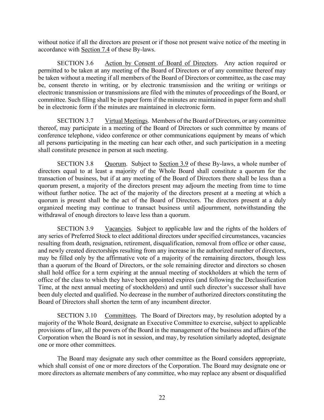 22 without notice if all the directors are present or if those not present waive notice of the meeting in accordance with Section 7.4 of these By-laws. SECTION 3.6 Action by Consent of Board of Directors. Any action required or permitted to be taken at any meeting of the Board of Directors or of any committee thereof may be taken without a meeting if all members of the Board of Directors or committee, as the case may be, consent thereto in writing, or by electronic transmission and the writing or writings or electronic transmission or transmissions are filed with the minutes of proceedings of the Board, or committee. Such filing shall be in paper form if the minutes are maintained in paper form and shall be in electronic form if the minutes are maintained in electronic form. SECTION 3.7 Virtual Meetings. Members of the Board of Directors, or any committee thereof, may participate in a meeting of the Board of Directors or such committee by means of conference telephone, video conference or other communications equipment by means of which all persons participating in the meeting can hear each other, and such participation in a meeting shall constitute presence in person at such meeting. SECTION 3.8 Quorum. Subject to Section 3.9 of these By-laws, a whole number of directors equal to at least a majority of the Whole Board shall constitute a quorum for the transaction of business, but if at any meeting of the Board of Directors there shall be less than a quorum present, a majority of the directors present may adjourn the meeting from time to time without further notice. The act of the majority of the directors present at a meeting at which a quorum is present shall be the act of the Board of Directors. The directors present at a duly organized meeting may continue to transact business until adjournment, notwithstanding the withdrawal of enough directors to leave less than a quorum. SECTION 3.9 Vacancies. Subject to applicable law and the rights of the holders of any series of Preferred Stock to elect additional directors under specified circumstances, vacancies resulting from death, resignation, retirement, disqualification, removal from office or other cause, and newly created directorships resulting from any increase in the authorized number of directors, may be filled only by the affirmative vote of a majority of the remaining directors, though less than a quorum of the Board of Directors, or the sole remaining director and directors so chosen shall hold office for a term expiring at the annual meeting of stockholders at which the term of office of the class to which they have been appointed expires (and following the Declassification Time, at the next annual meeting of stockholders) and until such director’s successor shall have been duly elected and qualified. No decrease in the number of authorized directors constituting the Board of Directors shall shorten the term of any incumbent director. SECTION 3.10 Committees. The Board of Directors may, by resolution adopted by a majority of the Whole Board, designate an Executive Committee to exercise, subject to applicable provisions of law, all the powers of the Board in the management of the business and affairs of the Corporation when the Board is not in session, and may, by resolution similarly adopted, designate one or more other committees. The Board may designate any such other committee as the Board considers appropriate, which shall consist of one or more directors of the Corporation. The Board may designate one or more directors as alternate members of any committee, who may replace any absent or disqualified