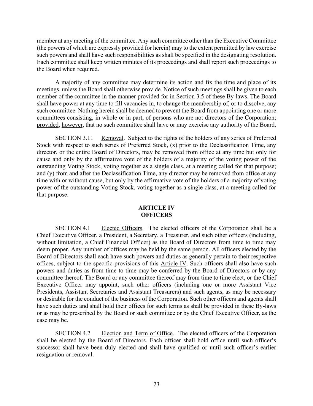 23 member at any meeting of the committee. Any such committee other than the Executive Committee (the powers of which are expressly provided for herein) may to the extent permitted by law exercise such powers and shall have such responsibilities as shall be specified in the designating resolution. Each committee shall keep written minutes of its proceedings and shall report such proceedings to the Board when required. A majority of any committee may determine its action and fix the time and place of its meetings, unless the Board shall otherwise provide. Notice of such meetings shall be given to each member of the committee in the manner provided for in Section 3.5 of these By-laws. The Board shall have power at any time to fill vacancies in, to change the membership of, or to dissolve, any such committee. Nothing herein shall be deemed to prevent the Board from appointing one or more committees consisting, in whole or in part, of persons who are not directors of the Corporation; provided, however, that no such committee shall have or may exercise any authority of the Board. SECTION 3.11 Removal. Subject to the rights of the holders of any series of Preferred Stock with respect to such series of Preferred Stock, (x) prior to the Declassification Time, any director, or the entire Board of Directors, may be removed from office at any time but only for cause and only by the affirmative vote of the holders of a majority of the voting power of the outstanding Voting Stock, voting together as a single class, at a meeting called for that purpose; and (y) from and after the Declassification Time, any director may be removed from office at any time with or without cause, but only by the affirmative vote of the holders of a majority of voting power of the outstanding Voting Stock, voting together as a single class, at a meeting called for that purpose. ARTICLE IV OFFICERS SECTION 4.1 Elected Officers. The elected officers of the Corporation shall be a Chief Executive Officer, a President, a Secretary, a Treasurer, and such other officers (including, without limitation, a Chief Financial Officer) as the Board of Directors from time to time may deem proper. Any number of offices may be held by the same person. All officers elected by the Board of Directors shall each have such powers and duties as generally pertain to their respective offices, subject to the specific provisions of this Article IV. Such officers shall also have such powers and duties as from time to time may be conferred by the Board of Directors or by any committee thereof. The Board or any committee thereof may from time to time elect, or the Chief Executive Officer may appoint, such other officers (including one or more Assistant Vice Presidents, Assistant Secretaries and Assistant Treasurers) and such agents, as may be necessary or desirable for the conduct of the business of the Corporation. Such other officers and agents shall have such duties and shall hold their offices for such terms as shall be provided in these By-laws or as may be prescribed by the Board or such committee or by the Chief Executive Officer, as the case may be. SECTION 4.2 Election and Term of Office. The elected officers of the Corporation shall be elected by the Board of Directors. Each officer shall hold office until such officer’s successor shall have been duly elected and shall have qualified or until such officer’s earlier resignation or removal.