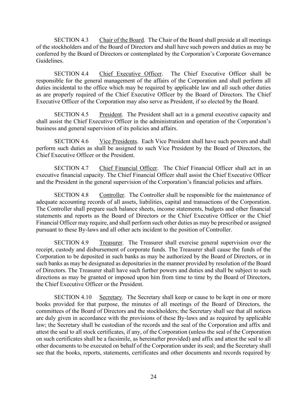 24 SECTION 4.3 Chair of the Board. The Chair of the Board shall preside at all meetings of the stockholders and of the Board of Directors and shall have such powers and duties as may be conferred by the Board of Directors or contemplated by the Corporation’s Corporate Governance Guidelines. SECTION 4.4 Chief Executive Officer. The Chief Executive Officer shall be responsible for the general management of the affairs of the Corporation and shall perform all duties incidental to the office which may be required by applicable law and all such other duties as are properly required of the Chief Executive Officer by the Board of Directors. The Chief Executive Officer of the Corporation may also serve as President, if so elected by the Board. SECTION 4.5 President. The President shall act in a general executive capacity and shall assist the Chief Executive Officer in the administration and operation of the Corporation’s business and general supervision of its policies and affairs. SECTION 4.6 Vice Presidents. Each Vice President shall have such powers and shall perform such duties as shall be assigned to such Vice President by the Board of Directors, the Chief Executive Officer or the President. SECTION 4.7 Chief Financial Officer. The Chief Financial Officer shall act in an executive financial capacity. The Chief Financial Officer shall assist the Chief Executive Officer and the President in the general supervision of the Corporation’s financial policies and affairs. SECTION 4.8 Controller. The Controller shall be responsible for the maintenance of adequate accounting records of all assets, liabilities, capital and transactions of the Corporation. The Controller shall prepare such balance sheets, income statements, budgets and other financial statements and reports as the Board of Directors or the Chief Executive Officer or the Chief Financial Officer may require, and shall perform such other duties as may be prescribed or assigned pursuant to these By-laws and all other acts incident to the position of Controller. SECTION 4.9 Treasurer. The Treasurer shall exercise general supervision over the receipt, custody and disbursement of corporate funds. The Treasurer shall cause the funds of the Corporation to be deposited in such banks as may be authorized by the Board of Directors, or in such banks as may be designated as depositaries in the manner provided by resolution of the Board of Directors. The Treasurer shall have such further powers and duties and shall be subject to such directions as may be granted or imposed upon him from time to time by the Board of Directors, the Chief Executive Officer or the President. SECTION 4.10 Secretary. The Secretary shall keep or cause to be kept in one or more books provided for that purpose, the minutes of all meetings of the Board of Directors, the committees of the Board of Directors and the stockholders; the Secretary shall see that all notices are duly given in accordance with the provisions of these By-laws and as required by applicable law; the Secretary shall be custodian of the records and the seal of the Corporation and affix and attest the seal to all stock certificates, if any, of the Corporation (unless the seal of the Corporation on such certificates shall be a facsimile, as hereinafter provided) and affix and attest the seal to all other documents to be executed on behalf of the Corporation under its seal; and the Secretary shall see that the books, reports, statements, certificates and other documents and records required by