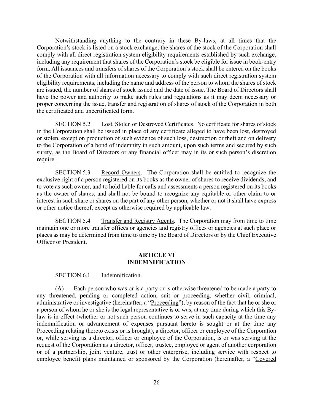 26 Notwithstanding anything to the contrary in these By-laws, at all times that the Corporation’s stock is listed on a stock exchange, the shares of the stock of the Corporation shall comply with all direct registration system eligibility requirements established by such exchange, including any requirement that shares of the Corporation’s stock be eligible for issue in book-entry form. All issuances and transfers of shares of the Corporation’s stock shall be entered on the books of the Corporation with all information necessary to comply with such direct registration system eligibility requirements, including the name and address of the person to whom the shares of stock are issued, the number of shares of stock issued and the date of issue. The Board of Directors shall have the power and authority to make such rules and regulations as it may deem necessary or proper concerning the issue, transfer and registration of shares of stock of the Corporation in both the certificated and uncertificated form. SECTION 5.2 Lost, Stolen or Destroyed Certificates. No certificate for shares of stock in the Corporation shall be issued in place of any certificate alleged to have been lost, destroyed or stolen, except on production of such evidence of such loss, destruction or theft and on delivery to the Corporation of a bond of indemnity in such amount, upon such terms and secured by such surety, as the Board of Directors or any financial officer may in its or such person’s discretion require. SECTION 5.3 Record Owners. The Corporation shall be entitled to recognize the exclusive right of a person registered on its books as the owner of shares to receive dividends, and to vote as such owner, and to hold liable for calls and assessments a person registered on its books as the owner of shares, and shall not be bound to recognize any equitable or other claim to or interest in such share or shares on the part of any other person, whether or not it shall have express or other notice thereof, except as otherwise required by applicable law. SECTION 5.4 Transfer and Registry Agents. The Corporation may from time to time maintain one or more transfer offices or agencies and registry offices or agencies at such place or places as may be determined from time to time by the Board of Directors or by the Chief Executive Officer or President. ARTICLE VI INDEMNIFICATION SECTION 6.1 Indemnification. (A) Each person who was or is a party or is otherwise threatened to be made a party to any threatened, pending or completed action, suit or proceeding, whether civil, criminal, administrative or investigative (hereinafter, a “Proceeding”), by reason of the fact that he or she or a person of whom he or she is the legal representative is or was, at any time during which this By- law is in effect (whether or not such person continues to serve in such capacity at the time any indemnification or advancement of expenses pursuant hereto is sought or at the time any Proceeding relating thereto exists or is brought), a director, officer or employee of the Corporation or, while serving as a director, officer or employee of the Corporation, is or was serving at the request of the Corporation as a director, officer, trustee, employee or agent of another corporation or of a partnership, joint venture, trust or other enterprise, including service with respect to employee benefit plans maintained or sponsored by the Corporation (hereinafter, a “Covered