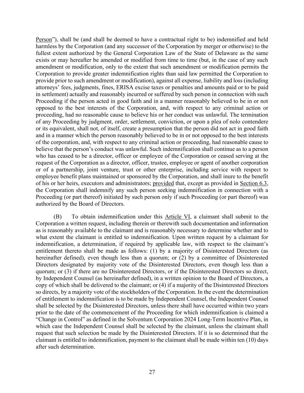 27 Person”), shall be (and shall be deemed to have a contractual right to be) indemnified and held harmless by the Corporation (and any successor of the Corporation by merger or otherwise) to the fullest extent authorized by the General Corporation Law of the State of Delaware as the same exists or may hereafter be amended or modified from time to time (but, in the case of any such amendment or modification, only to the extent that such amendment or modification permits the Corporation to provide greater indemnification rights than said law permitted the Corporation to provide prior to such amendment or modification), against all expense, liability and loss (including attorneys’ fees, judgments, fines, ERISA excise taxes or penalties and amounts paid or to be paid in settlement) actually and reasonably incurred or suffered by such person in connection with such Proceeding if the person acted in good faith and in a manner reasonably believed to be in or not opposed to the best interests of the Corporation, and, with respect to any criminal action or proceeding, had no reasonable cause to believe his or her conduct was unlawful. The termination of any Proceeding by judgment, order, settlement, conviction, or upon a plea of nolo contendere or its equivalent, shall not, of itself, create a presumption that the person did not act in good faith and in a manner which the person reasonably believed to be in or not opposed to the best interests of the corporation, and, with respect to any criminal action or proceeding, had reasonable cause to believe that the person’s conduct was unlawful. Such indemnification shall continue as to a person who has ceased to be a director, officer or employee of the Corporation or ceased serving at the request of the Corporation as a director, officer, trustee, employee or agent of another corporation or of a partnership, joint venture, trust or other enterprise, including service with respect to employee benefit plans maintained or sponsored by the Corporation, and shall inure to the benefit of his or her heirs, executors and administrators; provided that, except as provided in Section 6.3, the Corporation shall indemnify any such person seeking indemnification in connection with a Proceeding (or part thereof) initiated by such person only if such Proceeding (or part thereof) was authorized by the Board of Directors. (B) To obtain indemnification under this Article VI, a claimant shall submit to the Corporation a written request, including therein or therewith such documentation and information as is reasonably available to the claimant and is reasonably necessary to determine whether and to what extent the claimant is entitled to indemnification. Upon written request by a claimant for indemnification, a determination, if required by applicable law, with respect to the claimant’s entitlement thereto shall be made as follows: (1) by a majority of Disinterested Directors (as hereinafter defined), even though less than a quorum; or (2) by a committee of Disinterested Directors designated by majority vote of the Disinterested Directors, even though less than a quorum; or (3) if there are no Disinterested Directors, or if the Disinterested Directors so direct, by Independent Counsel (as hereinafter defined), in a written opinion to the Board of Directors, a copy of which shall be delivered to the claimant; or (4) if a majority of the Disinterested Directors so directs, by a majority vote of the stockholders of the Corporation. In the event the determination of entitlement to indemnification is to be made by Independent Counsel, the Independent Counsel shall be selected by the Disinterested Directors, unless there shall have occurred within two years prior to the date of the commencement of the Proceeding for which indemnification is claimed a “Change in Control” as defined in the Solventum Corporation 2024 Long-Term Incentive Plan, in which case the Independent Counsel shall be selected by the claimant, unless the claimant shall request that such selection be made by the Disinterested Directors. If it is so determined that the claimant is entitled to indemnification, payment to the claimant shall be made within ten (10) days after such determination.