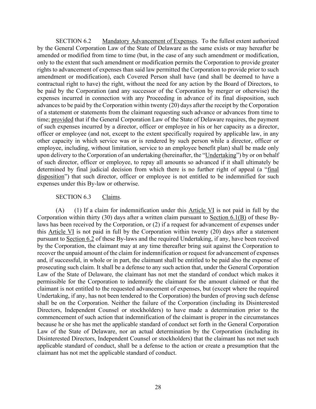 28 SECTION 6.2 Mandatory Advancement of Expenses. To the fullest extent authorized by the General Corporation Law of the State of Delaware as the same exists or may hereafter be amended or modified from time to time (but, in the case of any such amendment or modification, only to the extent that such amendment or modification permits the Corporation to provide greater rights to advancement of expenses than said law permitted the Corporation to provide prior to such amendment or modification), each Covered Person shall have (and shall be deemed to have a contractual right to have) the right, without the need for any action by the Board of Directors, to be paid by the Corporation (and any successor of the Corporation by merger or otherwise) the expenses incurred in connection with any Proceeding in advance of its final disposition, such advances to be paid by the Corporation within twenty (20) days after the receipt by the Corporation of a statement or statements from the claimant requesting such advance or advances from time to time; provided that if the General Corporation Law of the State of Delaware requires, the payment of such expenses incurred by a director, officer or employee in his or her capacity as a director, officer or employee (and not, except to the extent specifically required by applicable law, in any other capacity in which service was or is rendered by such person while a director, officer or employee, including, without limitation, service to an employee benefit plan) shall be made only upon delivery to the Corporation of an undertaking (hereinafter, the “Undertaking”) by or on behalf of such director, officer or employee, to repay all amounts so advanced if it shall ultimately be determined by final judicial decision from which there is no further right of appeal (a “final disposition”) that such director, officer or employee is not entitled to be indemnified for such expenses under this By-law or otherwise. SECTION 6.3 Claims. (A) (1) If a claim for indemnification under this Article VI is not paid in full by the Corporation within thirty (30) days after a written claim pursuant to Section 6.1(B) of these By- laws has been received by the Corporation, or (2) if a request for advancement of expenses under this Article VI is not paid in full by the Corporation within twenty (20) days after a statement pursuant to Section 6.2 of these By-laws and the required Undertaking, if any, have been received by the Corporation, the claimant may at any time thereafter bring suit against the Corporation to recover the unpaid amount of the claim for indemnification or request for advancement of expenses and, if successful, in whole or in part, the claimant shall be entitled to be paid also the expense of prosecuting such claim. It shall be a defense to any such action that, under the General Corporation Law of the State of Delaware, the claimant has not met the standard of conduct which makes it permissible for the Corporation to indemnify the claimant for the amount claimed or that the claimant is not entitled to the requested advancement of expenses, but (except where the required Undertaking, if any, has not been tendered to the Corporation) the burden of proving such defense shall be on the Corporation. Neither the failure of the Corporation (including its Disinterested Directors, Independent Counsel or stockholders) to have made a determination prior to the commencement of such action that indemnification of the claimant is proper in the circumstances because he or she has met the applicable standard of conduct set forth in the General Corporation Law of the State of Delaware, nor an actual determination by the Corporation (including its Disinterested Directors, Independent Counsel or stockholders) that the claimant has not met such applicable standard of conduct, shall be a defense to the action or create a presumption that the claimant has not met the applicable standard of conduct.