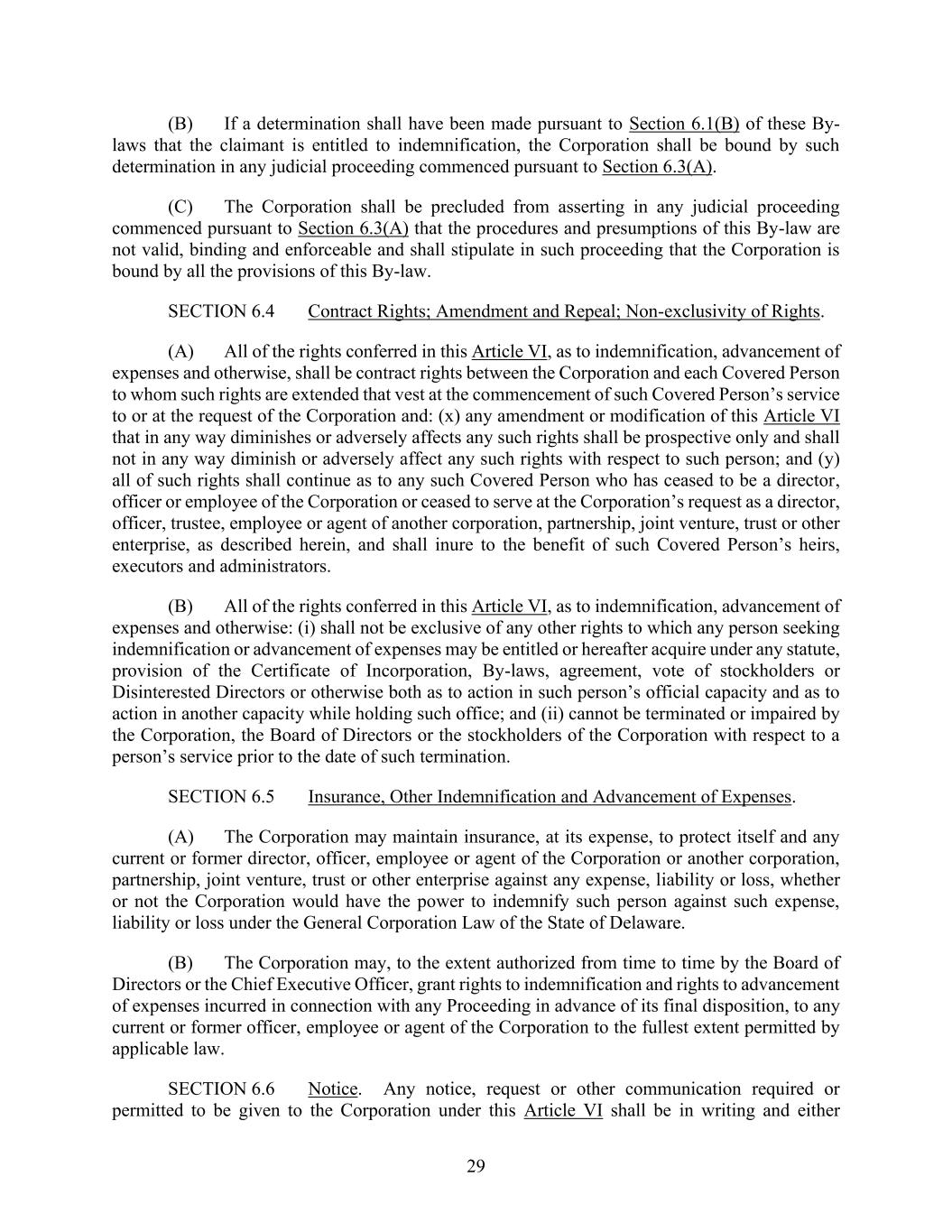 29 (B) If a determination shall have been made pursuant to Section 6.1(B) of these By- laws that the claimant is entitled to indemnification, the Corporation shall be bound by such determination in any judicial proceeding commenced pursuant to Section 6.3(A). (C) The Corporation shall be precluded from asserting in any judicial proceeding commenced pursuant to Section 6.3(A) that the procedures and presumptions of this By-law are not valid, binding and enforceable and shall stipulate in such proceeding that the Corporation is bound by all the provisions of this By-law. SECTION 6.4 Contract Rights; Amendment and Repeal; Non-exclusivity of Rights. (A) All of the rights conferred in this Article VI, as to indemnification, advancement of expenses and otherwise, shall be contract rights between the Corporation and each Covered Person to whom such rights are extended that vest at the commencement of such Covered Person’s service to or at the request of the Corporation and: (x) any amendment or modification of this Article VI that in any way diminishes or adversely affects any such rights shall be prospective only and shall not in any way diminish or adversely affect any such rights with respect to such person; and (y) all of such rights shall continue as to any such Covered Person who has ceased to be a director, officer or employee of the Corporation or ceased to serve at the Corporation’s request as a director, officer, trustee, employee or agent of another corporation, partnership, joint venture, trust or other enterprise, as described herein, and shall inure to the benefit of such Covered Person’s heirs, executors and administrators. (B) All of the rights conferred in this Article VI, as to indemnification, advancement of expenses and otherwise: (i) shall not be exclusive of any other rights to which any person seeking indemnification or advancement of expenses may be entitled or hereafter acquire under any statute, provision of the Certificate of Incorporation, By-laws, agreement, vote of stockholders or Disinterested Directors or otherwise both as to action in such person’s official capacity and as to action in another capacity while holding such office; and (ii) cannot be terminated or impaired by the Corporation, the Board of Directors or the stockholders of the Corporation with respect to a person’s service prior to the date of such termination. SECTION 6.5 Insurance, Other Indemnification and Advancement of Expenses. (A) The Corporation may maintain insurance, at its expense, to protect itself and any current or former director, officer, employee or agent of the Corporation or another corporation, partnership, joint venture, trust or other enterprise against any expense, liability or loss, whether or not the Corporation would have the power to indemnify such person against such expense, liability or loss under the General Corporation Law of the State of Delaware. (B) The Corporation may, to the extent authorized from time to time by the Board of Directors or the Chief Executive Officer, grant rights to indemnification and rights to advancement of expenses incurred in connection with any Proceeding in advance of its final disposition, to any current or former officer, employee or agent of the Corporation to the fullest extent permitted by applicable law. SECTION 6.6 Notice. Any notice, request or other communication required or permitted to be given to the Corporation under this Article VI shall be in writing and either