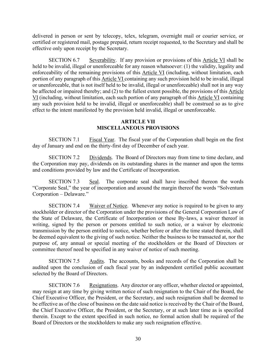 30 delivered in person or sent by telecopy, telex, telegram, overnight mail or courier service, or certified or registered mail, postage prepaid, return receipt requested, to the Secretary and shall be effective only upon receipt by the Secretary. SECTION 6.7 Severability. If any provision or provisions of this Article VI shall be held to be invalid, illegal or unenforceable for any reason whatsoever: (1) the validity, legality and enforceability of the remaining provisions of this Article VI (including, without limitation, each portion of any paragraph of this Article VI containing any such provision held to be invalid, illegal or unenforceable, that is not itself held to be invalid, illegal or unenforceable) shall not in any way be affected or impaired thereby; and (2) to the fullest extent possible, the provisions of this Article VI (including, without limitation, each such portion of any paragraph of this Article VI containing any such provision held to be invalid, illegal or unenforceable) shall be construed so as to give effect to the intent manifested by the provision held invalid, illegal or unenforceable. ARTICLE VII MISCELLANEOUS PROVISIONS SECTION 7.1 Fiscal Year. The fiscal year of the Corporation shall begin on the first day of January and end on the thirty-first day of December of each year. SECTION 7.2 Dividends. The Board of Directors may from time to time declare, and the Corporation may pay, dividends on its outstanding shares in the manner and upon the terms and conditions provided by law and the Certificate of Incorporation. SECTION 7.3 Seal. The corporate seal shall have inscribed thereon the words “Corporate Seal,” the year of incorporation and around the margin thereof the words “Solventum Corporation – Delaware.” SECTION 7.4 Waiver of Notice. Whenever any notice is required to be given to any stockholder or director of the Corporation under the provisions of the General Corporation Law of the State of Delaware, the Certificate of Incorporation or these By-laws, a waiver thereof in writing, signed by the person or persons entitled to such notice, or a waiver by electronic transmission by the person entitled to notice, whether before or after the time stated therein, shall be deemed equivalent to the giving of such notice. Neither the business to be transacted at, nor the purpose of, any annual or special meeting of the stockholders or the Board of Directors or committee thereof need be specified in any waiver of notice of such meeting. SECTION 7.5 Audits. The accounts, books and records of the Corporation shall be audited upon the conclusion of each fiscal year by an independent certified public accountant selected by the Board of Directors. SECTION 7.6 Resignations. Any director or any officer, whether elected or appointed, may resign at any time by giving written notice of such resignation to the Chair of the Board, the Chief Executive Officer, the President, or the Secretary, and such resignation shall be deemed to be effective as of the close of business on the date said notice is received by the Chair of the Board, the Chief Executive Officer, the President, or the Secretary, or at such later time as is specified therein. Except to the extent specified in such notice, no formal action shall be required of the Board of Directors or the stockholders to make any such resignation effective.
