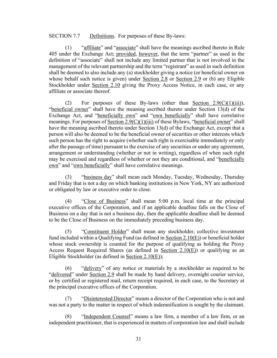 31 SECTION 7.7 Definitions. For purposes of these By-laws: (1) “affiliate” and “associate” shall have the meanings ascribed thereto in Rule 405 under the Exchange Act; provided, however, that the term “partner” as used in the definition of “associate” shall not include any limited partner that is not involved in the management of the relevant partnership and the term “registrant” as used in such definition shall be deemed to also include any (a) stockholder giving a notice (or beneficial owner on whose behalf such notice is given) under Section 2.8 or Section 2.9 or (b) any Eligible Stockholder under Section 2.10 giving the Proxy Access Notice, in each case, or any affiliate or associate thereof. (2) For purposes of these By-laws (other than Section 2.9(C)(1)(iii)), “beneficial owner” shall have the meaning ascribed thereto under Section 13(d) of the Exchange Act, and “beneficially own” and “own beneficially” shall have correlative meanings. For purposes of Section 2.9(C)(1)(iii) of these Bylaws, “beneficial owner” shall have the meaning ascribed thereto under Section 13(d) of the Exchange Act, except that a person will also be deemed to be the beneficial owner of securities or other interests which such person has the right to acquire (whether such right is exercisable immediately or only after the passage of time) pursuant to the exercise of any securities or under any agreement, arrangement or understanding (whether or not in writing), regardless of when such right may be exercised and regardless of whether or not they are conditional, and “beneficially own” and “own beneficially” shall have correlative meanings. (3) “business day” shall mean each Monday, Tuesday, Wednesday, Thursday and Friday that is not a day on which banking institutions in New York, NY are authorized or obligated by law or executive order to close. (4) “Close of Business” shall mean 5:00 p.m. local time at the principal executive offices of the Corporation, and if an applicable deadline falls on the Close of Business on a day that is not a business day, then the applicable deadline shall be deemed to be the Close of Business on the immediately preceding business day. (5) “Constituent Holder” shall mean any stockholder, collective investment fund included within a Qualifying Fund (as defined in Section 2.10(E)) or beneficial holder whose stock ownership is counted for the purpose of qualifying as holding the Proxy Access Request Required Shares (as defined in Section 2.10(E)) or qualifying as an Eligible Stockholder (as defined in Section 2.10(E)); (6) “delivery” of any notice or materials by a stockholder as required to be “delivered” under Section 2.9 shall be made by hand delivery, overnight courier service, or by certified or registered mail, return receipt required, in each case, to the Secretary at the principal executive offices of the Corporation. (7) “Disinterested Director” means a director of the Corporation who is not and was not a party to the matter in respect of which indemnification is sought by the claimant. (8) “Independent Counsel” means a law firm, a member of a law firm, or an independent practitioner, that is experienced in matters of corporation law and shall include