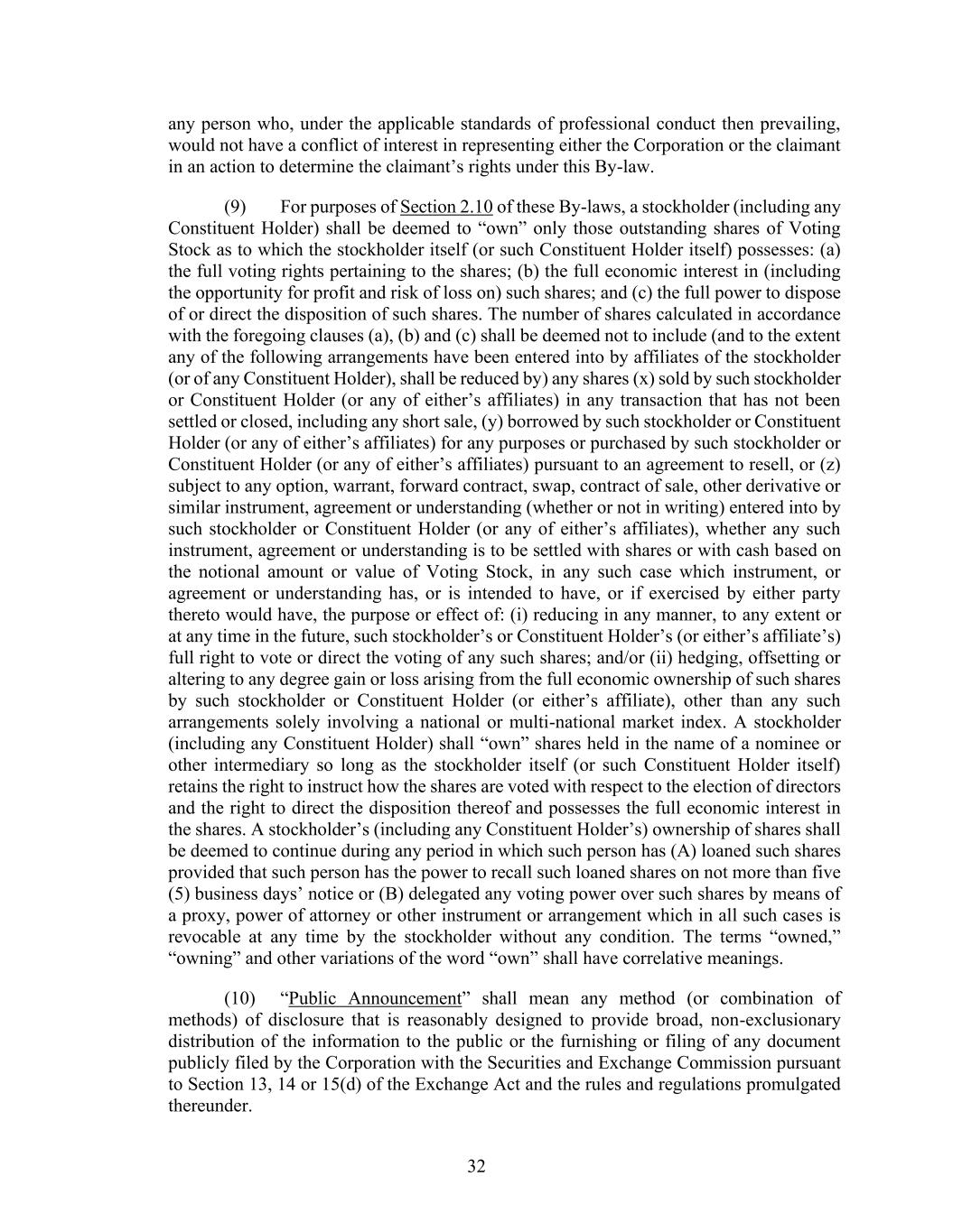 32 any person who, under the applicable standards of professional conduct then prevailing, would not have a conflict of interest in representing either the Corporation or the claimant in an action to determine the claimant’s rights under this By-law. (9) For purposes of Section 2.10 of these By-laws, a stockholder (including any Constituent Holder) shall be deemed to “own” only those outstanding shares of Voting Stock as to which the stockholder itself (or such Constituent Holder itself) possesses: (a) the full voting rights pertaining to the shares; (b) the full economic interest in (including the opportunity for profit and risk of loss on) such shares; and (c) the full power to dispose of or direct the disposition of such shares. The number of shares calculated in accordance with the foregoing clauses (a), (b) and (c) shall be deemed not to include (and to the extent any of the following arrangements have been entered into by affiliates of the stockholder (or of any Constituent Holder), shall be reduced by) any shares (x) sold by such stockholder or Constituent Holder (or any of either’s affiliates) in any transaction that has not been settled or closed, including any short sale, (y) borrowed by such stockholder or Constituent Holder (or any of either’s affiliates) for any purposes or purchased by such stockholder or Constituent Holder (or any of either’s affiliates) pursuant to an agreement to resell, or (z) subject to any option, warrant, forward contract, swap, contract of sale, other derivative or similar instrument, agreement or understanding (whether or not in writing) entered into by such stockholder or Constituent Holder (or any of either’s affiliates), whether any such instrument, agreement or understanding is to be settled with shares or with cash based on the notional amount or value of Voting Stock, in any such case which instrument, or agreement or understanding has, or is intended to have, or if exercised by either party thereto would have, the purpose or effect of: (i) reducing in any manner, to any extent or at any time in the future, such stockholder’s or Constituent Holder’s (or either’s affiliate’s) full right to vote or direct the voting of any such shares; and/or (ii) hedging, offsetting or altering to any degree gain or loss arising from the full economic ownership of such shares by such stockholder or Constituent Holder (or either’s affiliate), other than any such arrangements solely involving a national or multi-national market index. A stockholder (including any Constituent Holder) shall “own” shares held in the name of a nominee or other intermediary so long as the stockholder itself (or such Constituent Holder itself) retains the right to instruct how the shares are voted with respect to the election of directors and the right to direct the disposition thereof and possesses the full economic interest in the shares. A stockholder’s (including any Constituent Holder’s) ownership of shares shall be deemed to continue during any period in which such person has (A) loaned such shares provided that such person has the power to recall such loaned shares on not more than five (5) business days’ notice or (B) delegated any voting power over such shares by means of a proxy, power of attorney or other instrument or arrangement which in all such cases is revocable at any time by the stockholder without any condition. The terms “owned,” “owning” and other variations of the word “own” shall have correlative meanings. (10) “Public Announcement” shall mean any method (or combination of methods) of disclosure that is reasonably designed to provide broad, non-exclusionary distribution of the information to the public or the furnishing or filing of any document publicly filed by the Corporation with the Securities and Exchange Commission pursuant to Section 13, 14 or 15(d) of the Exchange Act and the rules and regulations promulgated thereunder.