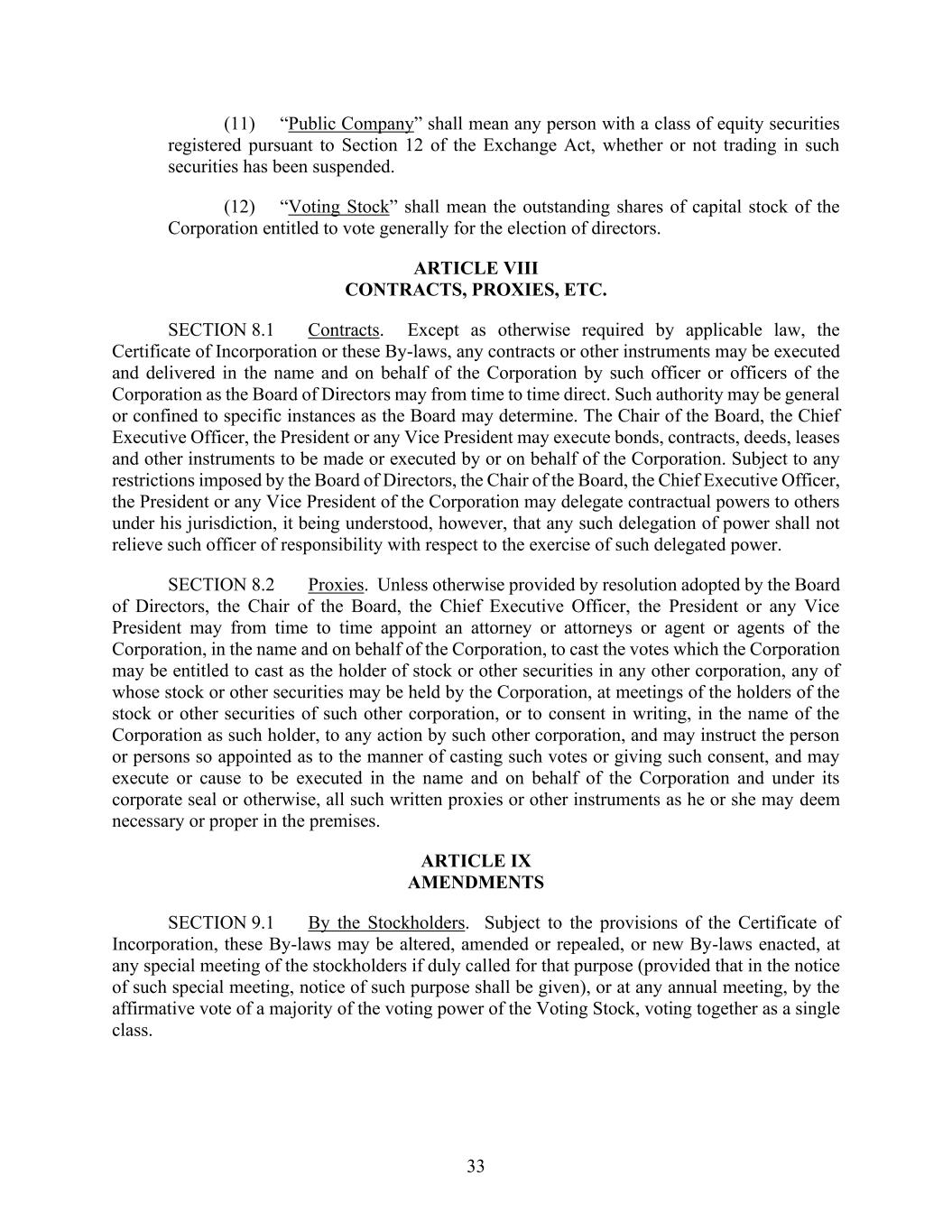 33 (11) “Public Company” shall mean any person with a class of equity securities registered pursuant to Section 12 of the Exchange Act, whether or not trading in such securities has been suspended. (12) “Voting Stock” shall mean the outstanding shares of capital stock of the Corporation entitled to vote generally for the election of directors. ARTICLE VIII CONTRACTS, PROXIES, ETC. SECTION 8.1 Contracts. Except as otherwise required by applicable law, the Certificate of Incorporation or these By-laws, any contracts or other instruments may be executed and delivered in the name and on behalf of the Corporation by such officer or officers of the Corporation as the Board of Directors may from time to time direct. Such authority may be general or confined to specific instances as the Board may determine. The Chair of the Board, the Chief Executive Officer, the President or any Vice President may execute bonds, contracts, deeds, leases and other instruments to be made or executed by or on behalf of the Corporation. Subject to any restrictions imposed by the Board of Directors, the Chair of the Board, the Chief Executive Officer, the President or any Vice President of the Corporation may delegate contractual powers to others under his jurisdiction, it being understood, however, that any such delegation of power shall not relieve such officer of responsibility with respect to the exercise of such delegated power. SECTION 8.2 Proxies. Unless otherwise provided by resolution adopted by the Board of Directors, the Chair of the Board, the Chief Executive Officer, the President or any Vice President may from time to time appoint an attorney or attorneys or agent or agents of the Corporation, in the name and on behalf of the Corporation, to cast the votes which the Corporation may be entitled to cast as the holder of stock or other securities in any other corporation, any of whose stock or other securities may be held by the Corporation, at meetings of the holders of the stock or other securities of such other corporation, or to consent in writing, in the name of the Corporation as such holder, to any action by such other corporation, and may instruct the person or persons so appointed as to the manner of casting such votes or giving such consent, and may execute or cause to be executed in the name and on behalf of the Corporation and under its corporate seal or otherwise, all such written proxies or other instruments as he or she may deem necessary or proper in the premises. ARTICLE IX AMENDMENTS SECTION 9.1 By the Stockholders. Subject to the provisions of the Certificate of Incorporation, these By-laws may be altered, amended or repealed, or new By-laws enacted, at any special meeting of the stockholders if duly called for that purpose (provided that in the notice of such special meeting, notice of such purpose shall be given), or at any annual meeting, by the affirmative vote of a majority of the voting power of the Voting Stock, voting together as a single class.