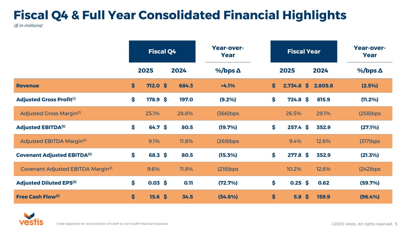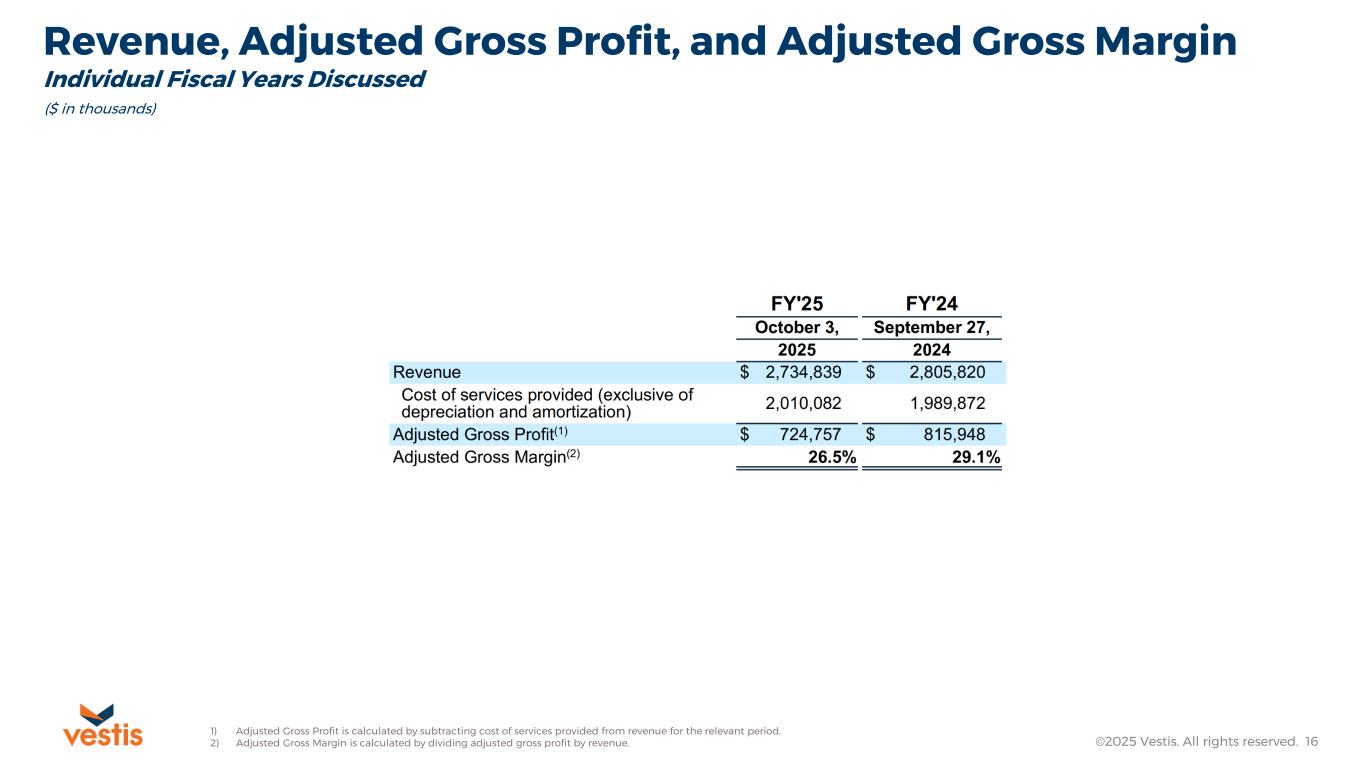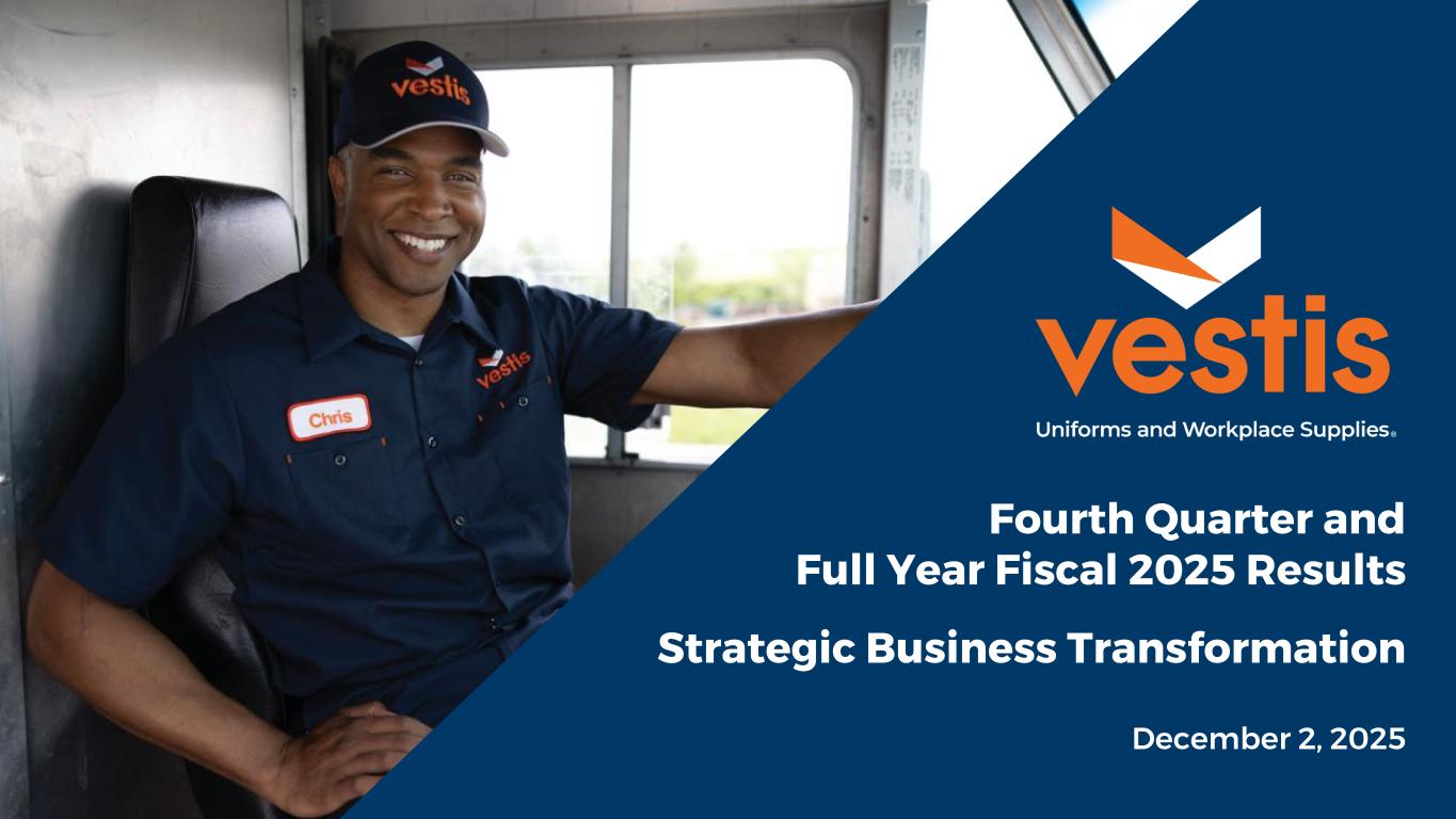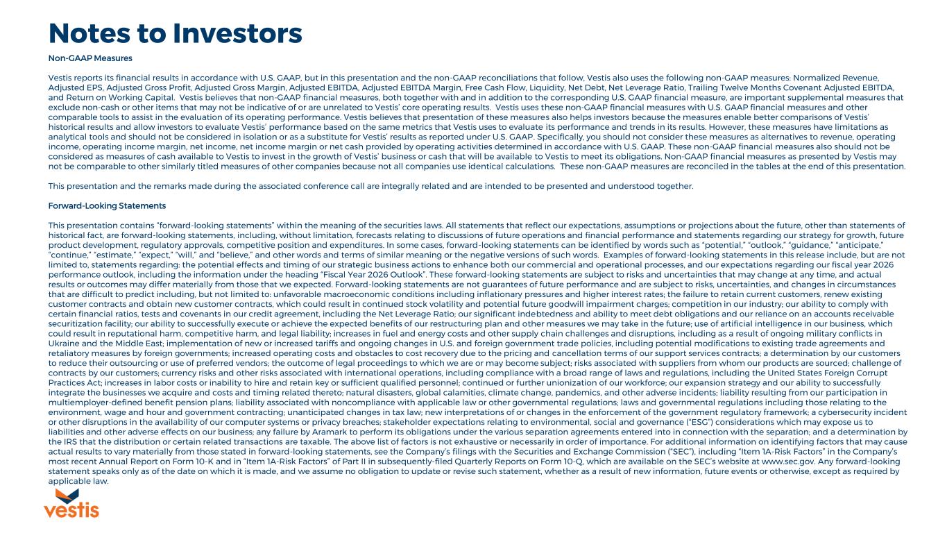 Non-GAAP Measures Vestis reports its financial results in accordance with U.S. GAAP, but in this presentation and the non-GAAP reconciliations that follow, Vestis also uses the following non-GAAP measures: Normalized Revenue, Adjusted EPS, Adjusted Gross Profit, Adjusted Gross Margin, Adjusted EBITDA, Adjusted EBITDA Margin, Free Cash Flow, Liquidity, Net Debt, Net Leverage Ratio, Trailing Twelve Months Covenant Adjusted EBITDA, and Return on Working Capital. Vestis believes that non-GAAP financial measures, both together with and in addition to the corresponding U.S. GAAP financial measure, are important supplemental measures that exclude non-cash or other items that may not be indicative of or are unrelated to Vestis’ core operating results. Vestis uses these non-GAAP financial measures with U.S. GAAP financial measures and other comparable tools to assist in the evaluation of its operating performance. Vestis believes that presentation of these measures also helps investors because the measures enable better comparisons of Vestis’ historical results and allow investors to evaluate Vestis’ performance based on the same metrics that Vestis uses to evaluate its performance and trends in its results. However, these measures have limitations as analytical tools and should not be considered in isolation or as a substitute for Vestis’ results as reported under U.S. GAAP. Specifically, you should not consider these measures as alternatives to revenue, operating income, operating income margin, net income, net income margin or net cash provided by operating activities determined in accordance with U.S. GAAP. These non-GAAP financial measures also should not be considered as measures of cash available to Vestis to invest in the growth of Vestis’ business or cash that will be available to Vestis to meet its obligations. Non-GAAP financial measures as presented by Vestis may not be comparable to other similarly titled measures of other companies because not all companies use identical calculations. These non-GAAP measures are reconciled in the tables at the end of this presentation. This presentation and the remarks made during the associated conference call are integrally related and are intended to be presented and understood together. Forward-Looking Statements This presentation contains “forward-looking statements” within the meaning of the securities laws. All statements that reflect our expectations, assumptions or projections about the future, other than statements of historical fact, are forward-looking statements, including, without limitation, forecasts relating to discussions of future operations and financial performance and statements regarding our strategy for growth, future product development, regulatory approvals, competitive position and expenditures. In some cases, forward-looking statements can be identified by words such as “potential,” “outlook,” “guidance,” “anticipate,” “continue,” “estimate,” “expect,” “will,” and “believe,” and other words and terms of similar meaning or the negative versions of such words. Examples of forward-looking statements in this release include, but are not limited to, statements regarding: the potential effects and timing of our strategic business actions to enhance both our commercial and operational processes, and our expectations regarding our fiscal year 2026 performance outlook, including the information under the heading “Fiscal Year 2026 Outlook”. These forward-looking statements are subject to risks and uncertainties that may change at any time, and actual results or outcomes may differ materially from those that we expected. Forward-looking statements are not guarantees of future performance and are subject to risks, uncertainties, and changes in circumstances that are difficult to predict including, but not limited to: unfavorable macroeconomic conditions including inflationary pressures and higher interest rates; the failure to retain current customers, renew existing customer contracts and obtain new customer contracts, which could result in continued stock volatility and potential future goodwill impairment charges; competition in our industry; our ability to comply with certain financial ratios, tests and covenants in our credit agreement, including the Net Leverage Ratio; our significant indebtedness and ability to meet debt obligations and our reliance on an accounts receivable securitization facility; our ability to successfully execute or achieve the expected benefits of our restructuring plan and other measures we may take in the future; use of artificial intelligence in our business, which could result in reputational harm, competitive harm, and legal liability; increases in fuel and energy costs and other supply chain challenges and disruptions, including as a result of ongoing military conflicts in Ukraine and the Middle East; implementation of new or increased tariffs and ongoing changes in U.S. and foreign government trade policies, including potential modifications to existing trade agreements and retaliatory measures by foreign governments; increased operating costs and obstacles to cost recovery due to the pricing and cancellation terms of our support services contracts; a determination by our customers to reduce their outsourcing or use of preferred vendors; the outcome of legal proceedings to which we are or may become subject; risks associated with suppliers from whom our products are sourced; challenge of contracts by our customers; currency risks and other risks associated with international operations, including compliance with a broad range of laws and regulations, including the United States Foreign Corrupt Practices Act; increases in labor costs or inability to hire and retain key or sufficient qualified personnel; continued or further unionization of our workforce; our expansion strategy and our ability to successfully integrate the businesses we acquire a