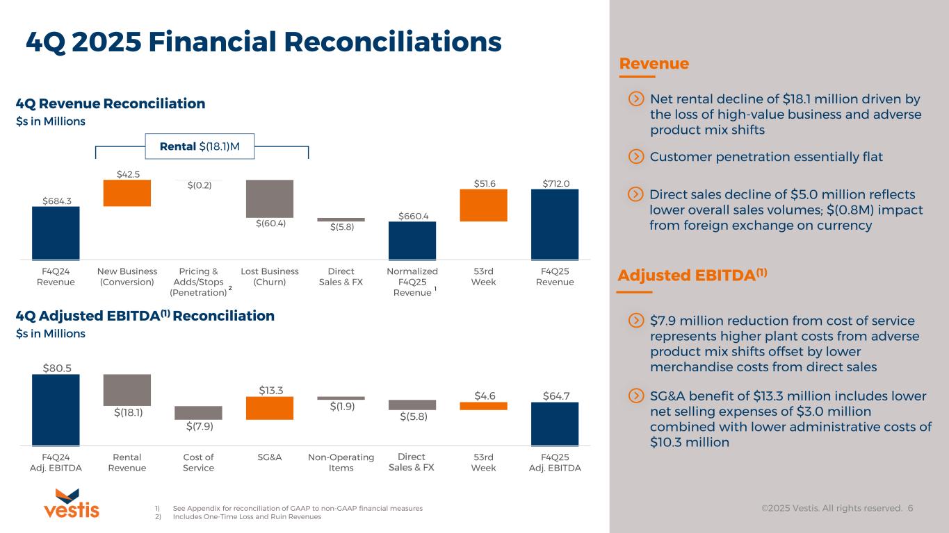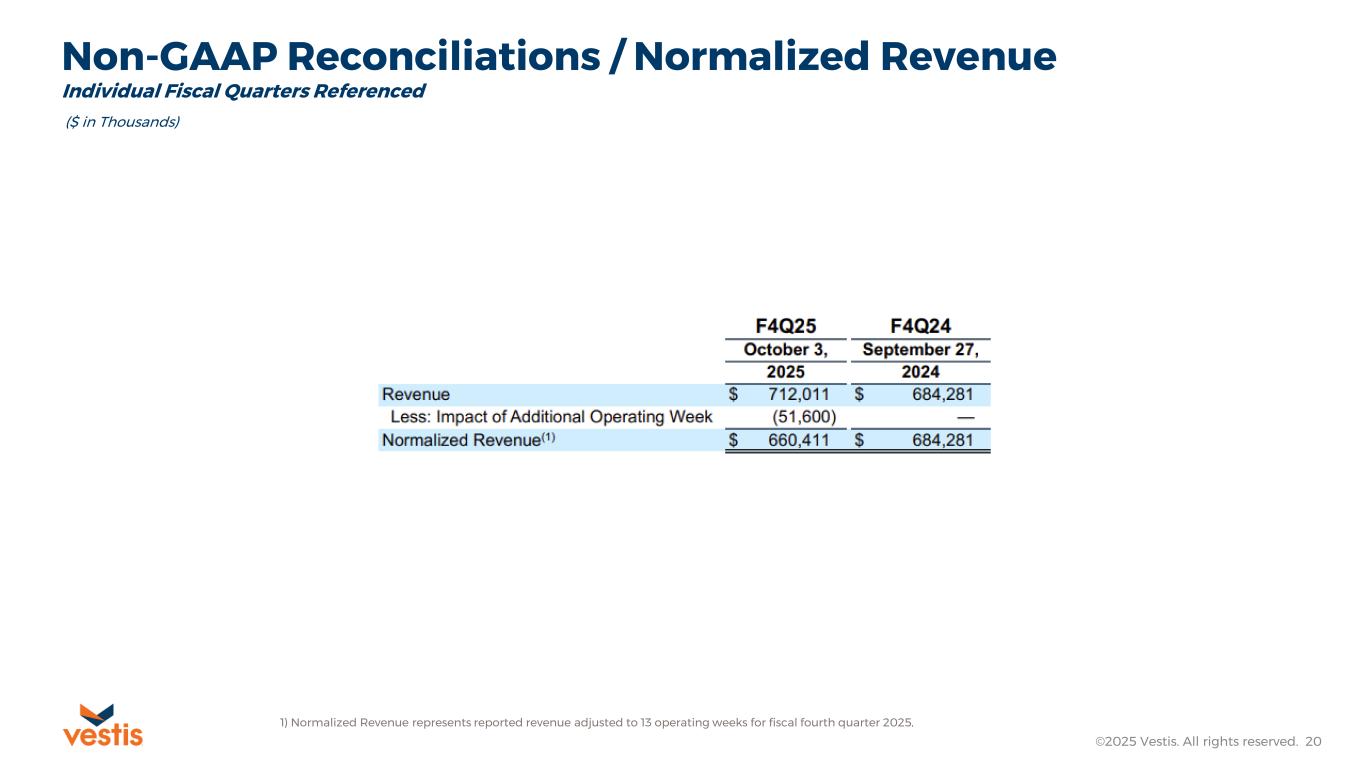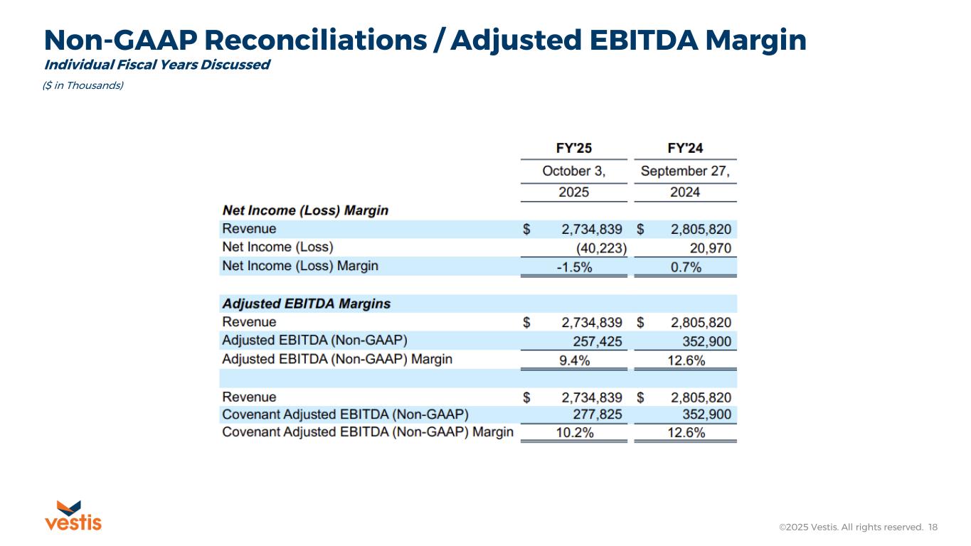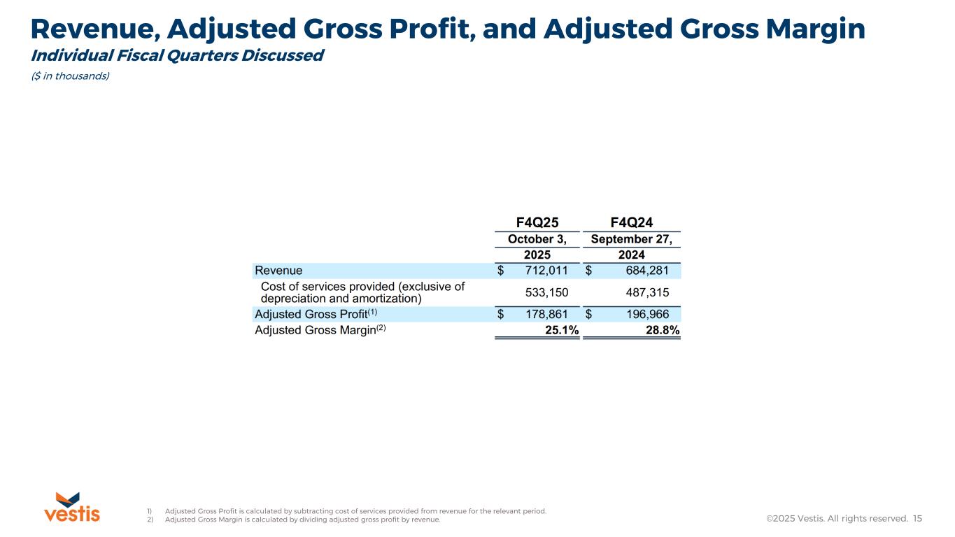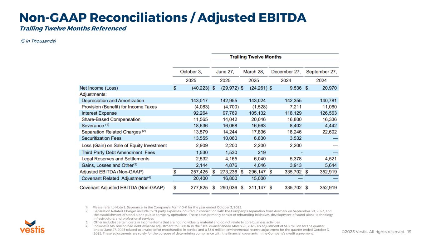 Non-GAAP Measures Vestis reports its financial results in accordance with U.S. GAAP, but in this presentation and the non-GAAP reconciliations that follow, Vestis also uses the following non-GAAP measures: Normalized Revenue, Adjusted EPS, Adjusted Gross Profit, Adjusted Gross Margin, Adjusted EBITDA, Adjusted EBITDA Margin, Free Cash Flow, Liquidity, Net Debt, Net Leverage Ratio, Trailing Twelve Months Covenant Adjusted EBITDA, and Return on Working Capital. Vestis believes that non-GAAP financial measures, both together with and in addition to the corresponding U.S. GAAP financial measure, are important supplemental measures that exclude non-cash or other items that may not be indicative of or are unrelated to Vestis’ core operating results. Vestis uses these non-GAAP financial measures with U.S. GAAP financial measures and other comparable tools to assist in the evaluation of its operating performance. Vestis believes that presentation of these measures also helps investors because the measures enable better comparisons of Vestis’ historical results and allow investors to evaluate Vestis’ performance based on the same metrics that Vestis uses to evaluate its performance and trends in its results. However, these measures have limitations as analytical tools and should not be considered in isolation or as a substitute for Vestis’ results as reported under U.S. GAAP. Specifically, you should not consider these measures as alternatives to revenue, operating income, operating income margin, net income, net income margin or net cash provided by operating activities determined in accordance with U.S. GAAP. These non-GAAP financial measures also should not be considered as measures of cash available to Vestis to invest in the growth of Vestis’ business or cash that will be available to Vestis to meet its obligations. Non-GAAP financial measures as presented by Vestis may not be comparable to other similarly titled measures of other companies because not all companies use identical calculations. These non-GAAP measures are reconciled in the tables at the end of this presentation. This presentation and the remarks made during the associated conference call are integrally related and are intended to be presented and understood together. Forward-Looking Statements This presentation contains “forward-looking statements” within the meaning of the securities laws. All statements that reflect our expectations, assumptions or projections about the future, other than statements of historical fact, are forward-looking statements, including, without limitation, forecasts relating to discussions of future operations and financial performance and statements regarding our strategy for growth, future product development, regulatory approvals, competitive position and expenditures. In some cases, forward-looking statements can be identified by words such as “potential,” “outlook,” “guidance,” “anticipate,” “continue,” “estimate,” “expect,” “will,” and “believe,” and other words and terms of similar meaning or the negative versions of such words. Examples of forward-looking statements in this release include, but are not limited to, statements regarding: the potential effects and timing of our strategic business actions to enhance both our commercial and operational processes, and our expectations regarding our fiscal year 2026 performance outlook, including the information under the heading “Fiscal Year 2026 Outlook”. These forward-looking statements are subject to risks and uncertainties that may change at any time, and actual results or outcomes may differ materially from those that we expected. Forward-looking statements are not guarantees of future performance and are subject to risks, uncertainties, and changes in circumstances that are difficult to predict including, but not limited to: unfavorable macroeconomic conditions including inflationary pressures and higher interest rates; the failure to retain current customers, renew existing customer contracts and obtain new customer contracts, which could result in continued stock volatility and potential future goodwill impairment charges; competition in our industry; our ability to comply with certain financial ratios, tests and covenants in our credit agreement, including the Net Leverage Ratio; our significant indebtedness and ability to meet debt obligations and our reliance on an accounts receivable securitization facility; our ability to successfully execute or achieve the expected benefits of our restructuring plan and other measures we may take in the future; use of artificial intelligence in our business, which could result in reputational harm, competitive harm, and legal liability; increases in fuel and energy costs and other supply chain challenges and disruptions, including as a result of ongoing military conflicts in Ukraine and the Middle East; implementation of new or increased tariffs and ongoing changes in U.S. and foreign government trade policies, including potential modifications to existing trade agreements and retaliatory measures by foreign governments; increased operating costs and obstacles to cost recovery due to the pricing and cancellation terms of our support services contracts; a determination by our customers to reduce their outsourcing or use of preferred vendors; the outcome of legal proceedings to which we are or may become subject; risks associated with suppliers from whom our products are sourced; challenge of contracts by our customers; currency risks and other risks associated with international operations, including compliance with a broad range of laws and regulations, including the United States Foreign Corrupt Practices Act; increases in labor costs or inability to hire and retain key or sufficient qualified personnel; continued or further unionization of our workforce; our expansion strategy and our ability to successfully integrate the businesses we acquire a