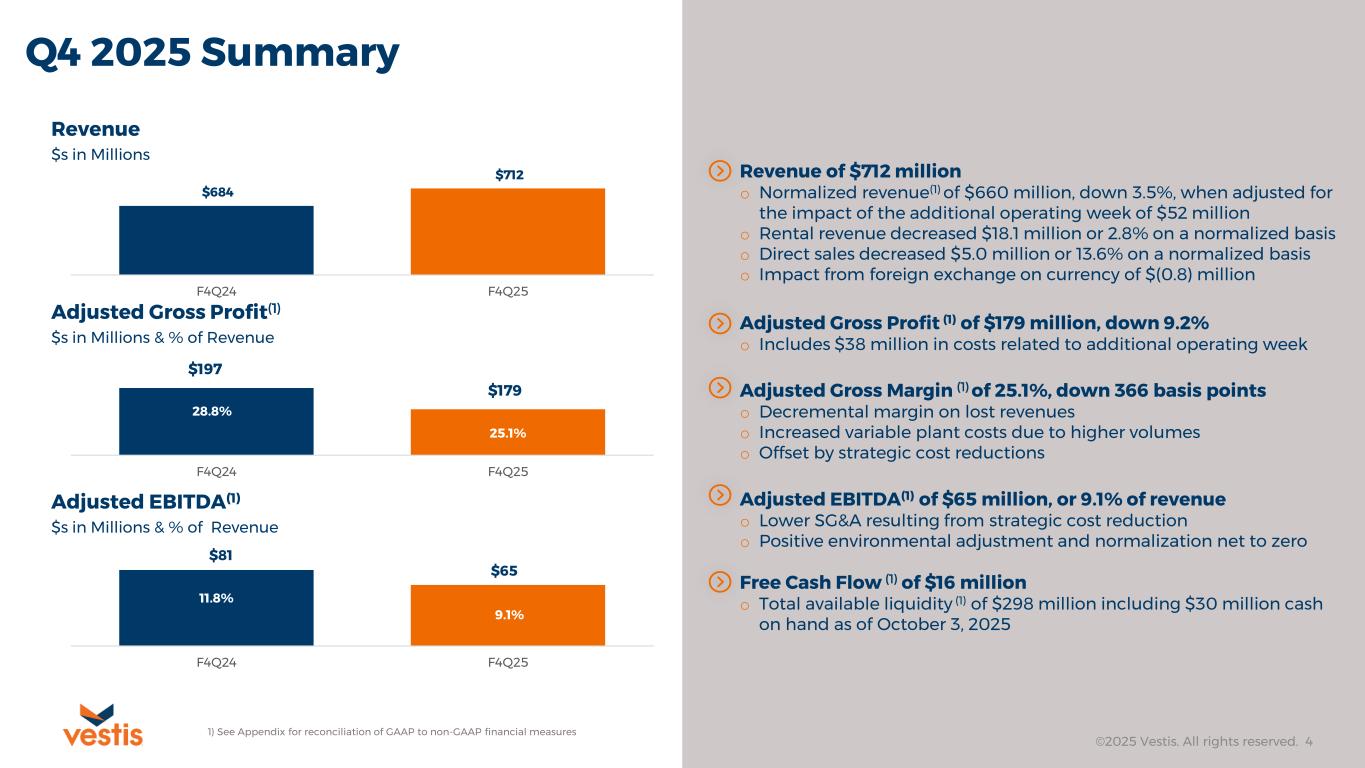 Executive Summary ©2025 Vestis. All rights reserved. 3 ▶ Revenue of $2.7 billion ▶ Net loss of $40 million ▶ Adjusted EBITDA(1) of $257 million ▶ Covenant Adjusted EBITDA(1) of $278 million ▶ Liquidity(1) of $298 million as of October 3, 2025 Full Year 2025 Results and Strategic Business Transformation Ended fiscal 2025 in a good position to advance our strategic priorities Launching a formal multi-year strategic business transformation ▶ Three pillars: Commercial Excellence, Operational Excellence, Asset & Network Optimization ▶ Anticipated to generate annual cost savings of $75 million by end of fiscal 2026 ▶ Developed with leading third-party advisors Reported Q4’25 operating cash flow of $31 million ▶ Free cash flow(1) of $16 million ▶ Invested $15 million in property and equipment ▶ Net leverage ratio(1,2) 4.72x, adequate cushion Issuing Fiscal Year 2026 Outlook ▶ Revenue flat to down 2% versus normalized FY 2025 revenue ▶ Adjusted EBITDA (1) in the range of $285 million to $315 million ▶ Free cash flow (1) in the range of $50 million to $60 million ▶ Quarterly sequential Adjusted EBITDA (1) growth of ~5% starting with Q2’26; Q1’26 ~7% to 10% increase over Q4’25 1) See Appendix for reconciliation of GAAP to non-GAAP financial measures 2) As defined under the Company’s Credit Agreement