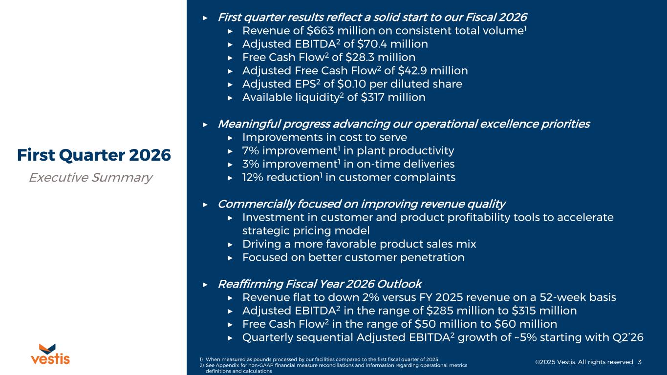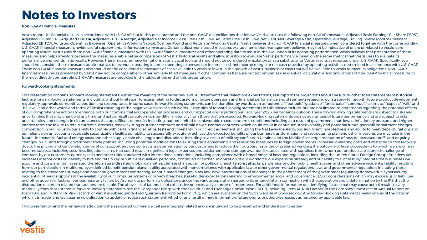 Non-GAAP Financial Measures Vestis reports its financial results in accordance with U.S. GAAP, but in this presentation and the non-GAAP reconciliations that follow, Vestis also uses the following non-GAAP measures: Adjusted Basic Earnings Per Share (“EPS”), Adjusted Diluted EPS, Adjusted EBITDA, Adjusted EBITDA Margin, Adjusted Net Income (Loss), Free Cash Flow, Adjusted Free Cash Flow, Net Debt, Net Leverage Ratio, Operating Leverage, Trailing Twelve Months Covenant Adjusted EBITDA, Adjusted Operating Expenses, Operating Working Capital, Cost per Pound and Return on Working Capital. Vestis believes that non-GAAP financial measures, when considered together with the corresponding U.S. GAAP financial measure, provide useful supplemental information to investors. Certain adjustment-based measures exclude items that management believes may not be indicative of or are unrelated to Vestis’ core operating results. Vestis uses these non-GAAP financial measures with U.S. GAAP financial measures and other operating data to assist in the evaluation of its operating performance. Vestis believes that presentation of these measures also helps investors because the measures enable better comparisons of Vestis’ historical results and allow investors to evaluate Vestis’ performance based on the same metrics that Vestis uses to evaluate its performance and trends in its results. However, these measures have limitations as analytical tools and should not be considered in isolation or as a substitute for Vestis’ results as reported under U.S. GAAP. Specifically, you should not consider these measures as alternatives to revenue, operating income, operating expenses, net income (loss), net income margin or net cash provided by operating activities determined in accordance with U.S. GAAP. These non-GAAP financial measures also should not be considered as measures of cash available to Vestis to invest in the growth of Vestis’ business or cash that will be available to Vestis to meet its obligations. Non-GAAP financial measures as presented by Vestis may not be comparable to other similarly titled measures of other companies because not all companies use identical calculations. Reconciliations of non-GAAP financial measures to the most directly comparable U.S. GAAP measures are provided in the tables at the end of this presentation. Forward-Looking Statements This presentation contains “forward-looking statements” within the meaning of the securities laws. All statements that reflect our expectations, assumptions or projections about the future, other than statements of historical fact, are forward-looking statements, including, without limitation, forecasts relating to discussions of future operations and financial performance and statements regarding our strategy for growth, future product development, regulatory approvals, competitive position and expenditures. In some cases, forward-looking statements can be identified by words such as “potential,” “outlook,” “guidance,” “anticipate,” “continue,” “estimate,” “expect,” “will,” and “believe,” and other words and terms of similar meaning or the negative versions of such words. Examples of forward-looking statements in this release include, but are not limited to, statements regarding: the potential effects of our comprehensive actions to enhance both our commercial and operational processes, and our expectations regarding our fiscal year 2026 performance outlook. These forward-looking statements are subject to risks and uncertainties that may change at any time, and actual results or outcomes may differ materially from those that we expected. Forward-looking statements are not guarantees of future performance and are subject to risks, uncertainties, and changes in circumstances that are difficult to predict including, but not limited to: unfavorable macroeconomic conditions including as a result of government shutdowns, inflationary pressures and higher interest rates; the failure to retain current customers, renew existing customer contracts and obtain new customer contracts, which could result in continued stock volatility and potential future goodwill impairment charges; competition in our industry; our ability to comply with certain financial ratios, tests and covenants in our credit agreement, including the Net Leverage Ratio; our significant indebtedness and ability to meet debt obligations and our reliance on an accounts receivable securitization facility; our ability to successfully execute or achieve the expected benefits of our business transformation and restructuring plan and other measures we may take in the future; increases in fuel and energy costs and other supply chain challenges and disruptions, including as a result of military conflicts in Ukraine and the Middle East; implementation of new or increased tariffs and ongoing changes in U.S. and foreign government trade policies, including potential modifications to existing trade agreements and retaliatory measures by foreign governments; increased operating costs and obstacles to cost recovery due to the pricing and cancellation terms of our support services contracts; a determination by our customers to reduce their outsourcing or use of preferred vendors; the outcome of legal proceedings to which we are or may become subject, including securities litigation claims that could result in significant legal expenses and settlement and damage awards; risks associated with suppliers from whom our products are sourced; challenge of contracts by our customers; currency risks and other risks associated with international operations, including compliance with a broad range of laws and regulations, including the United States Foreign Corrupt Practices Act; increases in labor costs or inability to hire and retain key or sufficient qualified personnel; continued or further unionization of our workforce; our expansion strategy and our ability to succe