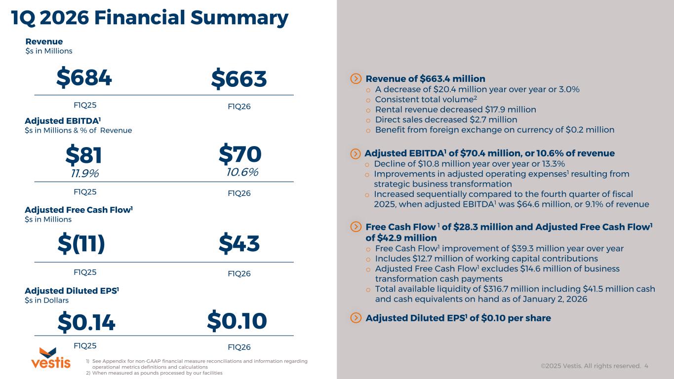First Quarter 2026 Executive Summary ©2025 Vestis. All rights reserved. 3 ▶ First quarter results reflect a solid start to our Fiscal 2026 ▶ Revenue of $663 million on consistent total volume1 ▶ Adjusted EBITDA2 of $70.4 million ▶ Free Cash Flow2 of $28.3 million ▶ Adjusted Free Cash Flow2 of $42.9 million ▶ Adjusted EPS2 of $0.10 per diluted share ▶ Available liquidity2 of $317 million ▶ Meaningful progress advancing our operational excellence priorities ▶ Improvements in cost to serve ▶ 7% improvement1 in plant productivity ▶ 3% improvement1 in on-time deliveries ▶ 12% reduction1 in customer complaints ▶ Commercially focused on improving revenue quality ▶ Investment in customer and product profitability tools to accelerate strategic pricing model ▶ Driving a more favorable product sales mix ▶ Focused on better customer penetration ▶ Reaffirming Fiscal Year 2026 Outlook ▶ Revenue flat to down 2% versus FY 2025 revenue on a 52-week basis ▶ Adjusted EBITDA2 in the range of $285 million to $315 million ▶ Free Cash Flow2 in the range of $50 million to $60 million ▶ Quarterly sequential Adjusted EBITDA2 growth of ~5% starting with Q2’26 1) When measured as pounds processed by our facilities compared to the first fiscal quarter of 2025 2) See Appendix for non-GAAP financial measure reconciliations and information regarding operational metrics definitions and calculations